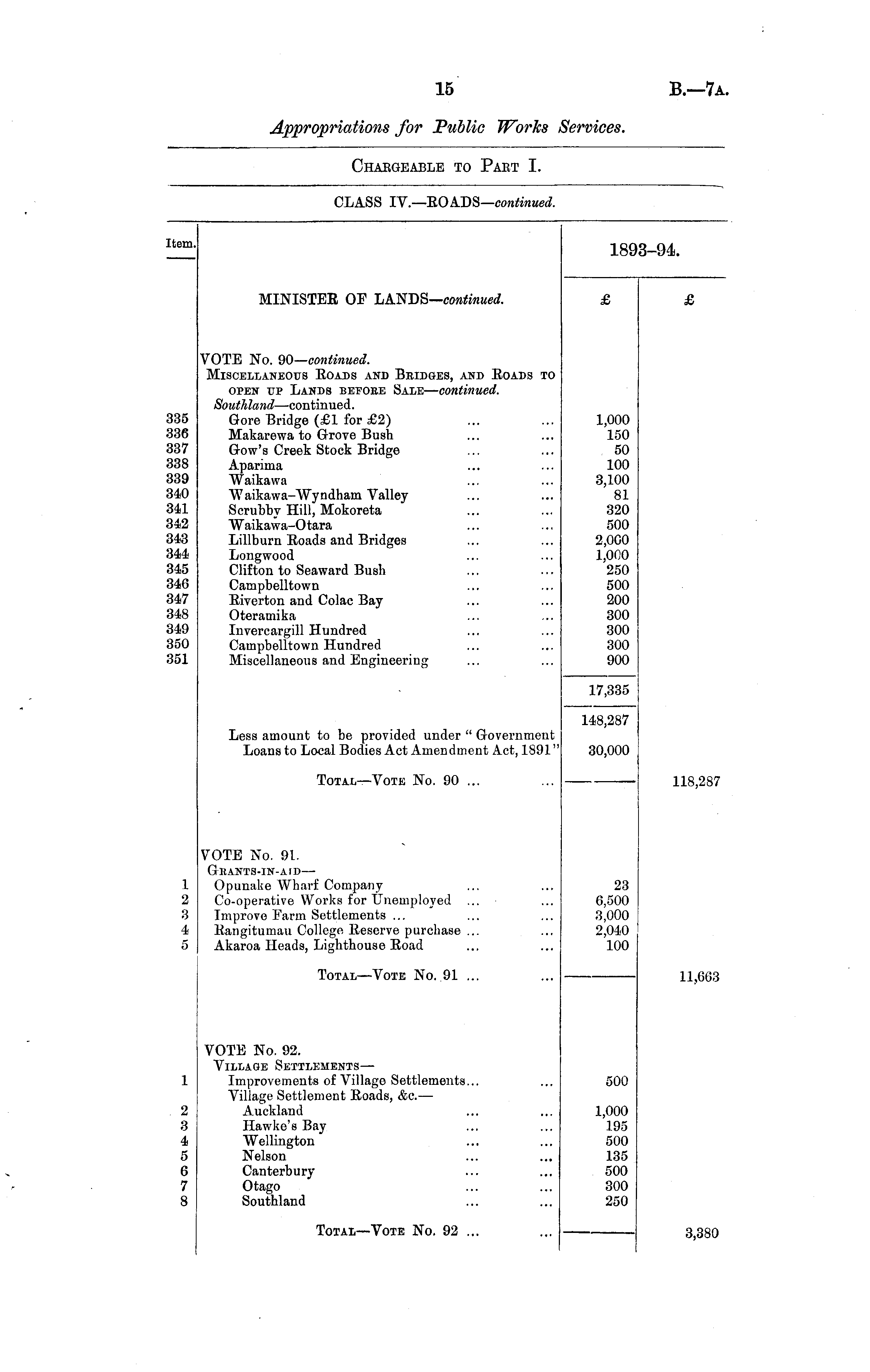 :tem. 189 1-94. MINISTEE OF LANDS— continued. 135 136 137 !38 139 140 141 142 143 !44 145 146 147 !4S 119 150 151 VOTE No. 90— continued. Miscellaneous Eoads and Beidges, and Eoads to open up Lands befoee Sale— continued. Southland —continued. Gore Bridge (£1 for £2) Makarewa to Grove Bush Gow's Creek Stock Bridge Aparima Waikawa Waikawa-Wyndham Valley Scrubby Hill, Mokoreta Waikawa-0 tara Lillburn Eoads and Bridges Longwood Clifton to Seaward Bush Campbelltown Eiverton and Colac Bay Oteramika Invercargill Hundred Campbelltown Hundred Miscellaneous and Engineering 1,000 150 50 100 3,100 81 320 500 2,000 1,000 250 500 200 300 300 300 900 17,335 Less amount to be provided under " Government Loans to Local Bodies Act Amendment Act, 1891" 148,287 30,000 Total—Vote No. 90 ... 118,287 L 2 3 4 5 VOTE No. 91. Gkants-in-aid— Opunake Wharf Company Co-operative Works for Unemployed ... Improve Farm Settlements ... Eangitumau College Eeserve purchase ... Akaroa Heads, Lighthouse Eoad 23 6,500 3,000 2,040 100 Total—Vote No. 91 ... 11,603 1 2 3 4 5 6 7 8 VOTE No. 92. Village Settlements — Improvements of Village Settlements... Village Settlement Eoads, &c.— Auckland Hawke's Bay Wellington Nelson Canterbury Otago Southland 500 1,000 195 500 135 500 300 250 Totai—Vote No. 92 ...