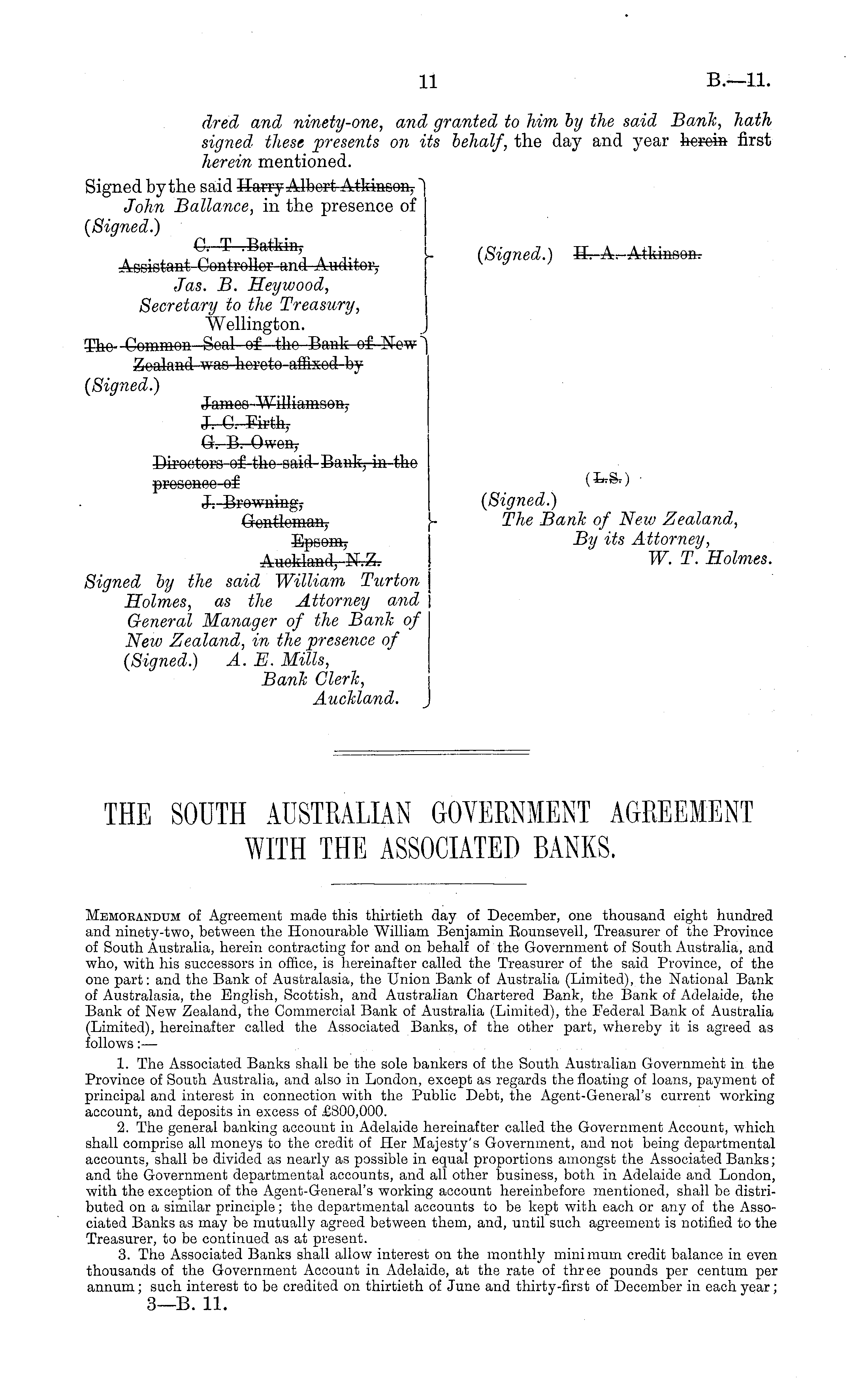 Memorandum of Agreement made this thirtieth day of December, one thousand eight hundred and ninety-two, between the Honourable William Benjamin Bounsevell, Treasurer of the Province of South Australia, herein contracting for and on behalf of the Government of South Australia, and who, with his successors in office, is hereinafter called the Treasurer of the said Province, of the one part: and the Bank of Australasia, the Union Bank of Australia (Limited), the National Bank of Australasia, the English, Scottish, and Australian Chartered Bank, the Bank of Adelaide, the Bank of New Zealand, the Commercial Bank of Australia (Limited), the Federal Bank of Australia (Limited), hereinafter called the Associated Banks, of the other part, whereby it is agreed as follows: — 1. The Associated Banks shall be the sole bankers of the South Australian Government in the Province of South Australia, and also in London, except as regards the floating of loans, payment of principal and interest in connection with the Public Debt, the Agent-General's current working account, and deposits in excess of £800,000. 2. The general banking account in Adelaide hereinafter called the Government Account, which shall comprise all moneys to the credit of Her Majesty's Government, and not being departmental accounts, shall be divided as nearly as possible in equal proportions amongst the Associated Banks; and the Government departmental accounts, and all other business, both in Adelaide and London, with the exception of the Agent-General's working account hereinbefore mentioned, shall be distributed on a similar principle; the departmental accounts to be kept with each or any of the Associated Banks as may be mutually agreed between them, and, until such agreement is notified to the Treasurer, to be continued as at present. 3. The Associated Banks shall allow interest on the monthly minimum credit balance in even thousands of the Government Account in Adelaide, at the rate of three pounds per centum per annum; such interest to be credited on thirtieth of June and thirty-first of December in each year; 3—B. 11.