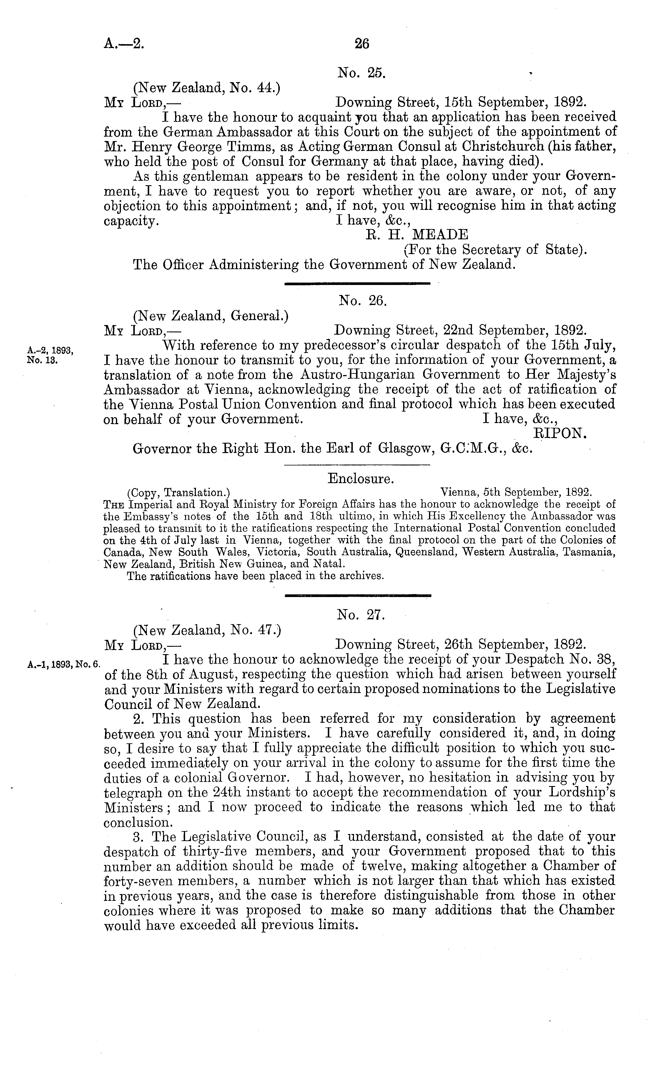 No. 26. (New Zealand, General.) My Lobd, — Downing Street, 22nd September, 1892. With reference to my predecessor's circular despatch of the 15th July, I have the honour to transmit to you, for the information of your Government, a translation of a note from the Austro-Hungarian Government to Her Majesty's Ambassador at Vienna, acknowledging the receipt of the act of ratification of the Vienna Postal Union Convention and final protocol which has been executed on behalf of your Government. I have, &c, BIPON. Governor the Eight Hon. the Earl of Glasgow, G.C.M.G., &c.