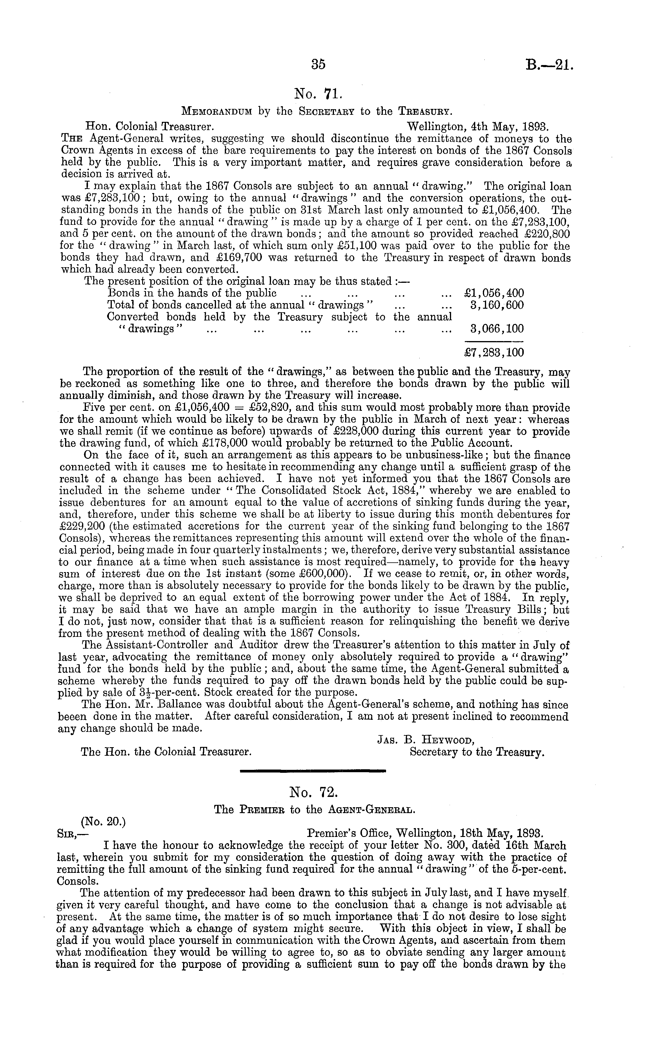 No. 71. Memorandum by the Secretary to the Treasury. Hon. Colonial Treasurer. Wellington, 4th May, 1893. The Agent-General writes, suggesting we should discontinue the remittance of moneys to the Crown Agents in excess of the bare requirements to pay the interest on bonds of the 1867 Consols held by the public. This is a very important matter, and requires grave consideration before a decision is arrived at. I may explain that the 1867 Consols are subject to an annual " drawing." The original loan was £7,283,100; but, owing to the annual " drawings " and the conversion operations, the outstanding bonds in the hands of the public on 31st March last only amounted to £1,056,400. The fund to provide for the annual " drawing " is made up by a charge of 1 per cent, on the £7,283,100, and 5 per cent, on the amount of the drawn bonds ; and the amount so provided reached £220,800 for the " drawing " in March last, of which sum only £51,100 was paid over to the public for the bonds they had drawn, and £169,700 was returned to the Treasury in respect of drawn bonds which had already been converted. The present position of the original loan may be thus stated : — Bonds in the hands of the public ... ... ... ... £1,056,400 Total of bonds cancelled at the annual " drawings " ... ... 3,160,600 Converted bonds held by the Treasury subject to the annual "drawings" ... ... ... ... ... ... 3,066,100 £7,283,100 The proportion of the result of the " drawings," as between the public and the Treasury, may be reckoned as something like one to three, and therefore the bonds drawn by the public will annually diminish, and those drawn by the Treasury will increase. Five per cent, on £1,056,400 = £52,820, and this sum would most probably more than provide for the amount which would be likely to be drawn by the public in March of next year: whereas we shall remit (if we continue as before) upwards of £228,000 during this current year to provide the drawing fund, of which £178,000 would probably be returned to the Public Account. On the face of it, such an arrangement as this appears to be unbusiness-like; but the finance connected with it causes me to hesitate in recommending any change until a sufficient grasp of the result of a change has been achieved. I have not yet informed you that the 1867 Consols are included in the scheme under "The Consolidated Stock Act, 1884," whereby we are enabled to issue debentures for an amount equal to the value of accretions of sinking funds during the year, and, therefore, under this scheme we shall be at liberty to issue during this month debentures for £229,200 (the estimated accretions for the current year of the sinking fund belonging to the 1867 Consols), whereas the remittances representing this amount will extend over the whole of the financial period, being made in four quarterly instalments ; we, therefore, derive very substantial assistance to our finance at a time when such assistance is most required—namely, to provide for the heavy sum of interest due on the Ist instant (some £600,000). If we cease to remit, or, in other words, charge, more than is absolutely necessary to provide for the bonds likely to be drawn by the public, we shall be deprived to an equal extent of the borrowing power under the Act of 1884. In reply, it may be said that we have an ample margin in tho authority to issue Treasury Bills; but I do not, just now, consider that that is a sufficient reason for relinquishing the benefit we derive from the present method of dealing with the 1867 Consols. The Assistant-Controller and Auditor drew the Treasurer's attention to this matter in July of last year, advocating the remittance of money only absolutely required to provide a " drawing" fund for the bonds held by the public; and, about the same time, the Agent-General submitted a scheme whereby the funds required to pay off the drawn bonds held by the public could be supplied by sale of 3J-per-cent. Stock created for the purpose. The Hon. Mr. Ballance was doubtful about the Agent-General's scheme, and nothing has since beeen done in the matter. After careful consideration, I am not at present inclined to recommend any change should be made. Jas. B. Heywood, The Hon. the Colonial Treasurer. Secretary to the Treasury.
