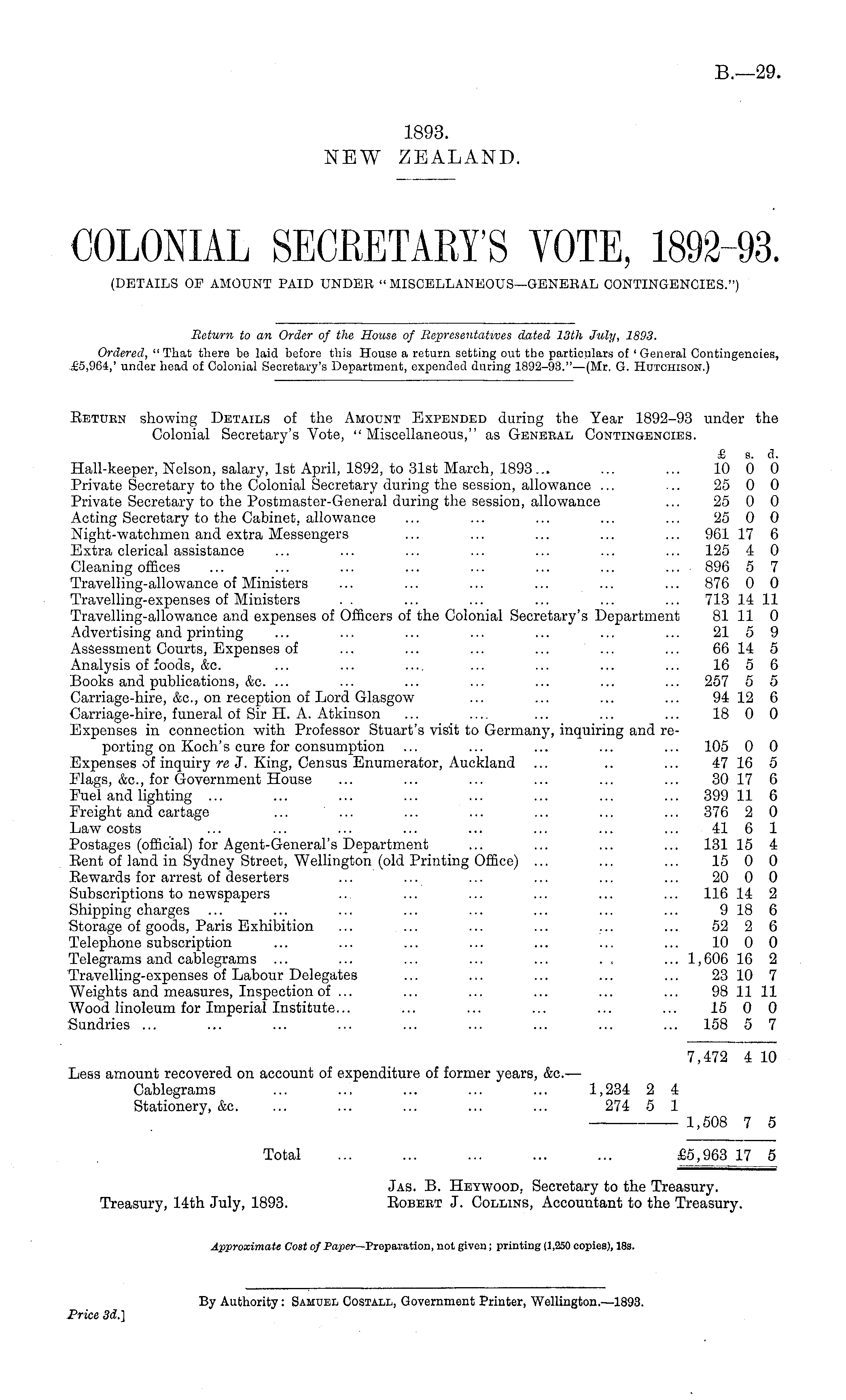 COLONIAL SECRETARY'S VOTE, 1892-93. (DETAILS OF AMOUNT PAID UNDER "MISCELLANEOUS—GENERAL CONTINGENCIES.")