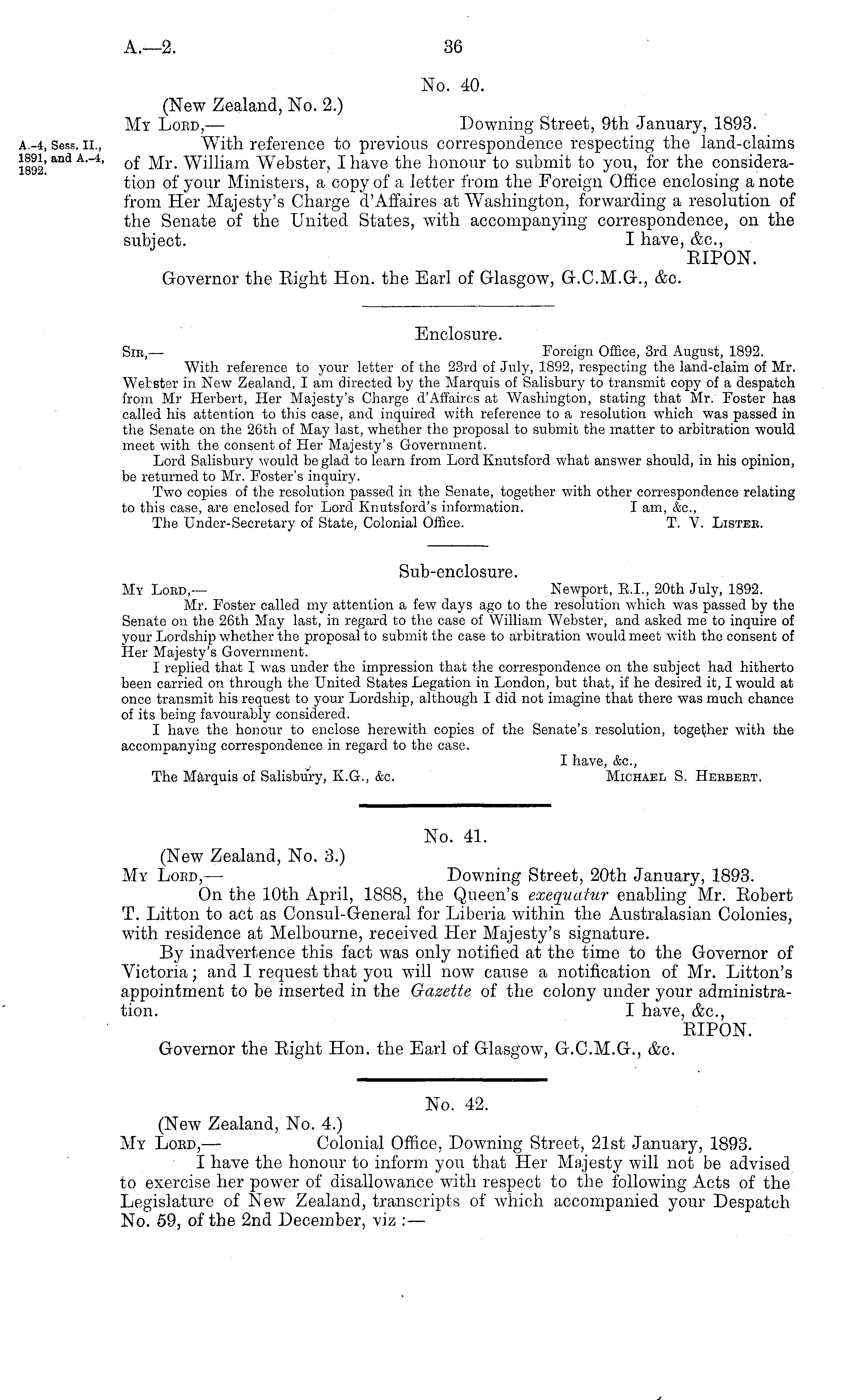 Enclosure. Sir,— Foreign Office, 3rd August, 1892. With reference to your letter of the 23rd of July, 1892, respecting the land-claim of Mr. Webster in New Zealand, I am directed by the Marquis of Salisbury to transmit copy of a despatch from Mr Herbert, Her Majesty's Charge d'Affaires at Washington, stating that Mr. Foster has called his attention to this case, and inquired with reference to a resolution which was passed in the Senate on the 26th of May last, whether the proposal to submit the matter to arbitration would meet with the consent of Her Majesty's Government. Lord Salisbury would be glad to learn from Lord Knutsford what answer should, in his opinion, be returned to Mr. Foster's inquiry. Two copies of the resolution passed in the Senate, together with other correspondence relating to this case, are enclosed for Lord Knutsford's information. I am, &c, The Under-Secretary of State, Colonial Office. T. V. Listee.