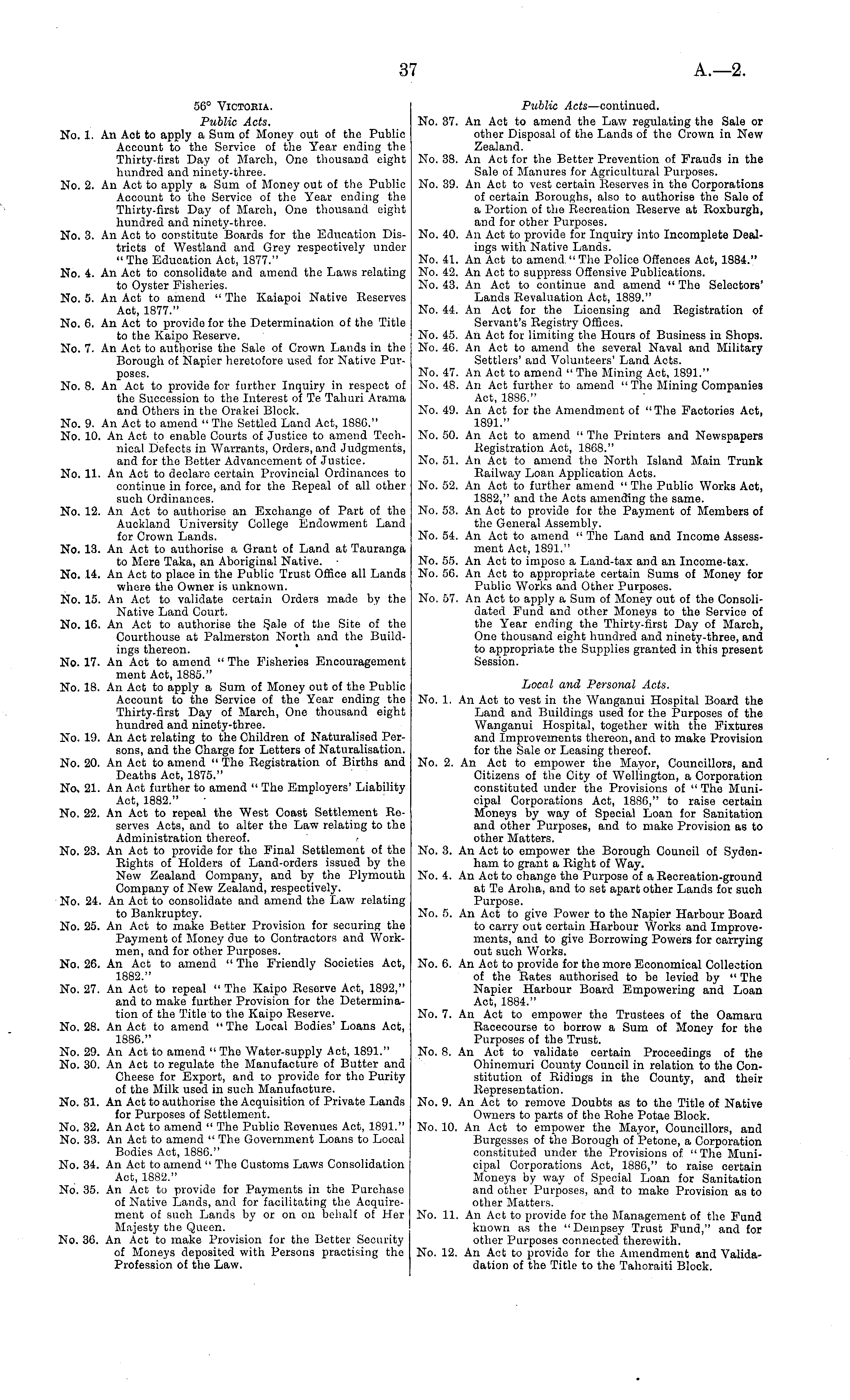 Public Acts —continued. No. 37. An Act to amend the Law regulating the Sale or other Disposal of the Lands of the Crown in New Zealand. No. 38. An Act for the Better Prevention of Frauds in the Sale of Manures for Agricultural Purposes. No. 39. An Act to vest certain Keserves in the Corporations of certain Boroughs, also to authorise the Sale of a Portion of the Recreation Reserve at Roxburgh, and for other Purposes. No. 40. An Act to provide for Inquiry into Incomplete Dealings with Native Lands. No. 41. An Act to amend " The Police Offences Act, 1884." No. 42. An Act to suppress Offensive Publications. No. 43. An Act to continue and amend " The Selectors' Lands Revaluation Act, 1889." No. 44. An Act for the Licensing and Registration of Servant's Registry Offices. No. 45. An Act for limiting the Hours of Business in Shops. No. 46. An Act to amend the several Naval and Military Settlers' and Volunteers' Land Acts. No. 47. An Act to amend " The Mining Act, 1891." No. 48. An Act further to amend "The Mining Companies Act, 1880." No. 49. An Act for the Amendment of "The Factories Act, 1891." No. 50. An Acb to amend " The Printers and Newspapers Registration Act, 1868." No. 51. An Act to amend the North Island Main Trunk Railway Loan Application Acts. No. 52. An Act to further amend " The Public Works Act, 1882," and the Acts amending the same. No. 53. An Act to provide for the Payment of Members of the General Assembly. No. 54. An Act to amend " The Land and Income Assessment Act, 1891." No. 55. An Act to impose a Land-tax and an Income-tax. No. 50. An Act to appropriate certain Sums of Money for Public Works and Other Purposes. No. 57. An Act to apply a Sum of Money out of the Consolidated Fund and other Moneys to the Service of the Year ending the Thirty-first Day of March, One thousand eight hundred and ninety-three, and to appropriate the Supplies granted in this present Session. Local and Personal Acts. No. 1. An Act to vest in the Wanganui Hospital Board the Land and Buildings used for the Purposes of the Wanganui Hospital, together with the Fixtures and Improvements thereon, and to make Provision for the Sale or Leasing thereof. No. 2. An Act to empower the Mayor, Councillors, and Citizens of the City of Wellington, a Corporation constituted under the Provisions of " The Municipal Corporations Act, 1886," to raise certain Moneys by way of Special Loan for Sanitation and other Purposes, and to make Provision as to other Matters. No. 3. An Act to empower the Borough Council of Sydenham to grant a Right of Way. No. 4. An Act to change the Purpose of a Recreation-ground at Tβ Aroha, and to set apart other Lands for such Purpose. No. 5. An Act to give Power to the Napier Harbour Board to carry out certain Harbour Works and Improvements, and to give Borrowing Powers for carrying out such Works. No. 6. An Act to provido for the more Economical Collection of the Rates authorised to be levied by " The Napier Harbour Board Empowering and Loan Act, 1884." No. 7. An Act to empower the Trustees of the Oamaru Racecourse to borrow a Sum of Money for the Purposes of the Trust. No. 8. An Act to validate certain Proceedings of the Ohinemuri County Council in relation to the Constitution of Ridings in the County, and their Representation. No. 9. An Act to remove Doubts as to the Title of Native Owners to parts of the Rohe Potae Block. No. 10. An Act to empower the Mayor, Councillors, and Burgesses of the Borough of Petone, a Corporation constituted under the Provisions of " The Municipal Corporations Act, 1886," to raise certain Moneys by way of Special Loan for Sanitation and other Purposes, and to make Provision as to other Matters. No. 11. An Act to provide for the Management of the Fund known as the "Deinpsey Trust Fund," and for other Purposes connected therewith. No. 12. An Act to provido for the Amendment and Validadation of the Title to the Tahoraiti Block.