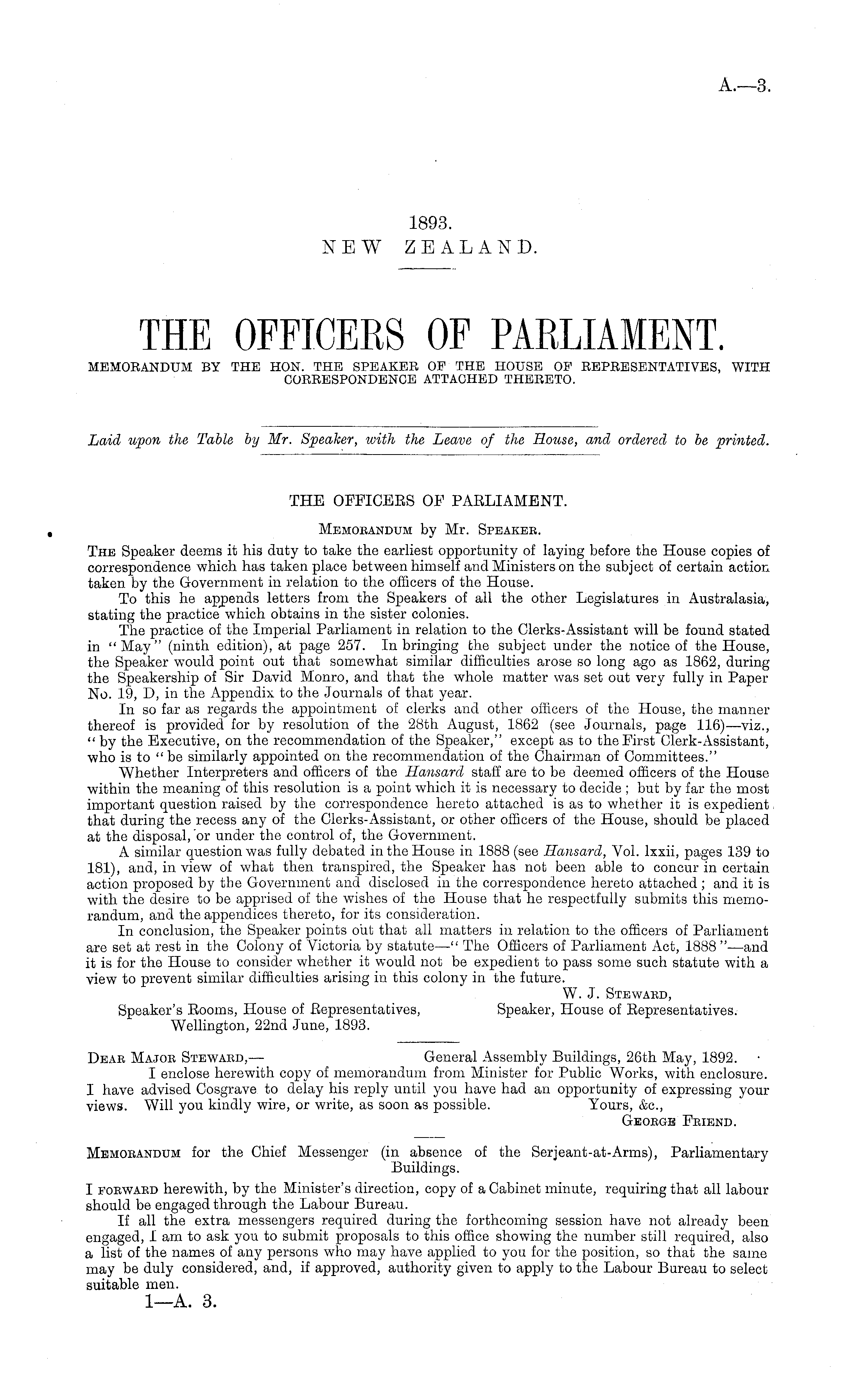 THE OFFICERS OF PAELIAMENT. Memoeandum by Mr. Speaker. The Speaker deems it his duty to take the earliest opportunity of laying before the House copies of correspondence which has taken place between himself and Ministers on the subject of certain action taken by the Government in relation to the officers of the House. To this he apjpends letters from the Speakers of all the other Legislatures in Australasia, stating the practice which obtains in the sister colonies. The practice of the Imperial Parliament in relation to the Clerks-Assistant will be found stated in "May" (ninth edition), at page 257. In bringing the subject under the notice of the House, the Speaker would point out that somewhat similar difficulties arose so long ago as 1862, during the Speakership of Sir David Monro, and that the whole matter was set out very fully in Paper No. 19, D, in the Appendix to the Journals of that year. In so far as regards the appointment of clerks and other officers of the House, the manner thereof is provided for by resolution of the 28th August, 1862 (see Journals, page 116) —viz., " by the Executive, on the recommendation of the Speaker," except as to the First Clerk-Assistant, who is to "be similarly appointed on the recommendation of the Chairman of Committees." Whether Interpreters and officers of the Hansard staff are to be deemed officers of the House within the meaning of this resolution is a point which it is necessary to decide ; but by far the most important question raised by the correspondence hereto attached is as to whether it is expedient that during the recess any of the Clerks-Assistant, or other officers of the House, should be placed at the disposal, or under the control of, the Government. A similar question was fully debated in the House in 1888 (see Hansard, Vol. lxxii, pages 139 to 181), and, in view of what then transpired, the Speaker has not been able to concur in certain action proposed by the Government and disclosed in the correspondence hereto attached; and it is with the desire to be apprised of the wishes of the House that he respectfully submits this memorandum, and the appendices thereto, for its consideration. In conclusion, the Speaker points out that all matters in relation to the officers of Parliament are set at rest in the Colony of Victoria by statute—" The Officers of Parliament Act, 1888 " —and it is for the House to consider whether it would not be expedient to pass some such statute with a view to prevent similar difficulties arising in this colony in the future. W. J. Stewaed, Speaker's Rooms, House of Representatives, Speaker, House of Representatives. Wellington, 22nd June, 1893.