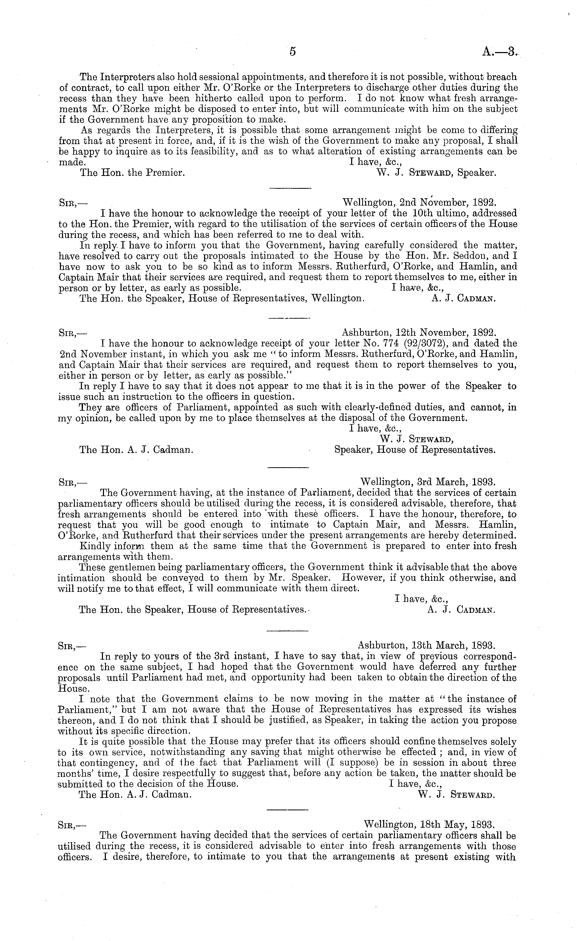 Sir,— Wellington, 3rd March, 1893. The Government having, at the instance of Parliament, decided that the services of certain parliamentary officers should be utilised during the recess, it is considered advisable, therefore, that fresh arrangements should be entered into with these officers. I have the honour, therefore, to request that you will be good enough to intimate to Captain Mair, and Messrs. Hamlin, O'Eorke, and Eutherfurd that their services under the present arrangements are hereby determined. Kindly inform them at the same time that the Government is prepared to enter into fresh arrangements with them. These gentlemen being parliamentary officers, the Government think it advisable that the above intimation should be conveyed to them by Mr. Speaker. However, if you think otherwise, and will notify me to that effect, I will communicate with them direct. I have, &c, The Hon. the Speaker, House of Eepresentatives. A. J. Cadman.