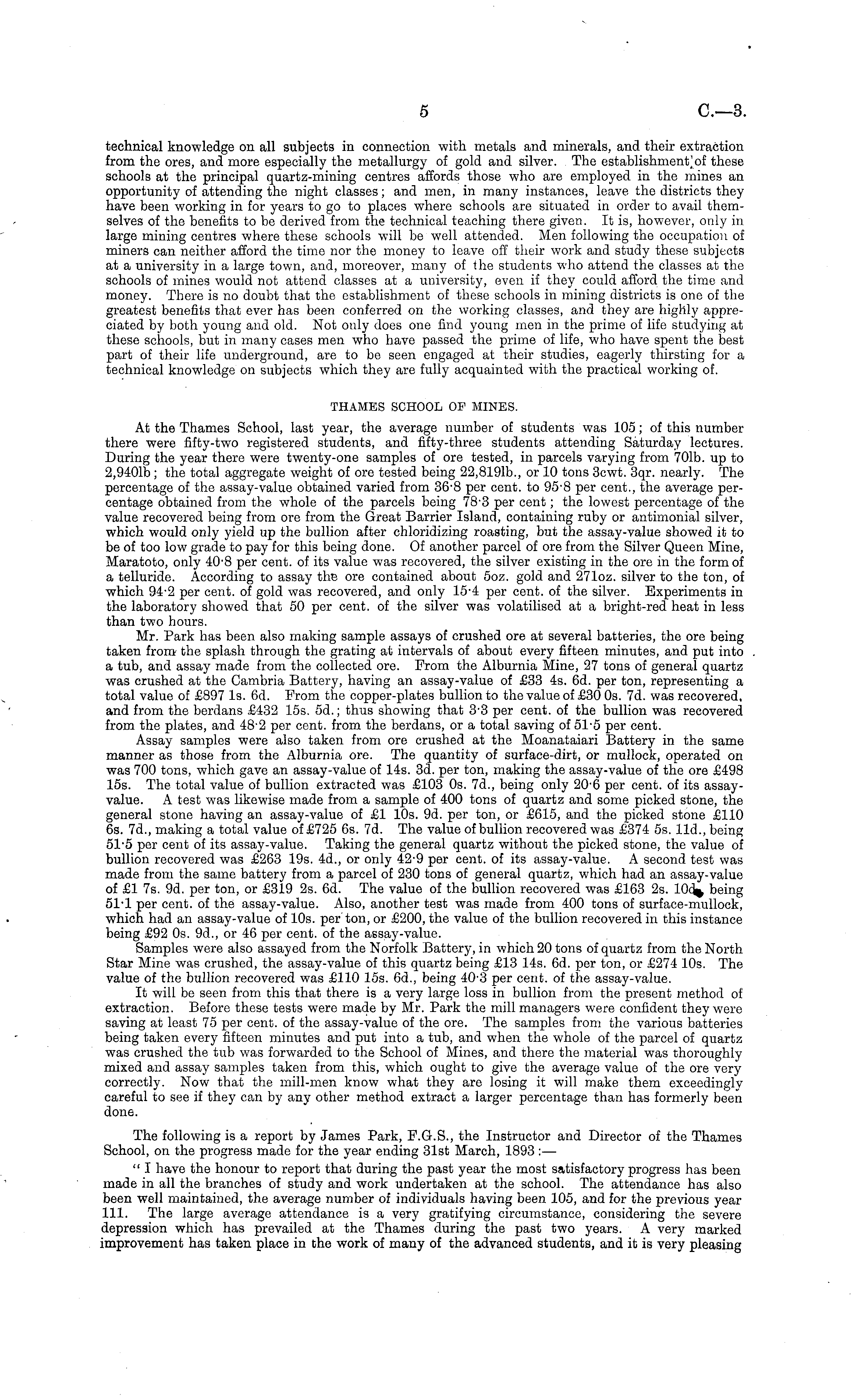 technical knowledge on all subjects in connection with metals and minerals, and their extraction from the ores, and more especially the metallurgy of gold and silver. The establishment] of these schools at the principal quartz-mining centres affords those who are employed in the mines an opportunity of attending the night classes; and men, in many instances, leave the districts they have been working in for years to go to places where schools are situated in order to avail themselves of the benefits to be derived from the technical teaching there given. It is, however, only in large mining centres where these schools will be well attended. Men following the occupation of miners can neither afford the time nor the money to leave off their work and study these subjects at a university in a large town, and, moreover, many of ihe students who attend the classes at the schools of mines would not attend classes at a university, even if they could afford the time and money. There is no doubt that the establishment of these schools in mining districts is one of the greatest benefits that ever has been conferred on the working classes, and they are highly appreciated by both young and old. Not only does one find young men in the prime of life studying at these schools, but in many cases men who have passed the prime of life, who have spent the best part of their life underground, are to be seen engaged at their studies, eagerly thirsting for a technical knowledge on subjects which they are fully acquainted with the practical working of. THAMES SCHOOL OP MINES. At the Thames School, last year, the average number of students was 105; of this number there were fifty-two registered students, and fifty-three students attending Saturday lectures. During the year there were twenty-one samples of ore tested, in parcels varying from 701b. up to 2,9401b ; the total aggregate weight of ore tested being 22,8191b., or 10 tons 3cwt. 3qr. nearly. The percentage of the assay-value obtained varied from 36-8 per cent, to 95-8 per cent., the average percentage obtained from the whole of the parcels being 78-3 per cent; the lowest percentage of the value recovered being from ore from the Great Barrier Island, containing ruby or antimonial silver, which would only yield up the bullion after chloridizing roasting, but the assay-value showed it to be of too low grade to pay for this being done. Of another parcel of ore from the Silver Queen Mine, Maratoto, only 40-8 per cent, of its value was recovered, the silver existing in the ore in the form of a telluride. According to assay the ore contained about soz. gold and 2710z. silver to the ton, of which 94-2 per cent, of gold was recovered, and only 15-4 per cent, of the silver. Experiments in the laboratory showed that 50 per cent, of the silver was volatilised at a bright-red heat in less than two hours. Mr. Park has been also making sample assays of crushed ore at several batteries, the ore being taken from- the splash through the grating at intervals of about every fifteen minutes, and put into a tub, and assay made from the collected ore. Prom the Alburnia Mine, 27 tons of general quartz was crushed at the Cambria Battery, having an assay-value of £33 4s. 6d. per ton, representing a total value of £897 Is. 6d. Prom the copper-plates bullion to the value of £30 os. 7d. was recovered, and from the berdans £432 15s. 5d.; thus showing that 3-3 per cent, of the bullion was recovered from the plates, and 48-2 per cent, from the berdans, or a total saving of 51-5 per cent. Assay samples were also taken from ore crushed at the Moanataiari Battery in the same manner as those from the Alburnia ore. The quantity of surface-dirt, or mullock, operated on was 700 tons, which gave an assay-value of 14s. 3d. per ton, making the assay-value of the ore £498 15s. The total value of bullion extracted was £103 os. 7d., being only 20-6 per cent, of its assayvalue. A test was likewise made from a sample of 400 tons of quartz and some picked stone, the general stone having an assay-value of £1 10s. 9d. per ton, or £615, and the picked stone £110 6s. 7d., making a total value of £725 6s. 7d. The value of bullion recovered was £374 ss. lid., being 51 - 5 per cent of its assay-value. Taking the general quartz without the picked stone, the value of bullion recovered was £263 19s. 4d., or only 42-9 per cent, of its assay-value. A second test was made from the same battery from a parcel of 230 tons of general quartz, which had an assay-value of £1 7s. 9d. per ton, or £319 2s. 6d. The value of the bullion recovered was £163 2s. being 51-1 per cent, of the assay-value. Also, another test was made from 400 tons of surface-mullock, which had an assay-value of 10s. per ton, or £200, the value of the bullion recovered in this instance being £92 os. 9d., or 46 per cent, of the assay-value. Samples were also assayed from the Norfolk Battery, in which 20 tons of quartz from the North Star Mine was crushed, the assay-value of this quartz being £1.3 14s. 6d. per ton, or £274 10s. The value of the bullion recovered was £110 15s. 6d., being 40-3 per cent, of the assay-value. It will be seen from this that there is a very large loss in bullion from the present method of extraction. Before these tests were made by Mr. Park the mill managers were confident they were saving at least 75 per cent, of the assay-value of the ore. The samples from the various batteries being taken every fifteen minutes and put into a tub, and when the whole of the parcel of quartz was crushed the tub was forwarded to the School of Mines, and there the material was thoroughly mixed and assay samples taken from this, which ought to give the average value of the ore very correctly. Now that the mill-men know what they are losing it will make them exceedingly careful to see if they can by any other method extract a larger percentage than has formerly been done. The following is a report by James Park, P.G.S., the Inst