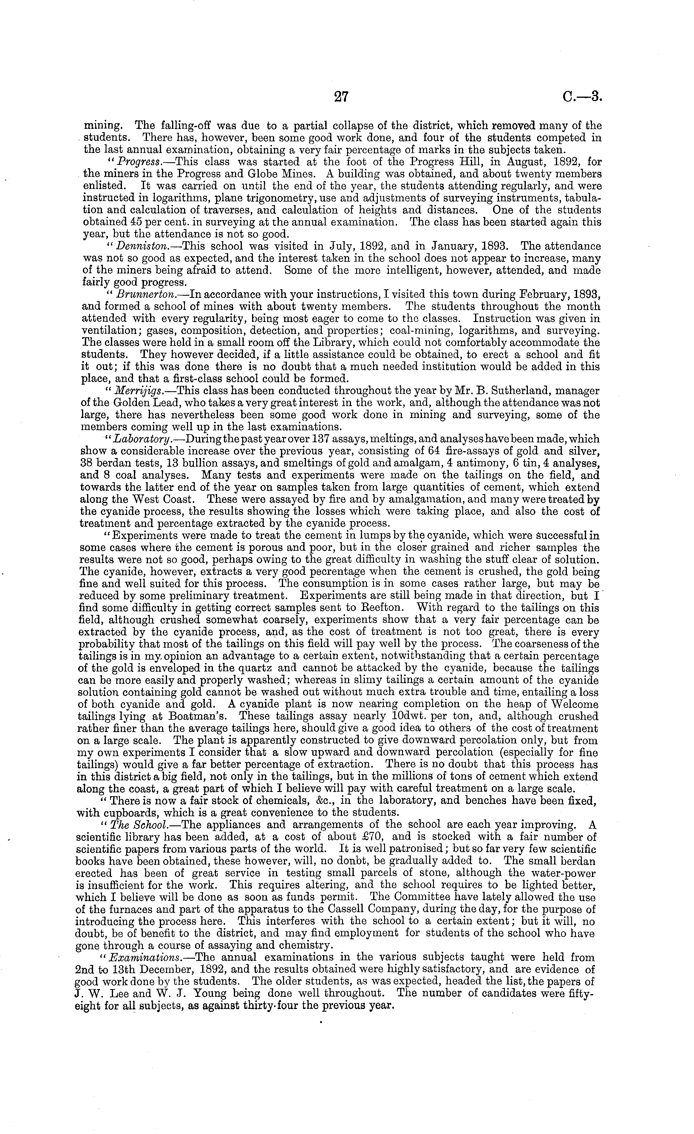 mining. The falling-off was due to a partial collapse of the district, which removed many of the students. There has, however, been some good work done, and four of the students competed in the last annual examination, obtaining a very fair percentage of marks in the subjects taken. "Progress. —This class was started at tho foot of the Progress Hill, in August, 1892, for the miners in the Progress and Globe Mines. A building was obtained, and about twenty members enlisted. It was carried on until the end of the year, the students attending regularly, and were instructed in logarithms, plane trigonometry, use and adjustments of surveying instruments, tabulation and calculation of traverses, and calculation of heights and distances. One of the students obtained 45 per cent, in surveying at the annual examination. The class has been started again this year, but the attendance is not so good. " Denniston. —This school was visited in July, 1892, and in January, 1893. The attendance was not so good as expected, and the interest taken in the school does not appear to increase, many of the miners being afraid to attend. Some of the more intelligent, however, attended, and made fairly good progress. " Brunnerton. —ln accordance with your instructions, I visited this town during February, 1893, and formed a school of mines with about twenty members. The students throughout the month attended with every regularity, being most eager to come to tho classes. Instruction was given in ventilation; gases, composition, detection, and properties; coal-mining, logarithms, and surveying. The classes were held in a small room off the Library, which could not comfortably accommodate the students. They however decided, if a little assistance could be obtained, to erect a school and fit it out; if this was done there is no doubt that a much needed institution would be added in this place, and that a first-class school could be formed. " Merrijigs. —This class has been conducted throughout the year by Mr. B. Sutherland, manager of the Golden Lead, who takes a very great interest in the work, and, although the attendance was not large, there has nevertheless been some good work done in mining and surveying, some of the members coming well up in the last examinations. "Laboratory. —During the past year over 137 assays, meltings, and analyses have been made, which show a considerable increase over the previous year, consisting of 64 fire-assays of gold and silver, 38 berdan tests, 13 bullion assays, and smeltings of gold and amalgam, 4 antimony, 6 tin, 4 analyses, and 8 coal analyses. Many tests and experiments were made on the tailings on the field, and towards the latter end of the year on samples taken from large quantities of cement, which extend along the West Coast. These were assayed by fire and by amalgamation, and many were treated by the cyanide process, the results showing the losses which were taking place, and also the cost of treatment and percentage extracted by the cyanide process. "Experiments were made to treat the cement in lumps by the cyanide, which were Successful in some cases where the cement is porous and poor, but in the closer grained and richer samples the results were not so good, perhaps owing to the great difficulty in washing the stuff clear of solution. The cyanide, however, extracts a very good pecrentage when the cement is crushed, the gold being fine and well suited for this process. The consumption is in some cases rather large, but may be reduced by some preliminary treatment. Experiments are still being made in that direction, but I find some difficulty in getting correct samples sent to Beefton. With regard to the tailings on this field, although crushed somewhat coarsely, experiments show that a very fair percentage can be extracted by the cyanide process, and, as the cost of treatment is not too great, there is every probability that most of the tailings on this field will pay well by the process. The coarseness of the tailings is in my. opinion an advantage to a certain extent, notwithstanding that a certain percentage of the gold is enveloped in the quartz and cannot be attacked by the cyanide, because the tailings can be more easily and properly washed; whereas in slimy tailings a certain amount of the cyanide solution containing gold cannot be washed out without much extra trouble and time, entailing a loss of both cyanide and gold. A cyanide plant is now nearing completion on the heap of Welcome tailings lying at Boatman's. These tailings assay nearly lOdwt. per ton, and, although crushed rather finer than the average tailings here, should give a good idea to others of the cost of treatment on a large scale. The plant is apparently constructed to give downward percolation only, but from my own experiments I consider that a slow upward and downward percolation (especially for fine tailings) would give a far better percentage of extraction. There is no doubt that this process has in this district a big field, not only in the tailings, but in the millions of tons of cement which extend along the coast, a great part of which I believe will pay with careful treatment on a large scale. " There is now a fair stock of chemicals, &c, in the laboratory, and benches have been fixed, with cupboards, which is a great convenience to the students. " The School. —The appliances and arrangements of the school are each year improving. A scientific library has been added, at a cost of about £70, and is stocked with a fair number of scientific papers from various parts of the world. It is well patronised ; but so far very few scientific books have been obtained, these however, will, no donbt, be gradually added to. The small berdan erected has been of great service in testing small parcels of stone, although the water-power is insufficient for the work. This requires altering, and the school requires to be lighted better, which I believe will be done as soon as funds permit. T