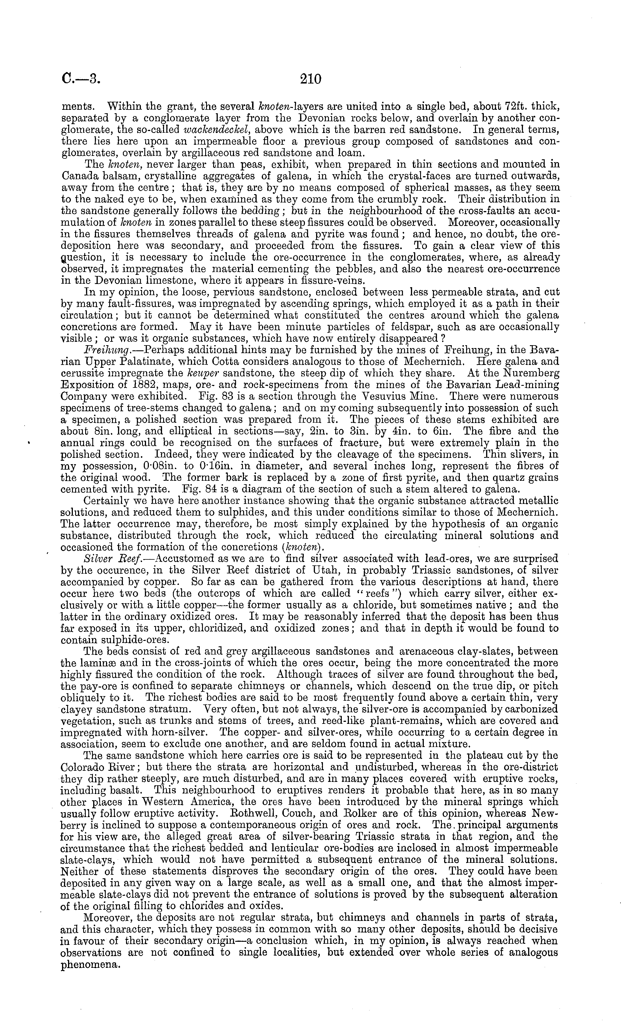 ments. Within the grant, the several knoten-l&yevs are united into a single bed, about 72ft. thick, separated by a conglomerate layer from the Devonian rocks below, and overlain by another conglomerate, the so-called wackendeckel, above which is the barren red sandstone. In general terms, there lies here upon an impermeable floor a previous group composed of sandstones and conglomerates, overlain by argillaceous red sandstone and loam. The knoten, never larger than peas, exhibit, when prepared in thin sections and mounted in Canada balsam, crystalline aggregates of galena, in which the crystal-faces are turned outwards, away from the centre ; that is, they are by no means composed of spherical masses, as they seem to the naked eye to be, when examined as they come from the crumbly rock. Their distribution in the sandstone generally follows the bedding; but in the neighbourhood of the cross-faults an accumulation of knoten in zones parallel to these steep fissures could be observed. Moreover, occasionally in the fissures themselves threads of galena and pyrite was found; and hence, no doubt, the oredeposition here was secondary, and proceeded from the fissures. To gain a clear view of this question, it is necessary to include the ore-occurrence in the conglomerates, where, as already observed, it impregnates the material cementing the pebbles, and also the nearest ore-occurrence in the Devonian limestone, where it appears in fissure-veins. In my opinion, the loose, pervious sandstone, enclosed between less permeable strata, and cut by many fault-fissures, was impregnated by ascending springs, which employed it as a path in their circulation; but it cannot be determined what constituted the centres around which the galena concretions are formed. May it have been minute particles of feldspar, such as are occasionally visible ; or was it organic substances, which have now entirely disappeared ? Freihung. —Perhaps additional hints may be furnished by the mines of Freihung, in the Bavarian Upper Palatinate, which Cotta considers analogous to those of Mechernich. Here galena and cerussite impregnate the keuper sandstone, the steep dip of which they share. At the Nuremberg Exposition of 1882, maps, ore- and rock-specimens from the mines of the Bavarian Lead-mining Company were exhibited. Pig. 83 is a section through the Vesuvius Mine. There were numerous specimens of tree-stems changed to galena; and on my coming subsequently into possession of such a specimen, a polished section was prepared from it. The pieces of these stems exhibited are about Bin. long, and elliptical in sections—say, 2in. to 3in. by 4in. to 6in. The fibre and the annual rings could be recognised on the surfaces of fracture, but were extremely plain in the polished section. Indeed, they were indicated by the cleavage of the specimens. Thin slivers, in my possession, Ooßin. to 0-16 in. in diameter, and several inches long, represent the fibres of the original wood. The former bark is replaced by a zone of first pyrite, and then quartz grains cemented with pyrite. Fig. 84 is a diagram of the section of such a stem altered to galena. Certainly we have here another instance showing that the organic substance attracted metallic solutions, and reduced them to sulphides, and this under conditions similar to those of Mechernich. The latter occurrence may, therefore, be most simply explained by the hypothesis of an organic substance, distributed through the rock, which reduced the circulating mineral solutions and occasioned the formation of the concretions {knoten). Silver Beef. —Accustomed as we are to find silver associated with lead-ores, we are surprised by the occurence, in the Silver Eeef district of Utah, in probably Triassic sandstones, of silver accompanied by copper. So far as can be gathered from the various descriptions at hand, there occur here two beds (the outcrops of which are called " reefs ") which carry silver, either exclusively or with a little copper—the former usually as a chloride, but sometimes native ; and the latter in the ordinary oxidized ores. It may be reasonably inferred that the deposit has been thus far exposed in its upper, chloridized, and oxidized zones; and that in depth it would be found to contain sulphide-ores. The beds consist of red and grey argillaceous sandstones and arenaceous clay-slates, between the lammas and in the cross-joints of which the ores occur, being the more concentrated the more highly fissured the condition of the rock. Although traces of silver are found throughout the bed, the pay-ore is confined to separate chimneys or channels, which descend on the true dip, or pitch obliquely to it. The richest bodies are said to be most frequently found above a certain thin, very clayey sandstone stratum. Very often, but not always, the silver-ore is accompanied by carbonized vegetation, such as trunks and stems of trees, and reed-like plant-remains, which are covered and impregnated with horn-silver. The copper- and silver-ores, while occurring to a certain degree in association, seem to exclude one another, and are seldom found in actual mixture. The same sandstone which here carries ore is said to be represented in the plateau cut by the Colorado Eiver; but there the strata are horizontal and undisturbed, whereas in the ore-district they dip rather steeply, are much disturbed, and are in many places covered with eruptive rocks, including basalt. This neighbourhood to eruptives renders it probable that here, as in so many other places in Western America, the ores have been introduced by the mineral springs which usually follow eruptive activity. Eothwell, Couch, and Eolker are of this opinion, whereas Newberry is inclined to suppose a contemporaneous origin of ores and rock. The principal arguments for his view are, the alleged great area of silver-bearing Triassic strata in that region, and the circumstance that the richest bedded and lenticular ore-bodies are inclosed in