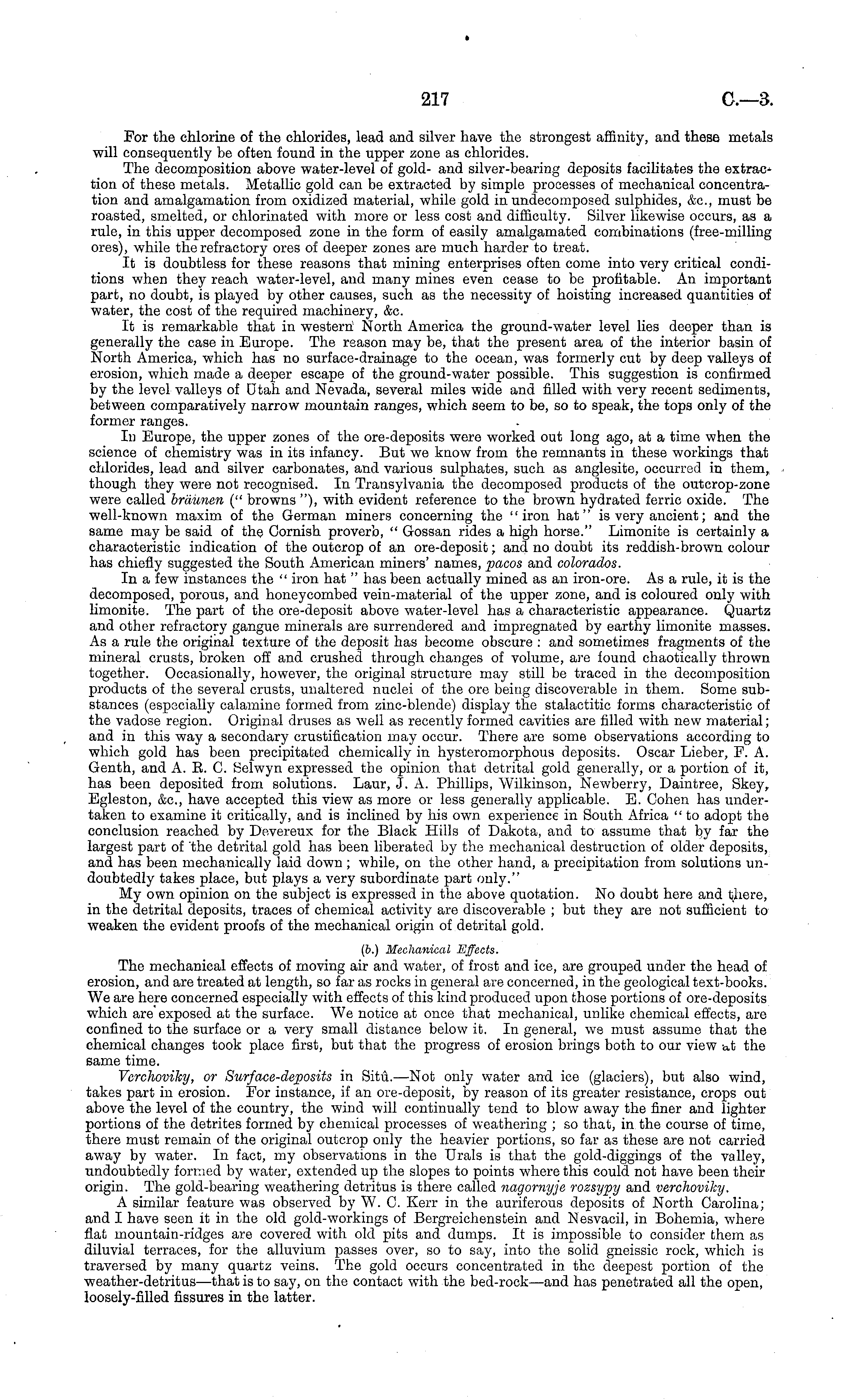 For the chlorine of the chlorides, lead and silver have the strongest affinity, and these metals will consequently be often found in the upper zone as chlorides. The decomposition above water-level of gold- and silver-bearing deposits facilitates the extraction of these metals. Metallic gold can be extracted by simple processes of mechanical concentration and amalgamation from oxidized material, while gold in undecomposed sulphides, &c, must be roasted, smelted, or chlorinated with more or less cost and difficulty. Silver likewise occurs, as a rule, in thie upper decomposed zone in the form of easily amalgamated combinations (free-milling ores), while the refractory ores of deeper zones are much harder to treat. It is doubtless for these reasons that mining enterprises often come into very critical conditions when they reach water-level, and many mines even cease to be profitable. An important part, no doubt, is played by other causes, such as the necessity of hoisting increased quantities of water, the cost of the required machinery, &c. It is remarkable that in western North America the ground-water level lies deeper than is generally the case in Europe. The reason may be, that the present area of the interior basin of North America, which has no surface-drainage to the ocean, was formerly cut by deep valleys of erosion, which made a deeper escape of the ground-water possible. This suggestion is confirmed by the level valleys of Utah and Nevada, several miles wide and filled with very recent sediments, between comparatively narrow mountain ranges, which seem to be, so to speak, the tops only of the former ranges. In Europe, the upper zones of the ore-deposits were worked out long ago, at a time when the science of chemistry was in its infancy. But we know from the remnants in these workings that chlorides, lead and silver carbonates, and various sulphates, such as anglesite, occurred in them, though they were not recognised. In Transylvania the decomposed products of the outcrop-zone were called brdunen (" browns "), with evident reference to the brown hydrated ferric oxide. The well-known maxim of the German miners concerning the "iron hat" is very ancient; and the same may be said of the Cornish proverb, " Gossan rides a high horse." Limonite is certainly a characteristic indication of the outcrop of an ore-deposit; and no doubt its reddish-brown colour has chiefly suggested the South American miners' names, pacos and colorados. In a few instances the " iron hat " has been actually mined as an iron-ore. As a rule, it is the decomposed, porous, and honeycombed vein-material of the upper zone, and is coloured only with limonite. The part of the ore-deposit above water-level has a characteristic appearance. Quartz and other refractory gangue minerals are surrendered and impregnated by earthy limonite masses. As a rule the original texture of the deposit has become obscure : and sometimes fragments of the mineral crusts, broken off and crushed through changes of volume, are found chaotically thrown together. Occasionally, however, the original structure may still be traced in the decomposition products of the several crusts, unaltered nuclei of the ore being discoverable in them. Some substances (especially calamine formed from zinc-blende) display the stalactitic forms characteristic of the vadose region. Original druses as well as recently formed cavities are filled with new material; and in this way a secondary crustification may occur. There are some observations according to which gold has been precipitated chemically in hysteromorphous deposits. Oscar Lieber, F. A. Genth, and A. R. C. Selwyn expressed the opinion that detrital gold generally, or a portion of it, has been deposited from solutions. Laur, J. A. Phillips, Wilkinson, Newberry, Daintree, Skey, Egleston, &c, have accepted this view as more or less generally applicable. E. Cohen has undertaken to examine it critically, and is inclined by his own experience in South Africa " to adopt the conclusion reached by Devereux for the Black Hills of Dakota, and to assume that by far the largest part of the detrital gold has been liberated by the mechanical destruction of older deposits, and has been mechanically laid down ; while, on the other hand, a precipitation from solutions undoubtedly takes place, but plays a very subordinate part only." My own opinion on the subject is expressed in the above quotation. No doubt here and there, in the detrital deposits, traces of chemical activity are discoverable ; but they are not sufficient to weaken the evident proofs of the mechanical origin of detrital gold. (6.) Mechanical Effects. The mechanical effects of moving air and water, of frost and ice, are grouped under the head of erosion, and are treated at length, so far as rocks in general are concerned, in the geological text-books. We are here concerned especially with effects of this kind produced upon those portions of ore-deposits which are exposed at the surface. We notice at once that mechanical, unlike chemical effects, are confined to the surface or a very small distance below it. In general, we must assume that the chemical changes took place first, but that the progress of erosion brings both to our view -at the same time. Vcrchoviky, or Surface-deposits in Situ.—Not only water and ice (glaciers), but also wind, takes part in erosion. For instance, if an ore-deposit, by reason of its greater resistance, crops out above the level of the country, the wind will continually tend to blow away the finer and lighter portions of the detrites formed by chemical processes of weathering ; so that, in the course of time, there must remain of the original outcrop only the heavier portions, so far as these are not carried away by water. In fact, my observations in the Urals is that the gold-diggings of the valley, undoubtedly formed by water, extended up the slopes to points where this could not have been their origin. The gold-bearing we