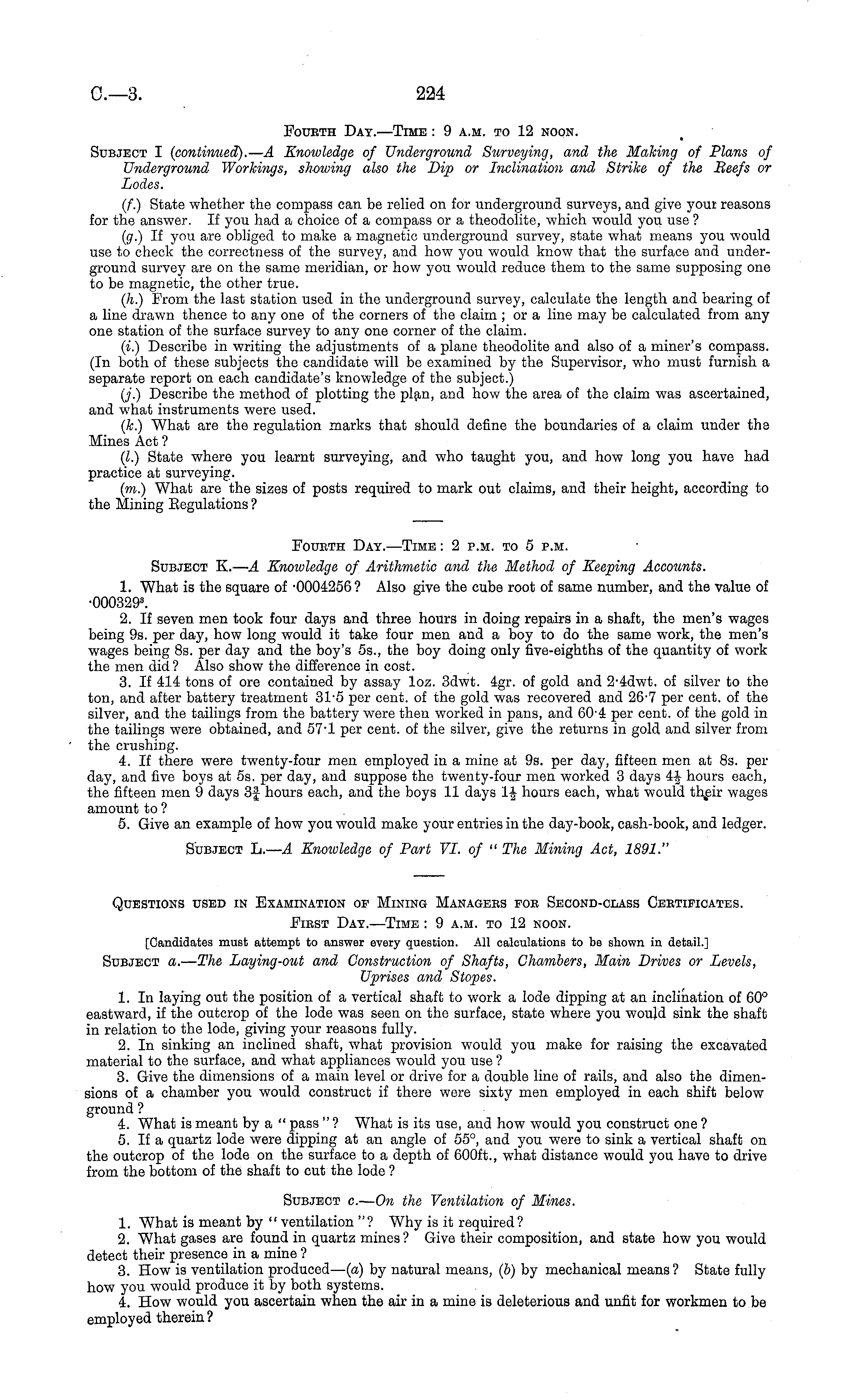 Fourth Day.—Time : 9 a.m. to 12 noon. Subject I (continued). — A Knowledge of Underground Surveying, and the Making of Plans of Underground Workings, showing also the Dip or Inclination and Strike of the Beefs or Lodes. (f.) State whether the compass can be relied on for underground surveys, and give your reasons for the answer. If you had a choice of a compass or a theodolite, which would you use ? (g.) If you are obliged to make a magnetic underground survey, state what means you would use to check the correctness of the survey, and how you would know that the surface and underground survey are on the same meridian, or how you would reduce them to the same supposing one to be magnetic, the other true. (/j.) From the last station used in the underground survey, calculate the length and bearing of a line drawn thence to any one of the corners of the claim ; or a line may be calculated from any one station of the surface survey to any one corner of the claim. (i.) Describe in writing the adjustments of a plane theodolite and also of a miner's compass. (In both of these subjects the candidate will be examined by the Supervisor, who must furnish a separate report on each candidate's knowledge of the subject.) (J.) Describe the method of plotting the plan, and how the area of the claim was ascertained, and what instruments were used. (k.) What are the regulation marks that should define the boundaries of a claim under the Mines Act ? (I.) State where you learnt surveying, and who taught you, and how long you have had practice at surveying. (to.) What are the sizes of posts required to mark out claims, and their height, according to the Mining Eegulations ?