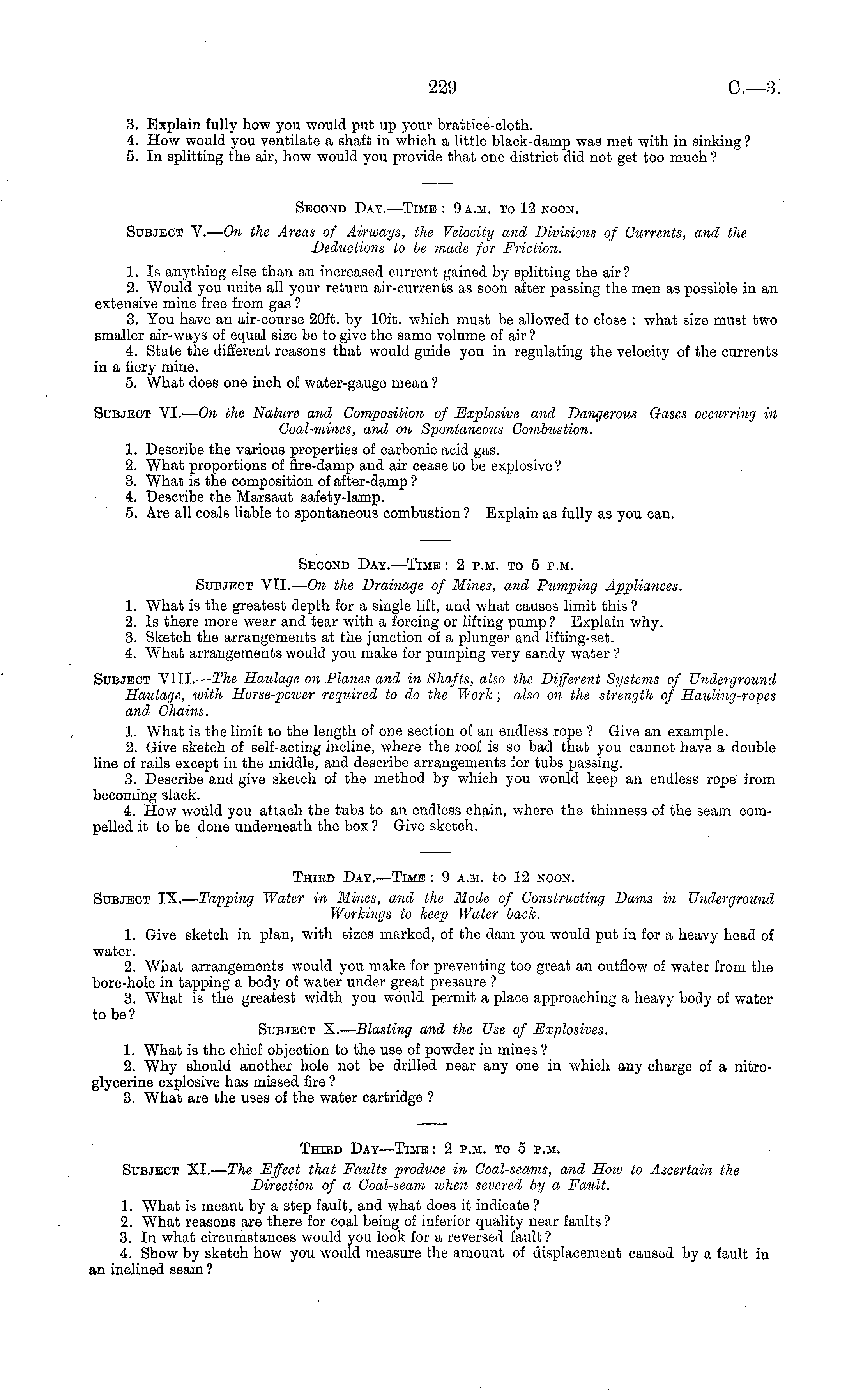 Second Day.—Time: 9a.m. to 12 noon. Subject V. — On the Areas of Airways, the Velocity and Divisions of Currents, and the Deductions to be made for Friction. 1. Is anything else than an increased current gained by splitting the air? 2. Would you unite all your return air-currents as soon after passing the men as possible in an extensive mine free from gas ? 3. You have an air-course 20ft. by 10ft. which must be allowed to close : what size must two smaller air-ways of equal size be to give the same volume of air ? 4. State the different reasons that would guide you in regulating the velocity of the currents in a fiery mine. 5. What does one inch of water-gauge mean ? Subject Vl.— On the Nature and Composition of Explosive and Dangerous Gases occurring in Coal-mines, and on Spontaneous Combustion. 1. Describe the various properties of carbonic acid gas. 2. What proportions of fire-damp and air cease to be explosive ? 3. What is the composition of after-damp ? 4. Describe the Marsaut safety-lamp. 5. Are all coals liable to spontaneous combustion? Explain as fully as you can.