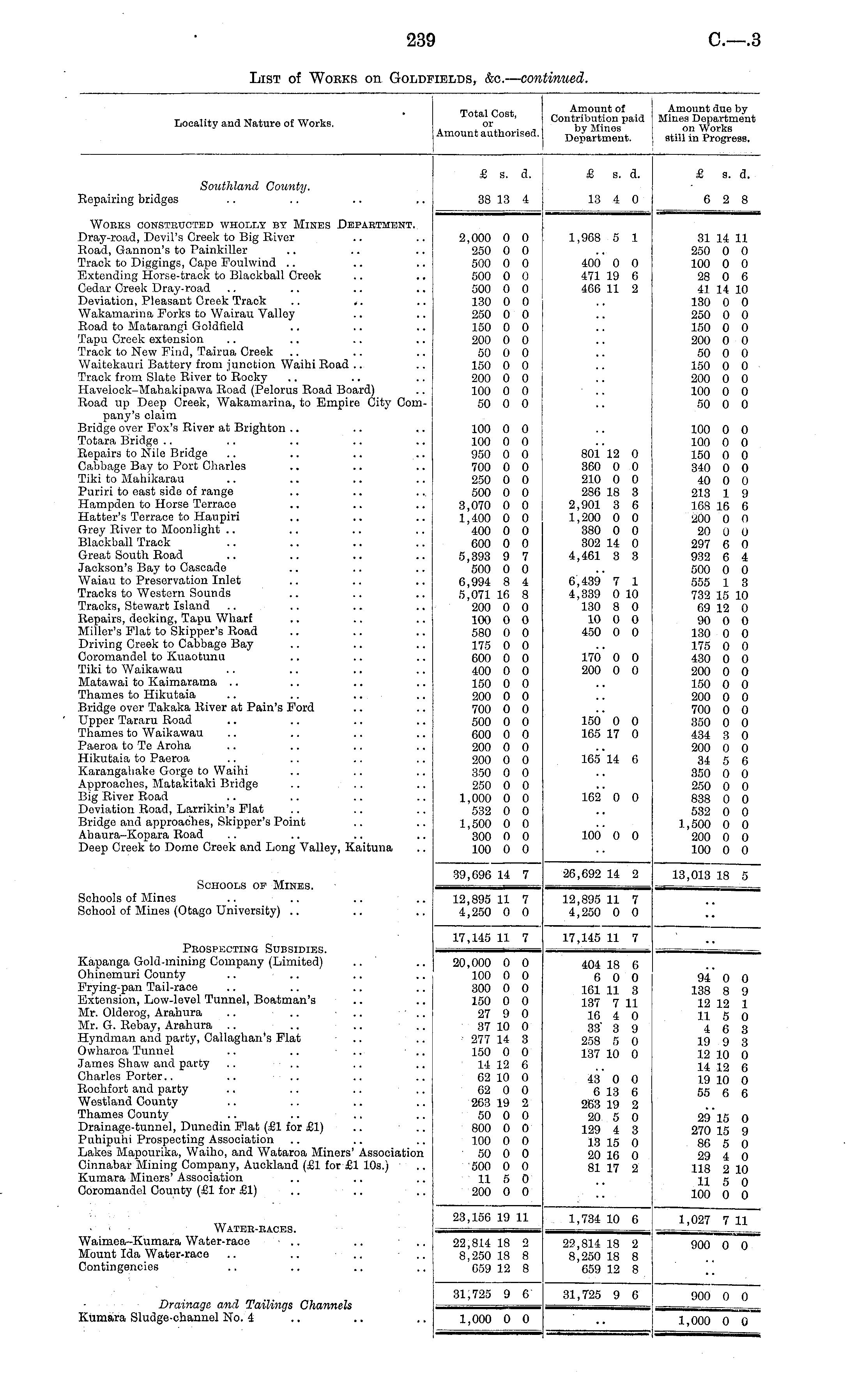 Locality and Nature of Works. Total Cost, or Amount authorised. Amount of Contribution paid by Mines Department. Amount due by Mines Department on Works still in Progress. £ s. d. £ s. d. £ i s. d. Southland County. 38 13 4 13 4 0 Repairing bridges 6 2 8 Works constructed wholly by Mines Department. Dray-road, Devil's Creek to Big River Road, Gannon's to Painkiller Track to Diggings, Cape Foulwind Extending Horse-track to Blackball Creek Cedar Creek Dray-road Deviation, Pleasant Creek Track Wakamarina Forks to Wairau Valley Road to Matarangi Goldfield Tapu Creek extension Track to New Find, Tairua Creek Waitokauri Battery from junction Waihi Road Track from Slate River to Rocky Havelock-Mahakipawa Road (Pelorus Road Board) Road up Deep Creek, Wakamarina, to Empire City Company's claim Bridge over Fox's River at Brighton Totara Bridge Repairs to Nile Bridge Cabbage Bay to Port Charles Tiki to Mahikarau Puriri to east side of range Hampden to Horse Terrace Hatter's Terrace to Haupiri Grey River to Moonlight Blackball Track Great South Road Jackson's Bay to Cascade Waiau to Preservation Inlet Tracks to Western Sounds Tracks, Stewart Island Repairs, decking, Tapu Wharf Miller's Flat to Skipper's Road Driving Creek to Cabbago Bay Coromandel to Kuaotunu Tiki to Waikawau Matawai to Kaimarama Thames to Hikutaia .. .. Bridge over Takaka River at Pain's Ford Upper Tararu Road Thames to Waikawau Paeroa to Te Aroha Hikutaia to Paeroa Karangabake Gorge to Waihi Approaches, Matakitaki Bridge .. ... Big River Road Deviation Road, Larrikin's Plat Bridge and approaches, Skipper's Point Ahaura-Kopara Road Deep Creek to Dome Creek and Long Valley, Kaituna 2,000 0 0 250 0 0 500 0 0 500 0 0 500 0 0 130 0 0 250 0 0 150 0 0 200 0 0 50 0 0 150 0 0 200 0 0 100 0 0 50 0 0 100 0 0 100 0 0 950 0 0 700 0 0 250 0 0 500 0 0 3.070 0 0 1,400 0 0 400 0 0 600 0 0 5,393 9 7 500 0 0 6,994 8 4 5.071 16 8 200 0 0 100 0 0 580 0 0 175 0 0 600 0 0 400 0 0 150 0 0 200 0 0 700 0 0 500 0 0 600 0 0 200 0 0 200 0 0 350 0 0 250 0 0 1,000 0 0 532 0 0 1,500 0 0 300 0 0 100 0 0 1,968 5 1 400 0 0 471 19 6 466 11 2 801 12 0 360 0 0 210 0 0 286 18 3 2,901 3 6 1,200 0 0 380 0 0 302 14 0 4,461 3 3 31 14 11 250 0 0 100 0 0 28 0 6 41 14 10 130 0 0 250 0 0 150 0 0 200 0 0 50 0 0 150 0 0 200 0 0 100 0 0 50 0 0 100 0 0 100 0 0 150 0 0 340 0 0 40 0 0 213 1 9 108 16 6 200 0 0 20 0 0 297 6 0 932 6 4 500 0 0 555 1 3 732 15 10 69 12 0 90 0 0 130 0 0 175 0 0 430 0 0 200 0 0 150 0 0 200 0 0 700 0 0 350 0 0 434 3 0 200 0 0 34 5 6 350 0 0 250 0 0 838 0 0 532 0 0 1,500 0 0 200 0 0 100 0 0 6,439 7 1 4,339 0 10 130 8 0 10 0 0 450 0 0 170' 0 0 200 0 0 150 0 0 165 17 0 165 14 6 162 0 0 100 0 0 Schools of Mines. 39,696 14 7 26,692 14 2 13,013 18 5 Schools of Mines .. School of Mines (Otago University) 12,895 11 7 4,250 0 0 12,895 11 7 4,250 0 0 17,145 11 7 17,145 11 7 Prospecting Subsidies. Kapanga Gold-mining Company (Limited) Ohinemuri County Frying-pan Tail-race Extension, Low-level Tunnel, Boatman's Mr. Olderog, Arahura .. .. .. • • .. Mr. G. Rebay, Arahura .. .. .. Hyndman and party, Callaghan's Flat ■ Ovvharoa Tunnel .. .. .. James Shaw and party .. Charles Porter.. .. .. Rochfort and party Westland County Thames County Drainage-tunnel, Dunedin Flat (£1 for £1) Puhipuhi Prospecting Association Lakes Mapourika, Waiho, and Wataroa Miners' Association Cinnabar Mining Company, Auckland (£1 for £1 10s.) Kumara Miners' Association Coromandel County (£1 for £1) .. .. 20,000 0 0 100 0 0 300 0 0 150 0 0 27 9 0 37 10 0 ■ 277 14 3 150 0 0 14 12 6 02 10 0 62 0 0 263 19 2 50 0 0 800 0 0 100 0 0 50 0 0 500 0 0 11 5 0 200 0 0 404 18 6 6 0 0 161 11 3 137 7 11 16 4 0 33" 3 9 258 5 0 137 10 0 43 0 0 6 13 6 263 19 2 20 5 0 129 4 3 13 15 0 20 16 0 81 17 2 94 0 0 138 8 9 12 12 1 11 5 0 4 6 3 19 9 3 12 10 0 14 12 6 19 10 0 55 6 6 29 15 0 270 15 9 86 5 0 29 4 0 118 2 10 11 5 0 100 0 0 Water-races. Waimea-Kumara Water-race ■ .. .. • Mount Ida Water-race .. .. .. • Contingencies 23,156 19 11 1,734 10 6 1,027 7 11 22,814 18 2 8,250 18 8 659 12 8 22,814 18 2 8,250 18 8 659 12 8 900 0 0 31,725 9 6 31,725 9 6 900 0 0 Drainage and Tailings Channels Kumara Sludge-channel No. 4 1,000 0 0 1,000 0 0
