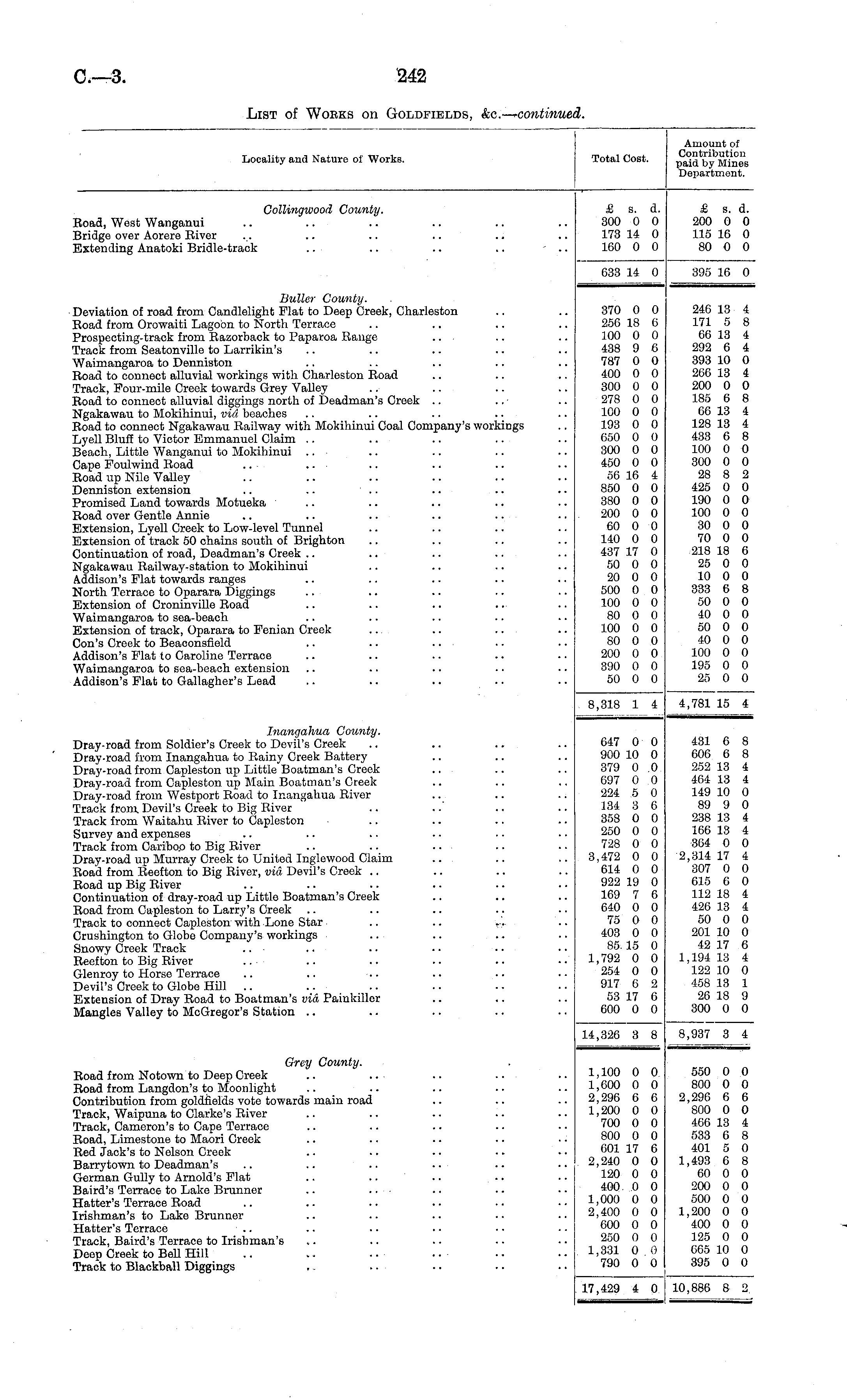 Locality and Nature of Works. Total Cost. Amount of Contribution paid by Mines Departmont. CollingiDood County. £ s. d. 300 0 0 173 14 0 160 0 0 £ s. d. 200 0 0 115 16 0 80 0 0 Boad, West Wangamii Bridge over Aorere Eiver Extending Anatoki Bridle-track 633 14 0 395 16 0 Butter County. Deviation of road from Candlelight Flat to Deep Creek, Charleston Boad from Orowaiti Lagoon to North Terrace Prospecting-track from Bazorback to Paparoa Range Track from Seatonville to Larrikin's Waimangaroa to Denniston Boad to connect alluvial workings with Charleston Boad Track, Four-mile Creek towards Grey Valley Boad to connect alluvial diggings north of Deadman's Creek Ngakawau to Mokihinui, via beaches Boad to connect Ngakawau Bailway with Mokihinui Coal Company's workings Lyell Bluff to Victor Emmanuel Claim Beach, Little Wangamii to Mokihinui Cape Foulwind Boad .. Boad up Nile Valley Denniston extension .. .. Promised Land towards Motueka Boad over Gentle Annie Extension, Lyell Creek to Low-level Tunnel Extension of track 50 chains south of Brighton Continuation of road, Deadman's Creek Ngakawau Bailway-station to Mokihinui Addison's Flat towards ranges North Terrace to Oparara Diggings Extension of Croninville Boad Waimangaroa to sea-beach Extension of track, Oparara to Fenian Creek Con's Creek to Beaconsfield Addison's Flat to Caroline Terrace Waimangaroa to sea-beach extension Addison's Flat to Gallagher's Lead 370 0 0 256 18 6 100 0 0 438 9 6 787 0 0 400 0 0 300 0 0 278 0 0 100 0 0 193 0 0 650 0 0 300 0 0 450 0 0 56 16 4 850 0 0 380 0 0 200 0 0 60 0 0 140 0 0 437 17 0 50 0 0 20 0 0 500 0 0 100 0 0 80 0 0 100 0 0 80 0 0 200 0 0 390 0 0 50 0 0 246 13 4 171 5 8 66 13 4 292 6 4 393 10 0 266 13 4 200 0 0 185 6 8 66 13 4 128 13 4 433 0 8 100 0 0 300 0 0 28 8 2 425 0 0 190 0 0 100 0 0 30 0 0 70 0 0 218 18 6 25 0 0 10 0 0 333 6 8 50 0 0 40 0 0 50 0 0 40 0 0 100 0 0 195 0 0 25 0 0 8,318 1 4 4,781 15 4 Inangahua County. Dray-road from Soldier's Croek to Devil's Creek Dray-road from Inangahua to Bainy Creek Battery Dray-road from Capleston up Little Boatman's Creek Dray-road from Capleston up Main Boatman's Creek Dray-road from Westport Boad to Inangahua Biver Track from. Devil's Creek to Big Biver Track from Waitahu Biver to Capleston Survey and expenses Track from Caribo.o to Big Biver .. .. Dray-road up Murray Creek to United Inglewood Claim Road from Beefton to Big Biver, via Devil's Creek Boad up Big Biver Continuation of dray-road up Littlo Boatman's Creek Boad from Capleston to Larry's Creek Track to connect Capleston with Lone Star Crushington to Globe Company's workings Snowy Creek Track Reofton to Big River Glenroy to Horse Terrace Devil's Creek to Globe Hill Extension of Dray Boad to Boatman's via Painkiller Mangles Valley to McGregor's Station 647 0 0 900 10 0 379 0 0 697 0 0 224 5 0 134 3 6 358 0 0 250 0 0 728 0 0 3,472 0 0 614 0 0 922 19 0 169 7 6 640 0 0 75 0 0 403 0 0 85. 15 0 1,792 0 0 254 0 0 917 6 2 53 17 6 600 0 0 431 6 8 606 6 8 252 13 4 464 13 4 149 10 0 89 9 0 238 13 4 166 18 4 364 0 0 2,314 17 4 307 0 0 615 6 0 112 18 4 426 13 4 50 0 0 201 10 0 42 17 6 1,194 13 4 122 10 0 458 13 1 26 18 9 300 0 0 14,326 3 8 8,937 3 4 Grey County. Boad from Notown to Deep Creek Road from Langdon's to Moonlight Contribution from goldfields vote towards main road Track, Waipuna to Clarke's River Track, Cameron's to Cape Terrace Boad, Limestone to Maori Creek Red jack's to Nelson Creek Barrytown to Deadman's German Gully to Arnold's Flat Baird's Terrace to Lake Brunner .. Hatter's Terrace Road Irishman's to Lake Brunner Hatter's Terrace Track, Baird's Terrace to Irishman's Deep Creek to Bell Hill Track to Blackball Diggings 1,100 0 0 1,000 0 0 2,296 6 6 1,200 0 0 700 0 0 800 0 0 601 17 6 2,240 0 0 120 0 0 400. 0 0 1,000 0 0 2,400 0 0 600 0 0 250 0 0 1,331 0 0 790 0 0 550 0 0 800 0 0 2,29G 6 6 800 0 0 466 13 4 533 6 8 401 5 0 1,493 6 8 60 0 0 200 0 0 500 0 0 1,200 0 0 400 0 0 125 0 0 665 10 0 395 0 0 17,429 4 0 10,886 8 2