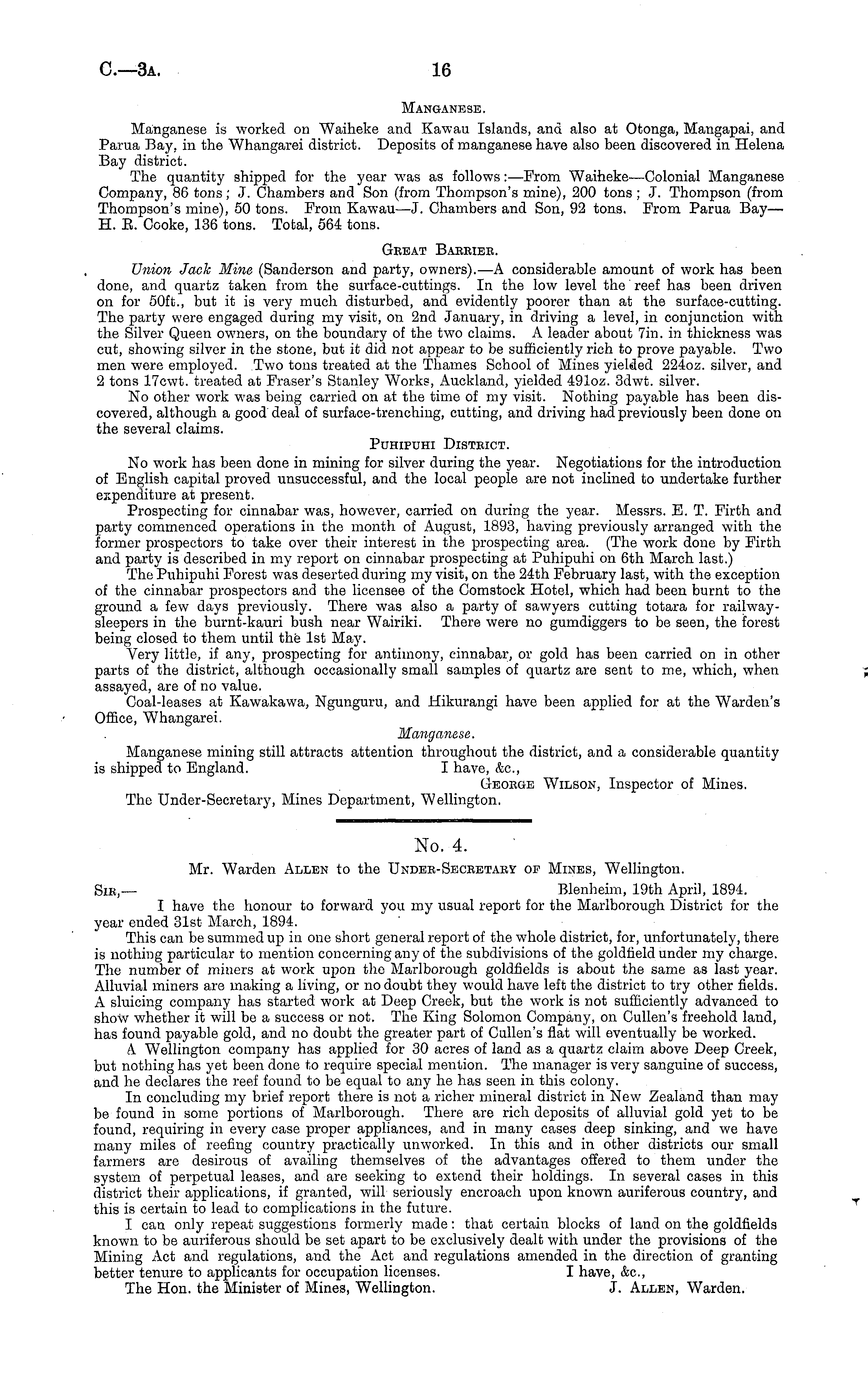 No. 4. Mr. Warden Allen to the Undee-Seceetaey op Mines, Wellington. Sib,— Blenheim, 19th April, 1894. I have the honour to forward you my usual report for the Marlborough District for the year ended 31st March, 1894. This can be summed up in one short general report of the whole district, for, unfortunately, there is nothing particular to mention concerning any of the subdivisions of the goldfield under my charge. The number of miners at work upon the Marlborough goldfields is about the same as last year. Alluvial miners are making a living, or no doubt they would have left the district to try other fields. A sluicing company has started work at Deep Creek, but the work is not sufficiently advanced to show whether it will be a success or not. The King Solomon Company, on Cullen's freehold land, has found payable gold, and no doubt the greater part of Cullen's flat will eventually be worked. A Wellington company has applied for 30 acres of land as a quartz claim above Deep Creek, but nothing has yet been done to require special mention. The manager is very sanguine of success, and he declares the reef found to be equal to any he has seen in this colony. In concluding my brief report there is not a richer mineral district in New Zealand than may be found in some portions of Marlborough. There are rich deposits of alluvial gold yet to be found, requiring in every case proper appliances, and in many cases deep sinking, and we have many miles of reefing country practically unworked. In this and in other districts our small farmers are desirous of availing themselves of the advantages offered to them under the system of perpetual leases, and are seeking to extend their holdings. In several cases in this district their applications, if granted, will seriously encroach upon known auriferous country, and this is certain to lead to complications in the future. I can only repeat suggestions formerly made : that certain blocks of land on the goldfields known to be auriferous should be set apart to be exclusively dealt with under the provisions of the Mining Act and regulations, and the Act and regulations amended in the direction of granting better tenure to applicants for occupation licenses. I have, &c, The Hon. the Minister of Mines, Wellington. J. Allen, Warden.