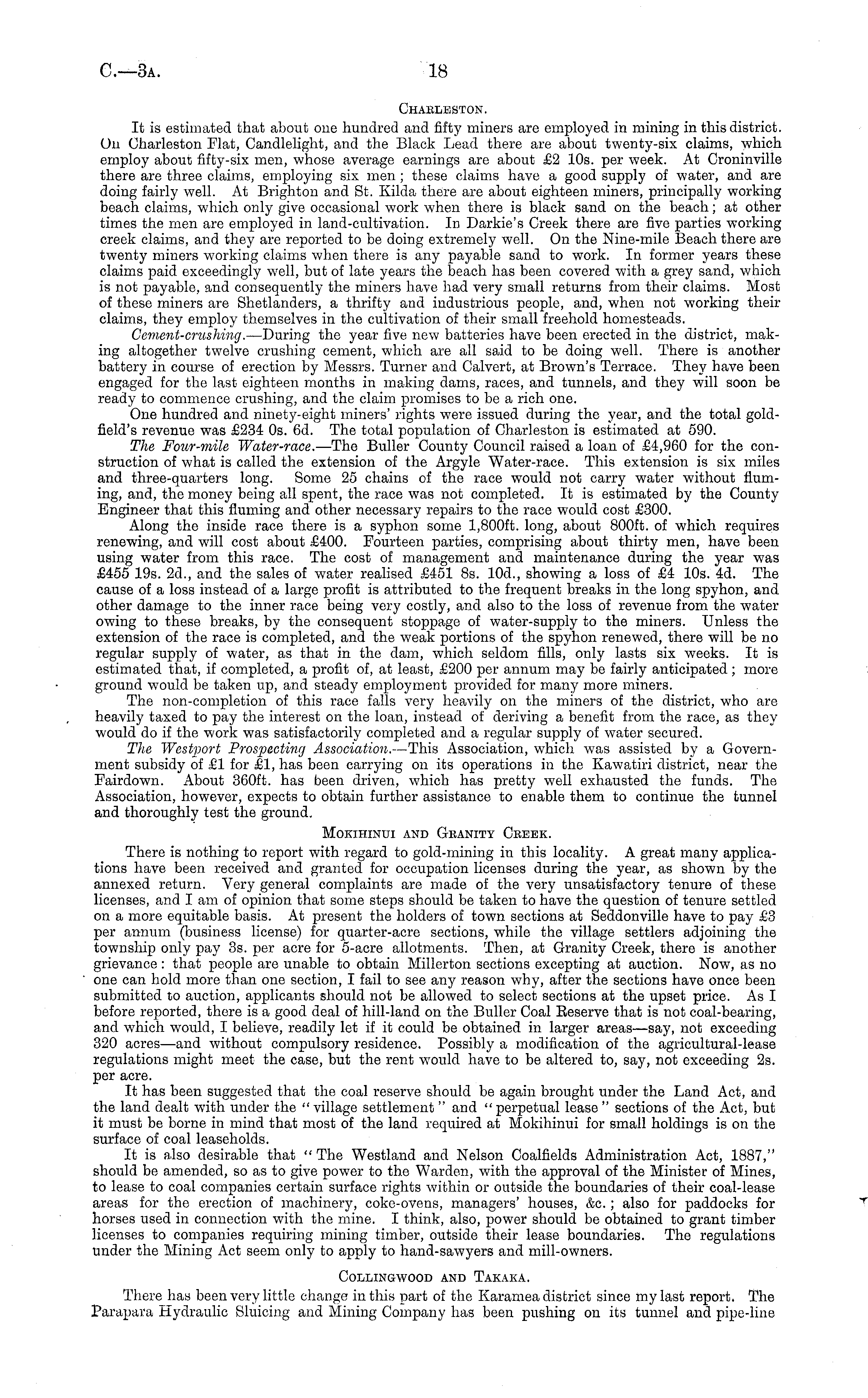 Chableston. It is estimated that about one hundred and fifty miners are employed in mining in this district. On Charleston Flat, Candlelight, and the Black Lead there are about twenty-six claims, which employ about fifty-six men, whose average earnings are about £2 10s. per week. At Croninville there are three claims, employing six men ; these claims have a good supply of water, and are doing fairly well. At Brighton and St. Kilda there are about eighteen miners, principally working beach claims, which only give occasional work when there is black sand on the beach; at other times the men are employed in land-cultivation. In Darkies Creek there are five parties working creek claims, and they are reported to be doing extremely well. On the Nine-mile Beach there are twenty miners working claims when there is any payable sand to work. In former years these claims paid exceedingly well, but of late years the beach has been covered with a grey sand, which is not payable, and consequently the miners have had very small returns from their claims. Most of these miners are Shetlanders, a thrifty and industrious people, and, when not working their claims, they employ themselves in the cultivation of their small freehold homesteads. Cement-crushing. —During the year five new batteries have been erected in the district, making altogether twelve crushing cement, which are all said to be doing well. There is another battery in course of erection by Messrs. Turner and Calvert, at Brown's Terrace. They have been engaged for the last eighteen months in making dams, races, and tunnels, and they will soon be ready to commence crushing, and the claim promises to be a rich one. One hundred and ninety-eight miners' rights were issued during the year, and the total goldfield's revenue was £234 os. 6d. The total population of Charleston is estimated at 590. The Four-mile Water-race. —The Buller County Council raised a loan of £4,960 for the construction of what is called the extension of the Argyle Water-race. This extension is six miles and three-quarters long. Some 25 chains of the race would not carry water without fluming, and, the money being all spent, the race was not completed. It is estimated by the County Engineer that this fluming and other necessary repairs to the race would cost £300. Along the inside race there is a syphon some I,Booft. long, about 800 ft. of which requires renewing, and will cost about £400. Fourteen parties, comprising about thirty men, have been using water from this race. The cost of management and maintenance during the year was £455 19s. 2d., and the sales of water realised £451 Bs. 10d., showing a loss of £4 10s. 4d. The cause of a loss instead of a large profit is attributed to the frequent breaks in the long spyhon, and other damage to the inner race being very costly, and also to the loss of revenue from the water owing to these breaks, by the consequent stoppage of water-supply to the miners. Unless the extension of the race is completed, and the weak portions of the spyhon renewed, there will be no regular supply of water, as that in the dam, which seldom fills, only lasts six weeks. It is estimated that, if completed, a profit of, at least, £200 per annum may be fairly anticipated ; more ground would be taken up, and steady employment provided for many more miners. The non-completion of this race falls very heavily on the miners of the district, who are heavily taxed to pay the interest on the loan, instead of deriving a benefit from the race, as they would do if the work was satisfactorily completed and a regular supply of water secured. The Westport Prospecting Association. —This Association, which was assisted by a Government subsidy of £1 for £1, has been carrying on its operations in the Kawatiri district, near the Fairdown. About 360 ft. has been driven, which has pretty well exhausted the funds. The Association, however, expects to obtain further assistance to enable them to continue the tunnel and thoroughly test the ground. MOKIHINUI AND GeANITY CeEEK. There is nothing to report with regard to gold-mining in this locality. A great many applications have been received and granted for occupation licenses during the year, as shown by the annexed return. Very general complaints are made of the very unsatisfactory tenure of these licenses, and I am of opinion that some steps should be taken to have the question of tenure settled on a more equitable basis. At present the holders of town sections at Seddonville have to pay £3 per annum (business license) for quarter-acre sections, while the village settlers adjoining the township only pay 3s. per acre for 5-acre allotments. Then, at Granity Creek, there is another grievance: that people are unable to obtain Millerton sections excepting at auction. Now, as no one can hold more than one section, I fail to see any reason why, after the sections have once been submitted to auction, applicants should not be allowed to select sections at the upset price. As I before reported, there is a good deal of hill-land on the Buller Coal Beserve that is not coal-bearing, and which would, I believe, readily let if it could be obtained in larger areas—say, not exceeding 320 acres—and without compulsory residence. Possibly a modification of the agricultural-lease regulations might meet the case, but the rent would have to be altered to, say, not exceeding 2s. per acre. It has been suggested that the coal reserve should be again brought under the Land Act, and the land dealt with under the " village settlement " and " perpetual lease " sections of the Act, but it must be borne in mind that most of the land required at Mokihinui for small holdings is on the surface of coal leaseholds. It is also desirable that " The Westland and Nelson Coalfields Administration Act, 1887," should be amended, so as to give power to the Warden, with the approval of the Minister of Mines, to lease to coal companies certain surface rig