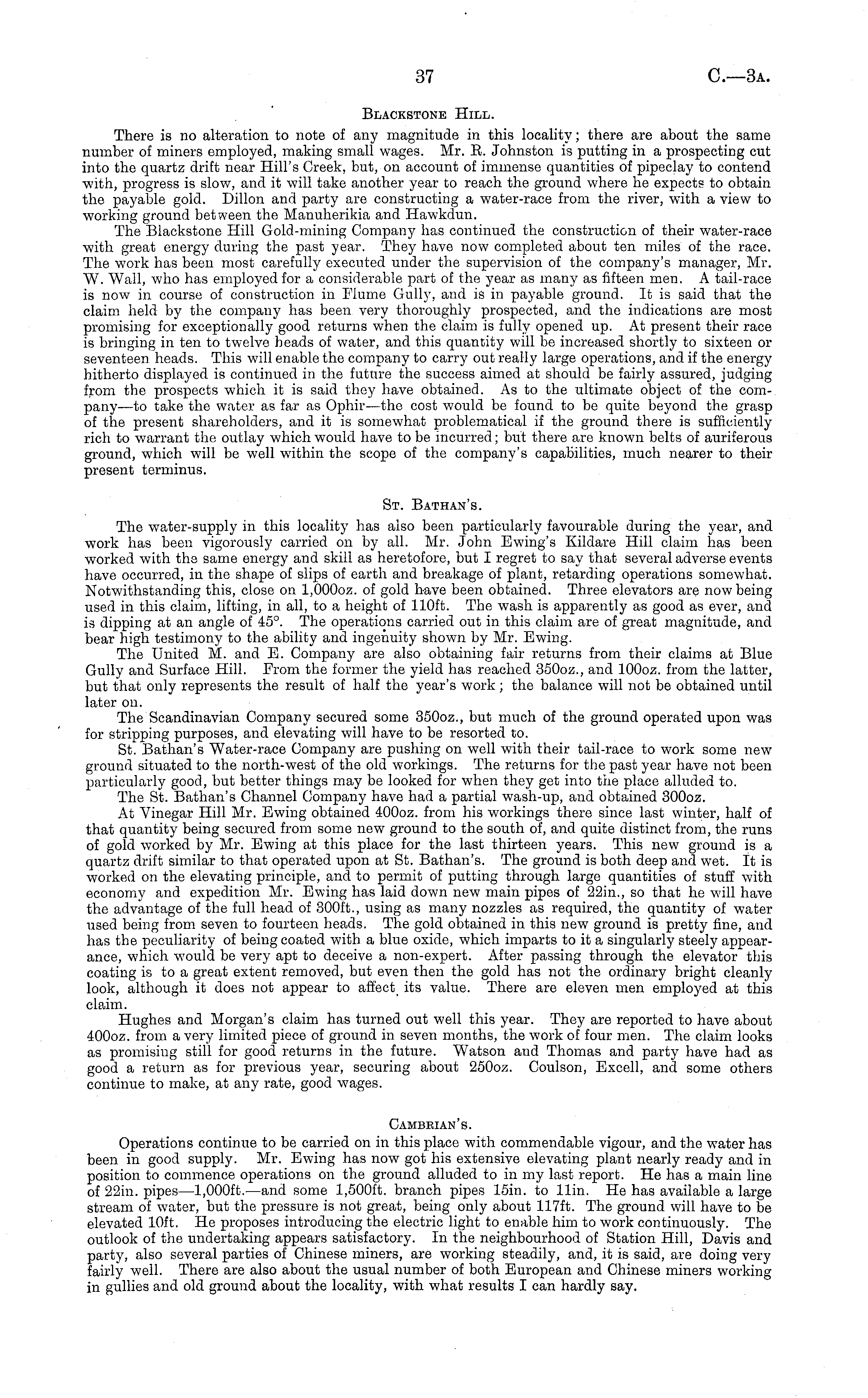 Blackstone Hill. There is no alteration to note of any magnitude in this locality; there are about the same number of miners employed, making small wages. Mr. B. Johnston is putting in a prospecting cut into the quartz drift near Hill's Creek, but, on account of immense quantities of pipeclay to contend with, progress is slow, and it will take another year to reach the ground where he expects to obtain the payable gold. Dillon and party are constructing a water-race from the river, with a view to working ground between the Manuherikia and Hawkdun. The Blackstone Hill Gold-mining Company has continued the construction of their water-race with great energy during the past year. They have now completed about ten miles of the race. The work has been most carefully executed under the supervision of the company's manager, Mr. W. Wall, who has employed for a considerable part of the year as many as fifteen men. A tail-race is now in course of construction in Flume Gully, and is in payable ground. It is said that the claim held by the company has been very thoroughly prospected, and the indications are most promising for exceptionally good returns when the claim is fully opened up. At present their race is bringing in ten to twelve heads of water, and this quantity will be increased shortly to sixteen or seventeen heads. This will enable the company to carry out really large operations, and if the energy hitherto displayed is continued in the future the success aimed at should be fairly assured, judging from the prospects which it is said they have obtained. As to the ultimate object of the company —to take the water as far as Ophir—the cost would be found to be quite beyond the grasp of the present shareholders, and it is somewhat problematical if the ground there is sufficiently rich to warrant the outlay which would have to be incurred; but there are known belts of auriferous ground, which will be well within the scope of the company's capabilities, much nearer to their present terminus. St. Bathan's. The water-supply in this locality has also been particularly favourable during the year, and work has been vigorously carried on by all. Mr. John Ewing's Kildare Hill claim has been worked with the same energy and skill as heretofore, but I regret to say that several adverse events have occurred, in the shape of slips of earth and breakage of plant, retarding operations somewhat. Notwithstanding this, close on l,ooooz. of gold have been obtained. Three elevators are now being used in this claim, lifting, in all, to a height of 110 ft. The wash is apparently as good as ever, and is dipping at an angle of 45°. The operations carried out in this claim are of great magnitude, and bear high testimony to the ability and ingenuity shown by Mr. Ewing. The United M. and E. Company are also obtaining fair returns from their claims at Blue Gully and Surface Hill. From the former the yield has reached 3500z., and lOOoz. from the latter, but that only represents the result of half the year's work ; the balance will not be obtained until later on. The Scandinavian Company secured some 3500z., but much of the ground operated upon was for stripping purposes, and elevating will have to be resorted to. St. Bathan's Water-race Company are pushing on well with their tail-race to work some new ground situated to the north-west of the old workings. The returns for the past year have not been particularly good, but better things may be looked for when they get into the place alluded to. The St. Bathan's Channel Company have had a partial wash-up, and obtained 300oz. At Vinegar Hill Mr. Ewing obtained 400oz. from his workings there since last winter, half of that quantity being secured from some new ground to the south of, and quite distinct from, the runs of gold worked by Mr. Ewing at this place for the last thirteen years. This new ground is a quartz drift similar to that operated upon at St. Bathan's. The ground is both deep and wet. It is worked on the elevating principle, and to permit of putting through large quantities of stuff with economy and expedition Mr. Ewing has laid down new main pipes of 22in., so that he will have the advantage of the full head of 300 ft., using as many nozzles as required, the quantity of water used being from seven to fourteen heads. The gold obtained in this new ground is pretty fine, and has the peculiarity of being coated with a blue oxide, which imparts to it a singularly steely appearance, which would be very apt to deceive a non-expert. After passing through the elevator this coating is to a great extent removed, but even then the gold has not the ordinary bright cleanly look, although it does not appear to affect i its value. There are eleven men employed at this claim. Hughes and Morgan's claim has turned out well this year. They are reported to have about 400oz. from a very limited piece of ground in seven months, the work of four men. The claim looks as promising still for good returns in the future. Watson and Thomas and party have had as good a return as for previous year, securing about 2500z. Couison, Excell, and some others continue to make, at any rate, good wages. Cambeian's. Operations continue to be carried on in this place with commendable vigour, and the water has been in good supply. Mr. Ewing has now got his extensive elevating plant nearly ready and in position to commence operations on the ground alluded to in my last report. He has a main line of 22in. pipes—I,oooft.—and some 1,500 ft. branch pipes 15in. to llin. He has available a large stream of water, but the pressure is not great, being only about 117 ft. The ground will have to be elevated 10ft. He proposes introducing the electric light to enable him to work continuously. The outlook of the undertaking appears satisfactory. In the neighbourhood of Station Hill, Davis and party, also several parties of Chinese miners, are working steadily, and, it is said, are doing very fairly well. There are
