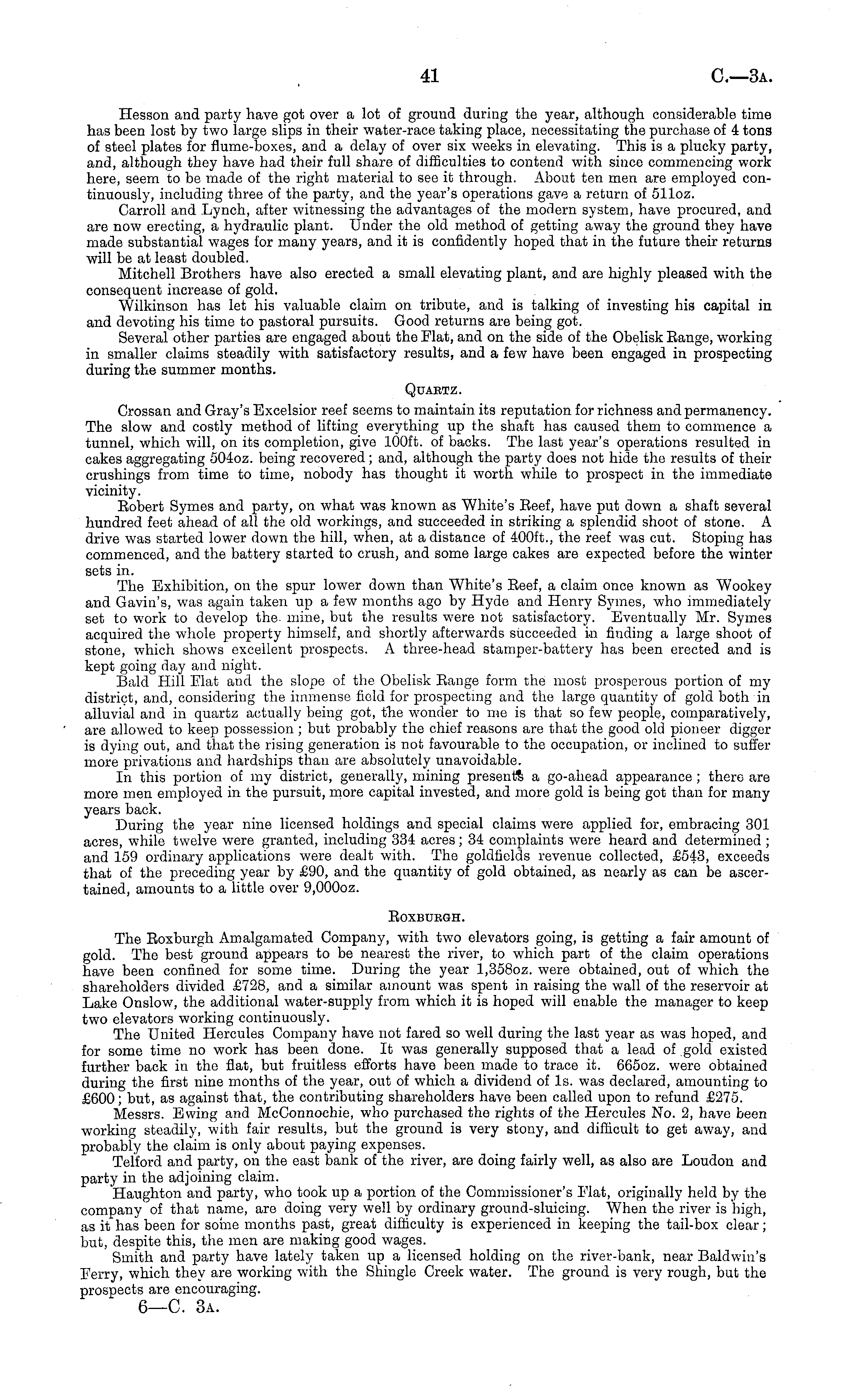 Hesson and party have got over a lot of groutid during the year, although considerable time has been lost by two large slips in their water-race taking place, necessitating the purchase of 4 tons of steel plates for flume-boxes, and a delay of over six weeks in elevating. This is a plucky party, and, although they have had their full share of difficulties to contend with since commencing work here, seem to be made of the right material to see it through. About ten men are employed continuously, including three of the party, and the year's operations gave a return of 511oz. Carroll and Lynch, after witnessing the advantages of the modern system, have procured, and are now erecting, a hydraulic plant. Under the old method of getting away the ground they have made substantial wages for many years, and it is confidently hoped that in the future their returns will be at least doubled. Mitchell Brothers have also erected a small elevating plant, and are highly pleased with the consequent increase of gold. Wilkinson has let his valuable claim on tribute, and is talking of investing his capital in and devoting his time to pastoral pursuits. Good returns are being got. Several other parties are engaged about the Flat, and on the side of the Obelisk Range, working in smaller claims steadily with satisfactory results, and a few have been engaged in prospecting during the summer months. Quaetz. Crossan and Gray's Excelsior reef seems to maintain its reputation for richness and permanency. The slow and costly method of lifting everything up the shaft has caused them to commence a tunnel, which will, on its completion, give lOOft. of backs. The last year's operations resulted in cakes aggregating 5040z. being recovered; and, although the party does not hide the results of their erushings from time to time, nobody has thought it worth while to prospect in the immediate vicinity. Bobert Symes and party, on what was known as White's Beef, have put down a shaft several hundred feet ahead of all the old workings, and succeeded in striking a splendid shoot of stone. A drive was started lower down the hill, when, at a distance of 400 ft., the reef was cut. Stoping has commenced, and the battery started to crush, and some large cakes are expected before the winter sets in. The Exhibition, on the spur lower down than White's Eeef, a claim once known as Wookey and Gavin's, was again taken up a few months ago by Hyde and Henry Symes, who immediately set to work to develop the mine, but the results were not satisfactory. Eventually Mr. Symes acquired the whole property himself, and shortly afterwards succeeded in finding a large shoot of stone, which shows excellent prospects. A three-head stamper-battery has been erected and is kept going day and night. Bald Hill Flat and the slope of the Obelisk Bange form the most prosperous portion of my district, and, considering the immense field for prospecting and the large quantity of gold both in alluvial and in quartz actually being got, the wonder to me is that so few people, comparatively, are allowed to keep possession ; but probably the chief reasons are that the good old pioneer digger is dying out, and that the rising generation is not favourable to the occupation, or inclined to suffer more privations and hardships than are absolutely unavoidable. In this portion of my district, generally, mining presents a go-ahead appearance ; there are more men employed in the pursuit, more capital invested, and more gold is being got than for many years back. During the year nine licensed holdings and special claims were applied for, embracing 301 acres, while twelve were granted, including 334 acres; 34 complaints were heard and determined ; and 159 ordinary applications were dealt with. The goldfields revenue collected, £543, exceeds that of the preceding year by £90, and the quantity of gold obtained, as nearly as can be ascertained, amounts to a little over 9,0000z. Boxbuegh. The Roxburgh Amalgamated Company, with two elevators going, is getting a fair amount of gold. The best ground appears to be nearest the river, to which part of the claim operations have been confined for some time. During the year 1,3580z. were obtained, out of which the shareholders divided £728, and a similar amount was spent in raising the wall of the reservoir at Lake Onslow, the additional water-supply from which it is hoped will enable the manager to keep two elevators working continuously. The United Hercules Company have not fared so well during the last year as was hoped, and for some time no work has been done. It was generally supposed that a lead of gold existed further back in the flat, but fruitless efforts have been made to trace it. 6650z. were obtained during the first nine months of the year, out of which a dividend of ls. was declared, amounting to £600; but, as against that, the contributing shareholders have been called upon to refund £275. Messrs. Ewing and McConnochie, who purchased the rights of the Hercules No. 2, have been working steadily, with fair results, but the ground is very stony, and difficult to get away, and probably the claim is only about paying expenses. Telford and party, on the east bank of the river, are doing fairly well, as also are Loudon and party in the adjoining claim. Haughton and party, who took up a portion of the Commissioner's Flat, originally held by the company of that name, are doing very well by ordinary ground-sluicing. When the river is high, as it has been for some months past, great difficulty is experienced in keeping the tail-box clear; but, despite this, the men are making good wages. Smith and party have lately taken up a licensed holding on the river-bank, near Baldwin's Ferry, which they are working with the Shingle Creek water. The ground is very rough, but the prospects are encouraging. 6—C. 3a.