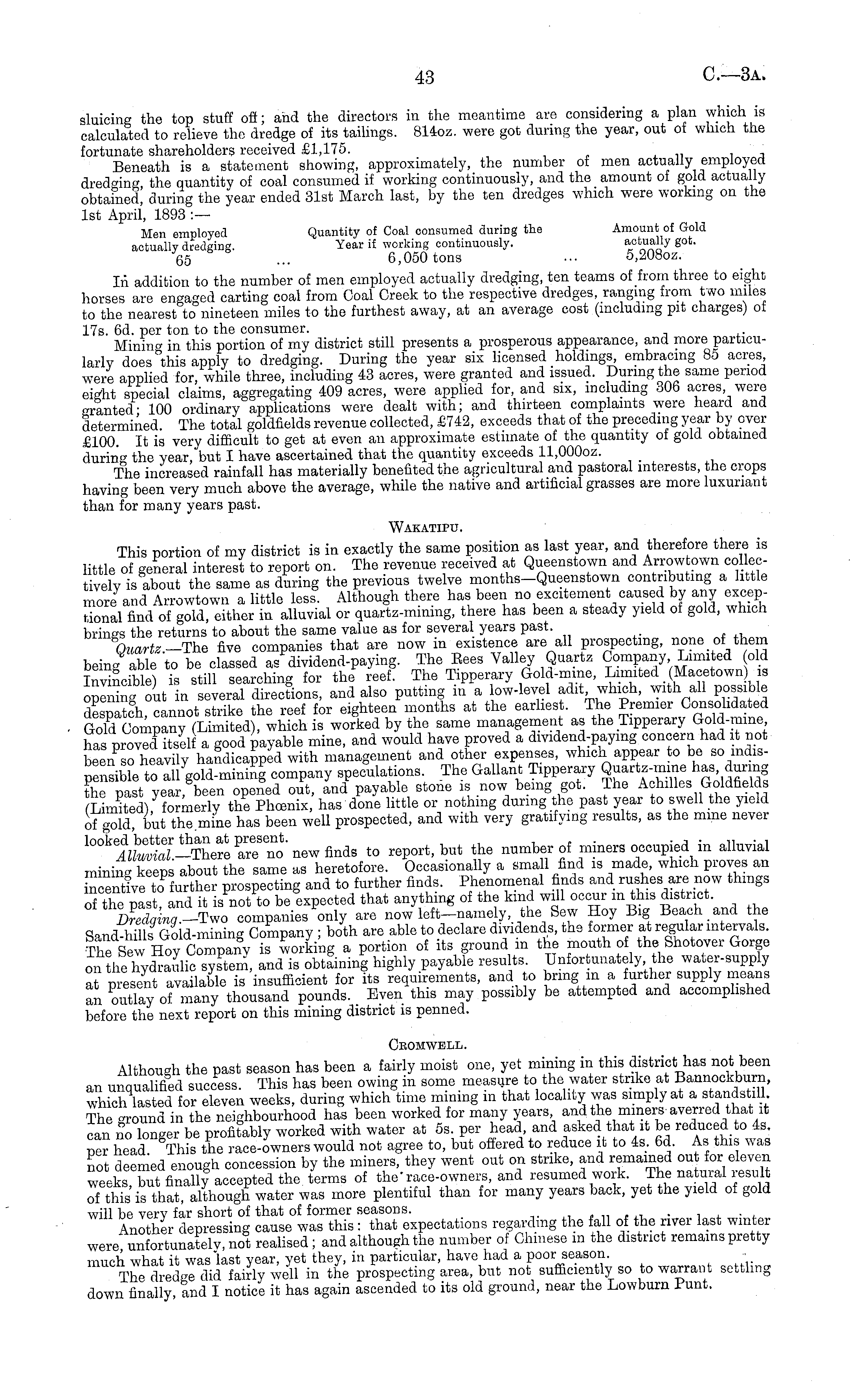 sluicing the top stuff oft; and the directors in the meantime are considering a plan whichi is calculated to relieve the dredge of its tailings. 814oz. were got during the year, out ot which the fortunate shareholders received £1,175. _ Beneath is a statement showing, approximately, the number of men actually employed dredging the quantity of coal consumed if working continuously, and the amount of gold actually obtained, during the year ended 31st March last, by the ten dredges which were working on the Ist April, 1893 :— Men employed Quantity of Coal consumed during the Amount of Gold actually dredging. Year if working continuously. ""J g ot> 65 ... 6,050 tons ... 5,2080z. lii addition to the number of men employed actually dredging, ten teams of from three to eight horses are engaged carting coal from Coal Creek to the respective dredges, ranging from two miles to the nearest to nineteen miles to the furthest away, at an average cost (including pit charges; ot 17s. 6d. per ton to the consumer. Mmm« in this portion of my district still presents a prosperous appearance, and more particularly does "this apply to dredging. During the year six licensed holdings, embracing 85 acres were applied for, while three, including 43 acres, were granted and issued. During the same period eight special claims, aggregating 409 acres, were applied for, and six, including 306 acres, were crranted- 100 ordinary applications were dealt with; and thirteen complaints were heard and determined The total goldfields revenue collected, £742, exceeds that of the preceding year by ever £100. It is very difficult to get at even an approximate estimate of the quantity of gold obtained during the year, but I have ascertained that the quantity exceeds ll,ooooz. The increased rainfall has materially benefited the agricultural and pastoral interests, the crops having been very much above the average, while the native and artificial grasses are more luxuriant than for many years past. Wakatipu. This portion of my district is in exactly the same position as last year, and therefore there is little of general interest to report on. The revenue received at Queenstown and Arrow own collectively is about the same as during the previous twelve months-Queenstown contributing a little more and Arrowtown a little less. Although there has been no excitement caused by any exceptional find of gold, either in alluvial or quartz-mining, there has been a steady yield of gold, which brings the returns to about the same value as for several years past. Quartz.-The five companies that are now in existence are all prospecting, none of them being able to be classed as dividend-paying. The Bees Valley Quartz Company Limited old Invincible) is still searching for the reef. The Tipperaxy Gold-mine, Limited (Macetown) is opening out in several directions, and also putting in a low-level adit which, with all possible despatch, cannot strike the reef for eighteen months at the earliest. The Premier Consolidated Gold Company (Limited), which is worked by the same management as the Tipperary Gold-mine has proved itself a good payable mine, and would have proved a dividend-paying concern had it not been so heavily handicapped with management and other expenses, which appear to be so indispensible to all gold-mining company speculations. The Gallant Tipperary has, during the past year, been opened out, and payable stone is now being got. The Achilles Goldfields limited) formerly the Phoenix, has done little or nothing during the past year to swell the yield of gold, but the mine has been well prospected, and with very gratifying results, as the mine never looked better than at present. , ~ . .. . , Alluvial -There are no new finds to report, but the number of miners occupied m alluvial mining keeps about the same as heretofore. Occasionally a small find is made, which proves an ncentive to further prospecting and to further finds. Phenomenal finds and rushes are now things o the past, and it is not to be expected that anything of the kind will occur in this district. Dodging.-Tsvo companies only are now left-namely, the Sew Hoy Big Beach and the Sand-hills Gold-mining Company ; both are able to declare dividends, the former at regular intervals. The Sew Hoy Company is working a portion of its ground in the mouth of the Shotover Gorge on the hydraulic system, and is obtaining highly payable results. Unfortunately the water-supply at present available is insufficient for its requirements, and to bring m a further supply means an outlay of many thousand pounds. Even this may possibly be attempted and accomplished before the next report on this mining district is penned. Cbomwell. Although the past season has been a fairly moist one, yet mining in this district has not been an unqualified success. This has been owing in some measure to the water strike at Bannockburn, which lasted for eleven weeks, during which time mining in that locality was simply at a standstill The "round in the neighbourhood has been worked for many years and the miners averred that it can no longer be profitably worked with water at ss. per head and asked that it be reduced to 4s. Per head This the race-owners would not agree to, but offered to reduce it to 4s. 6d. As this was not deemed enough concession by the miners, they went out on strike, and remained ou for eleven weeks but finally accepted the terms of the'race-owners, and resumed work. The natural result of this is that, although water was more plentiful than for many years back, yet the yield of gold will be very far short of that of former seasons. , Another depressing cause was this: that expectations regarding the fall of the river last winter were unfortunately, not realised; and although the number of Chinese m the district remains pretty much what it was last year, yet they, in particular, have had a poor season. _ _ The dredge did fairly well in the prospecting area, but not sufficiently so to warrant settl
