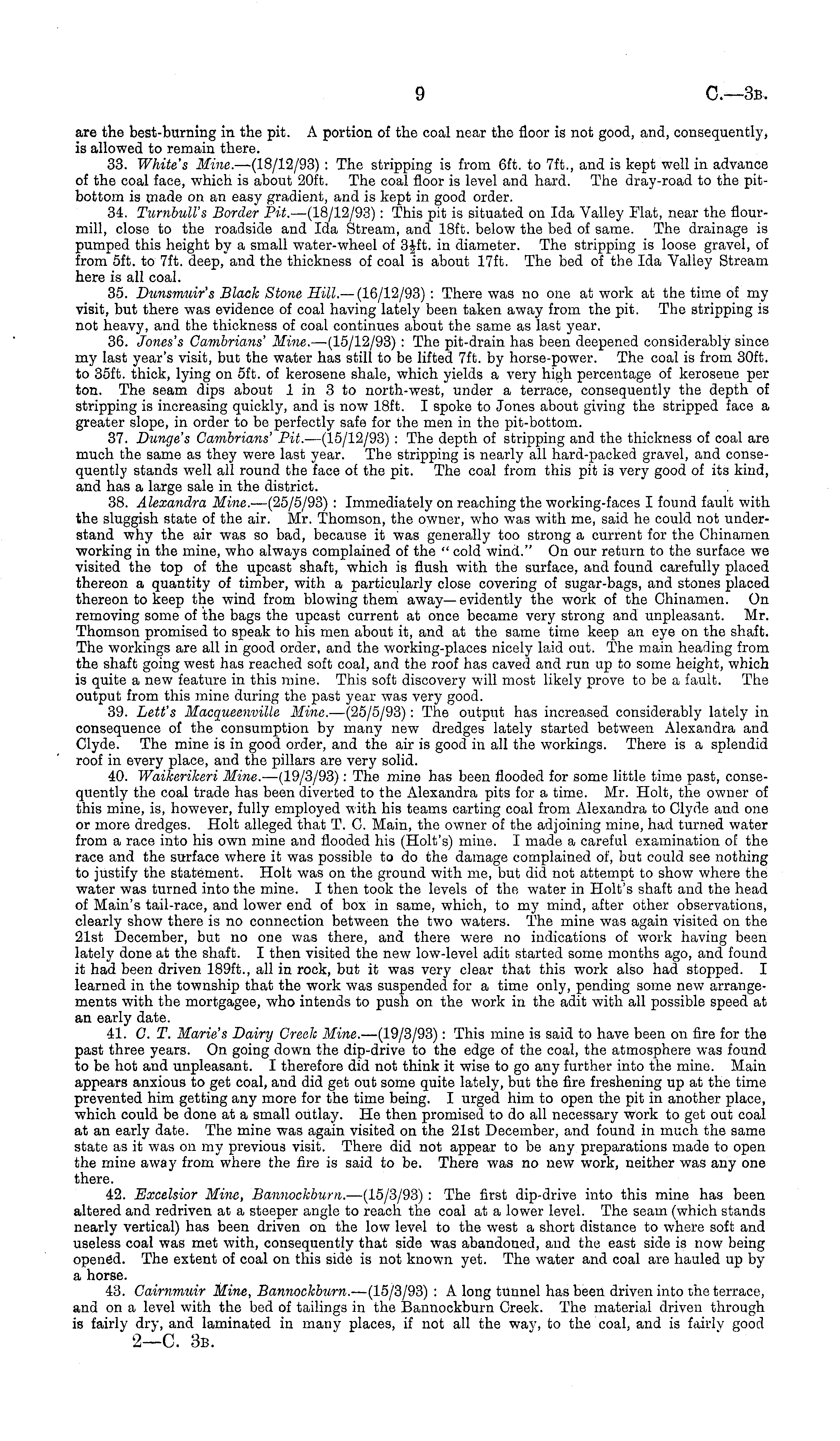 are the best-burning in the pit. A portion of the coal near the floor is not good, and, consequently, is allowed to remain there. 33. White's Mine. —(lß/12/93) : The stripping is from 6ft. to 7ft., and is kept well in advance of the coal face, which is about 20ft. The coal floor is level and hard. The dray-road to the pitbottom is made on an easy gradient, and is kept in good order. 34. Turnbull's Border Pit. —(lß/12/93): This pit is situated on Ida Valley Flat, near the flourmill, close to the roadside and Ida Stream, and 18ft. below the bed of same. The drainage is pumped this height by a small water-wheel of 3fft. in diameter. The stripping is loose gravel, of from sft. to 7ft. deep, and the thickness of coal is about 17ft. The bed of the Ida Valley Stream here is all coal. 35. Dunsmuir's Black Stone Hill. — (16/12/93) : There was no one at work at the time of my visit, but there was evidence of coal having lately been taken away from the pit. The stripping is not heavy, and the thickness of coal continues about the same as last year. 36. Jones's Cambrians' Mine. —(ls/12/93) : The pit-drain has been deepened considerably since my last year's visit, but the water has still to be lifted 7ft. by horse-power. The coal is from 30ft. to 35ft. thick, lying on sft. of kerosene shale, which yields a very high percentage of kerosene per ton. The seam dips about 1 in 3 to north-west, under a terrace, consequently the depth of stripping is increasing quickly, and is now 18ft. I spoke to Jones about giving the stripped face a greater slope, in order to be perfectly safe for the men in the pit-bottom. 37. Dunge's Cambrians' Pit. —(ls/12/93) : The depth of stripping and the thickness of coal are much the same as they were last year. The stripping is nearly all hard-packed gravel, and consequently stands well all round the face of the pit. The coal from this pit is very good of its kind, and has a large sale in the district. 38. Alexandra Mine.— (2s/5/93) : Immediately on reaching the working-faces I found fault with the sluggish state of the air. Mr. Thomson, the owner, who was with me, said he could not understand why the air was so bad, because it was generally too strong a current for the Chinamen working in the mine, who always complained of the " cold wind." On our return to the surface we visited the top of the upcast shaft, which is flush with the surface, and found carefully placed thereon a quantity of timber, with a particularly close covering of sugar-bags, and stones placed thereon to keep the wind from blowing them away— evidently the work of the Chinamen. On removing some of the bags the upcast current at once became very strong and unpleasant. Mr. Thomson promised to speak to his men about it, and at the same time keep an eye on the shaft. The workings are all in good order, and the working-places nicely laid out. The main heading from the shaft going west has reached soft coal, and the roof has caved and run up to some height, which is quite a new feature in this mine. This soft discovery will most likely prove to be a fault. The output from this mine during the past year was very good. 39. Lett's Macaueenville Mine. —(2s/5/93): The output has increased considerably lately in consequence of the consumption by many new dredges lately started between Alexandra and Clyde. The mine is in good order, and the air is good in all the workings. There is a splendid roof in every place, and the pillars are very solid. 40. Waikerikeri Mine. —(19/3/93): The mine has been flooded for some little time past, consequently the coal trade has been diverted to the Alexandra pits for a time. Mr. Holt, the owner of this mine, is, however, fully employed with his teams carting coal from Alexandra to Clyde and one or more dredges. Holt alleged that T. C. Main, the owner of the adjoining mine, had turned water from a race into his own mine and flooded his (Holt's) mine. I made a careful examination of the race and the surface where it was possible to do the damage complained of, but could see nothing to justify the statement. Holt was on the ground with me, but did not attempt to show where the water was turned into the mine. I then took the levels of the water in Holt's shaft and the head of Main's tail-race, and lower end of box in same, which, to my mind, after other observations, clearly show there is no connection between the two waters. The mine was again visited on the 21st December, but no one was there, and there were no indications of work having been lately done at the shaft. I then visited the new low-level adit started some months ago, and found it had been driven 189 ft., all in rock, but it was very clear that this work also had stopped. I learned in the township that the work was suspended for a time only, pending some new arrangements with the mortgagee, who intends to push on the work in the adit with all possible speed at an early date. 41. C. T. Marie's Dairy Creek Mine. —(l 9/3/93): This mine is said to have been on fire for the past three years. On going down the dip-drive to the edge of the coal, the atmosphere was found to be hot and unpleasant. I therefore did not think it wise to go any further into the mine. Main appears anxious to get coal, and did get out some quite lately, but the fire freshening up at the time prevented him getting any more for the time being. I urged him to open the pit in another place, which could be done at a small outlay. He then promised to do all necessary work to get out coal at an early date. The mine was again visited on the 21st December, and found in much the same state as it was on my previous visit. There did not appear to be any preparations made to open the mine away from where the fire is said to be. There was no new work, neither was any one there. 42. Excelsior Mine, Bannockburn. —(ls/3/93) : The first dip-drive into this mine has been altered and redriven at a steeper angle to reach the coal at a lower level. The seam