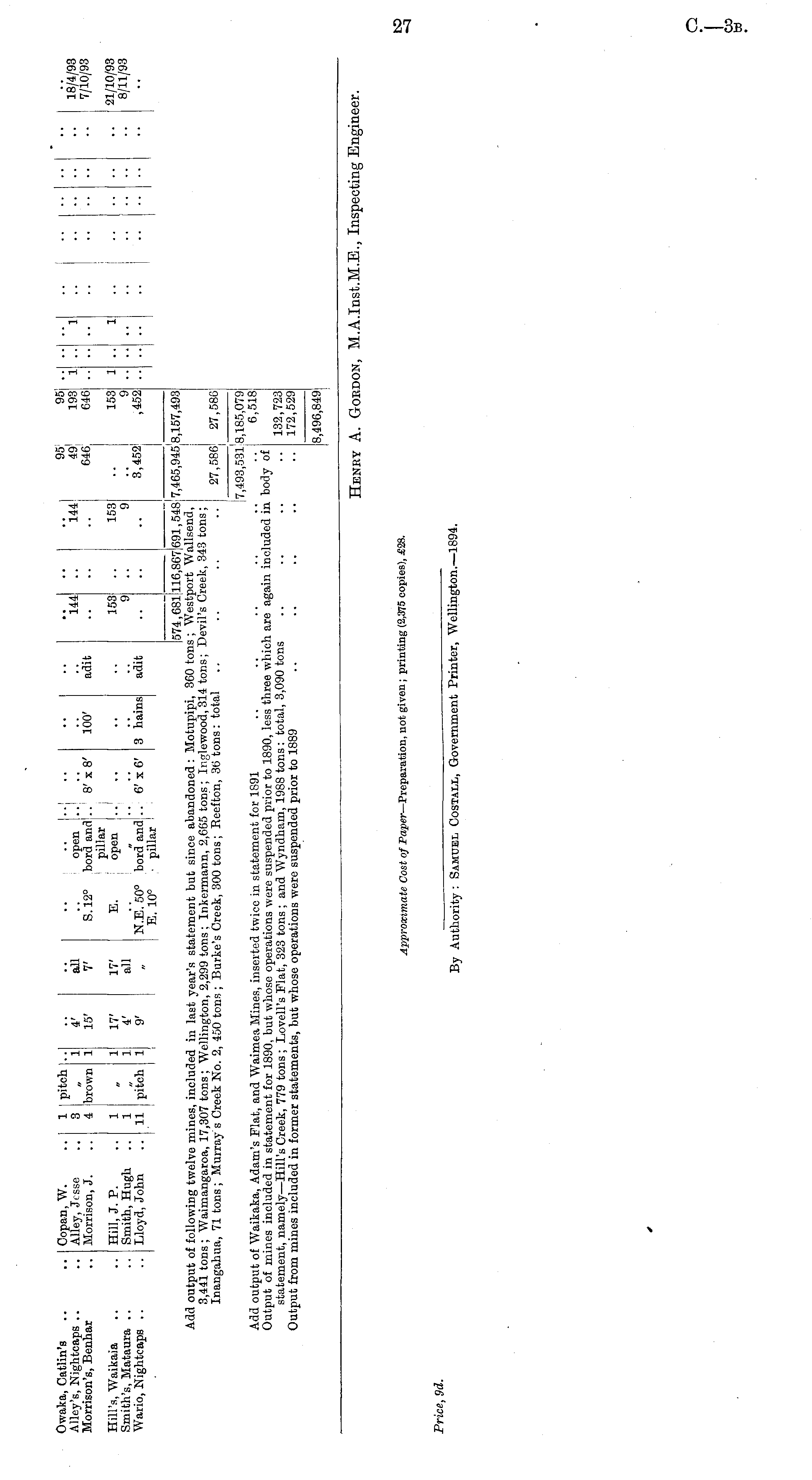 Owaka, Catlin's .. .. Copan, W. .. 11 Alley's, Nightcaps .. .. Alle} 7 , Jesse .. 3 Morrison's, Benhar .. Morrison, J. .. 4 Hill's, Waikaia .. .. Hill, J. P. .. 1 Smith's, Mataura .. .. Smith, Hugh .. 1 Wario, Nightcaps .. .. Lloyd, John .. 11 1 3 4 1 1 11 pitch brown 1 1 1 1 4' 15' 17' 4' 9' ail 17' all open S. 12° bord and .. 8' x 8' 100' pillar E. open N.E. 50° bord and .. 6' x 6' 3 hains E. 10° ■ pillar •• adit 'l44 153 9 '144' i ■• 153 9l I 95 95 49! 193 646; 646 :: X 1 3,452' ,452 17,465,9458,157,493 1 1 "l 1 18/4/9! 7/10/9: 21/10/91 8/II/9: pitch adit Add output of following twelve mines, 3,441 tons ; Waimangaroa, 17,307 Inangahua, 71 tons ; Murray's Cr in last i sllington, 450 tons year's sta "2,299 ton ;; Burke's ■tement but since abandoned: Motupipi, is ; Inkermann, 2,685 tons ; Iiiftlewood, 31 s Creek, 300 tons; Reefton, 36 tons: tota 360 tons .4 tons; T ,1 .. 574,681 5; West] 5evil's C 1116,867, port We ireek, 34 i 691, 548 ] xllsend, i 8 tons; , includ tons; •eek No. ed 27,586' 27,58C; 7,493,5318,185,079 6,518 body of Add output of Waikaka, Adam's Flat, Output of mines included in statemei statement, namely —Hill's Creek, Output from mines included in former and Wi nt for 1; 779 ton : staterr ,ir !9( iea Mine; ), but wh Lovell's .ts, but w s, inserted ose operal Flat, 323 'hose opor 1 twice in statement for 1891 tions were suspended prior to 1890, less trj tons ; and Wyndham, 1988 tons : total, 3 ■ations were suspended prior to 1889 iree wliicl 3,090 tons h are ag ;ain inc] luded in ier .. 132,723 .. 172,529 8,496,849
