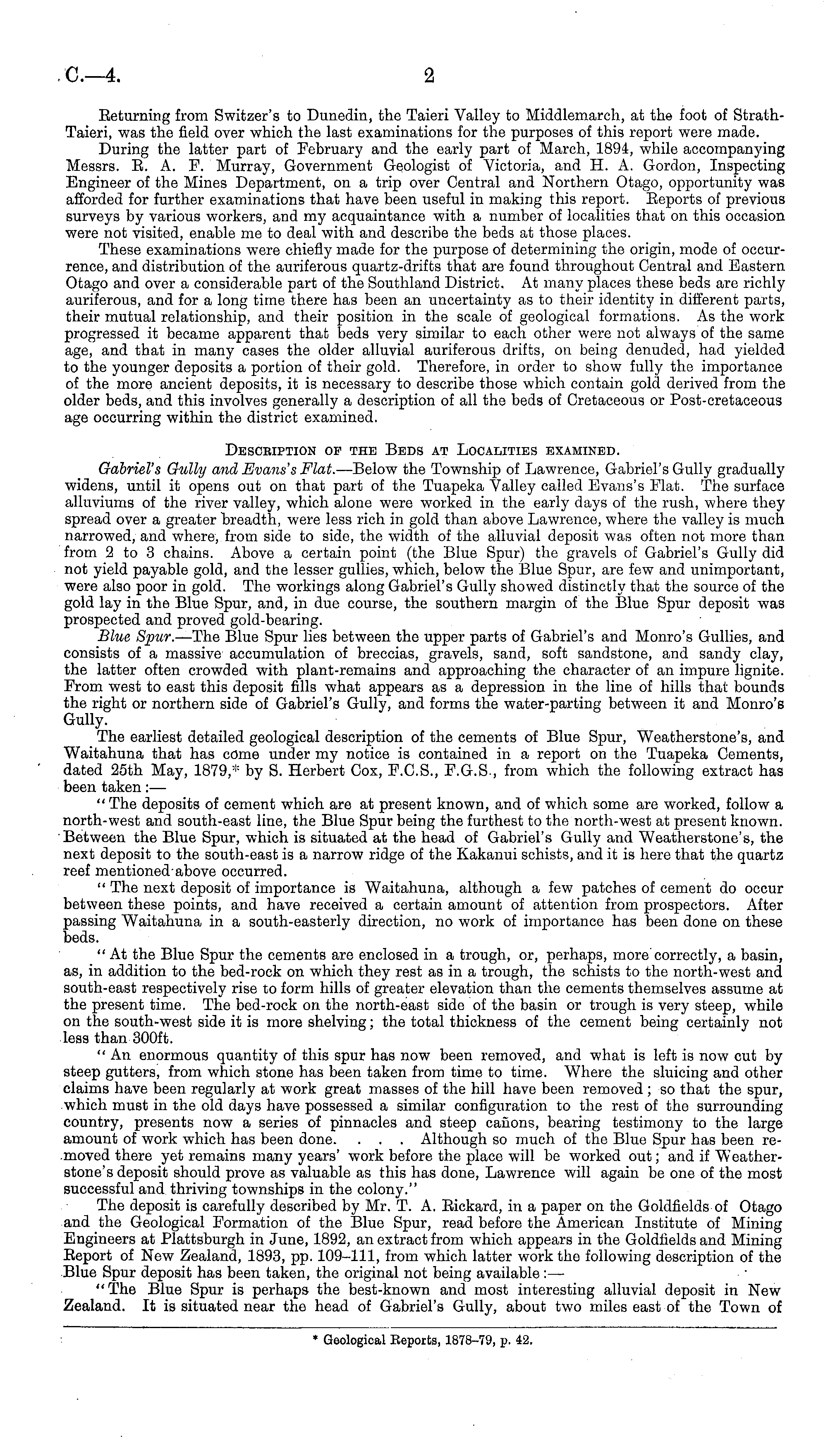 Beturning from Switzer's to Dunedin, the Taieri Valley to Middlemarch, at the foot of StrathTaieri, was the field over which the last examinations for the purposes of this report were made. During the latter part of February and the early part of March, 1894, while accompanying Messrs. B. A. F. Murray, Government Geologist of Victoria, and H. A. Gordon, Inspecting Engineer of the Mines Department, on a trip over Central and Northern Otago, opportunity was afforded for further examinations that have been useful in making this report. Beports of previous surveys by various workers, and my acquaintance with a number of localities that on this occasion were not visited, enable me to deal with and describe the beds at those places. These examinations were chiefly made for the purpose of determining the origin, mode of occurrence, and distribution of the auriferous quartz-drifts that are found throughout Central and Eastern Otago and over a considerable part of the Southland District. At many places these beds are richly auriferous, and for a long time there has been an uncertainty as to their identity in different parts, their mutual relationship, and their position in the scale of geological formations. As the work progressed it became apparent that beds very similar to each other were not always of the same age, and that in many cases the older alluvial auriferous drifts, on being denuded, had yielded to the younger deposits a portion of their gold. Therefore, in order to show fully the importance of the more ancient deposits, it is necessary to describe those which contain gold derived from the older beds, and this involves generally a description of all the beds of Cretaceous or Post-cretaceous age occurring within the district examined. Description op the Beds at Localities examined. Gabriel's Gully and Evans's Flat. —Below the Township of Lawrence, Gabriel's Gully gradually widens, until it opens out on that part of the Tuapeka Valley called Evans's Flat. The surface alluviums of the river valley, which alone were worked in the early days of the rush, where they spread over a greater breadth, were less rich in gold than above Lawrence, where the valley is much narrowed, and where, from side to side, the width of the alluvial deposit was often not more than from 2 to 3 chains. Above a certain point (the Blue Spur) the gravels of Gabriel's Gully did not yield payable gold, and the lesser gullies, which, below the Blue Spur, are few and unimportant, were also poor in gold. The workings along Gabriel's Gully showed distinctly that the source of the gold lay in the Blue Spur, and, in due course, the southern margin of the Blue Spur deposit was prospected and proved gold-bearing. Blue Spur. —The Blue Spur lies between the upper parts of Gabriel's and Monro's Gullies, and consists of a massive accumulation of breccias, gravels, sand, soft sandstone, and sandy clay, the latter often crowded with plant-remains and approaching the character of an impure lignite. From west to east this deposit fills what appears as a depression in the line of hills that bounds the right or northern side of Gabriel's Gully, and forms the water-parting between it and Monro's Gully. The earliest detailed geological description of the cements of Blue Spur, Weatherstone's, and Waitahuna that has come under my notice is contained in a report on the Tuapeka Cements, dated 25th May, 1879,* by S. Herbert Cox, F.C.S., F.G.S., from which the following extract has been taken:— " The deposits of cement which are at present known, and of which some are worked, follow a north-west and south-east line, the Blue Spur being the furthest to the north-west at present known. Between the Blue Spur, which is situated at the head of Gabriel's Gully and Weatherstone's, the next deposit to the south-east is a narrow ridge of the Kakanui schists, and it is here that the quartz reef mentioned above occurred. " The next deposit of importance is Waitahuna, although a few patches of cement do occur between these points, and have received a certain amount of attention from prospectors. After passing Waitahuna in a south-easterly direction, no work of importance has been done on these beds. " At the Blue Spur the cements are enclosed in a trough, or, perhaps, more correctly, a basin, as, in addition to the bed-rock on which they rest as in a trough, the schists to the north-west and south-east respectively rise to form hills of greater elevation than the cements themselves assume at the present time. The bed-rock on the north-east side of the basin or trough is very steep, while on the south-west side it is more shelving; the total thickness of the cement being certainly not less than 300 ft. " An enormous quantity of this spur has now been removed, and what is left is now cut by steep gutters, from which stone has been taken from time to time. Where the sluicing and other claims have been regularly at work great masses of the hill have been removed ; so that the spur, which must in the old days have possessed a similar configuration to the rest of the surrounding country, presents now a series of pinnacles and steep canons, bearing testimony to the large amount of work which has been done. . . . Although so much of the Blue Spur has been removed there yet remains many years' work before the place will be worked out; and if Weatherstone's deposit should prove as valuable as this has done, Lawrence will again be one of the most successful and thriving townships in the colony." The deposit is carefully described by Mr. T. A. Bickard, in a paper on the Goldfields of Otago and the Geological Formation of the Blue Spur, read before the American Institute of Mining Engineers at Plattsburgh in June, 1892, an extract from which appears in the Goldfields and Mining Beport of New Zealand, 1893, pp. 109-111, from which latter work the following description of the Blue Spur deposit has been taken, the original not being available: — "The Blue Spur is