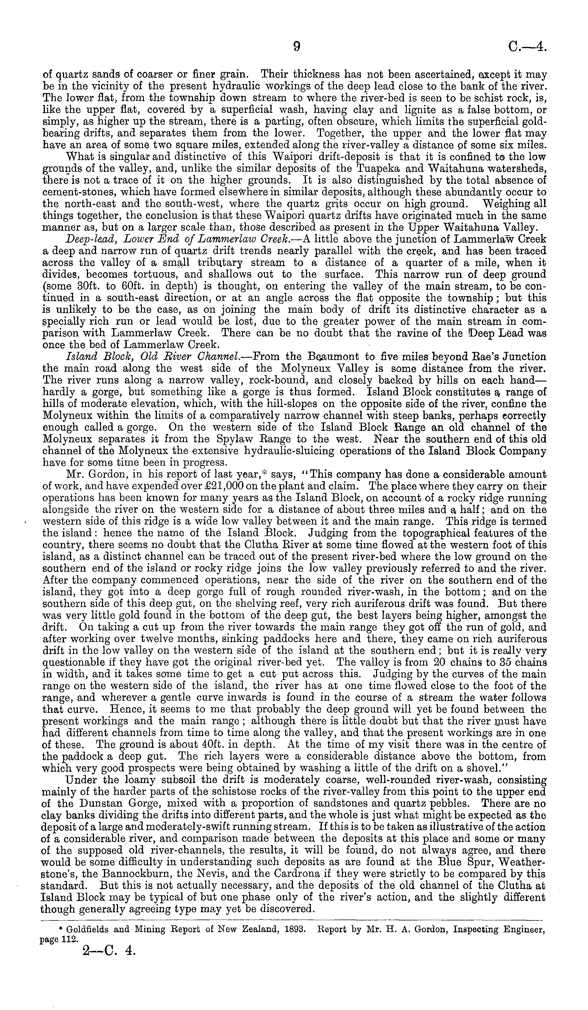 of quartz sands of coarser or finer grain. Their thickness has not been ascertained, except it may be in the vicinity of the present hydraulic workings of the deep lead close to the bank of the river. The lower flat, from the township down stream to where the river-bed is seen to be schist rock, is, like the upper flat, covered by a superficial wash, having clay and lignite as a false bottom, or simply, as higher up the stream, there is a parting, often obscure, which limits the superficial goldbearing drifts, and separates them from the lower. Together, the upper and the lower flat may have an area of some two square miles, extended along the river-valley a distance of some six miles. What is singular and distinctive of this Waipori drift-deposit is that it is confined to the low grounds of the valley, and, unlike the similar deposits of the Tuapeka and Waitahuna watersheds, there is not a trace of it on the higher grounds. It is also distinguished by the total absence of cement-stones, which have formed elsewhere in similar deposits, although these abundantly occur to the north-east and the south-west, where the quartz grits occur on high ground. Weighing all things together, the conclusion is that these Waipori quartz drifts have originated much in the same manner as, but on a larger scale than, those described as present in the Upper Waitahuna Valley. Deep-lead, Lower End of Lammerlaw Creek. —A little above the junction of Lammerlaw Creek a deep and narrow run of quartz drift trends nearly parallel with the creek, and has been traced across the valley of a small tributary stream to a distance of a quarter of a mile, when it divides, becomes tortuous, and shallows out to the surface. This narrow run of deep ground (some 30ft. to 60ft. in depth) is thought, on entering the valley of the main stream, to be continued in a south-east direction, or at an angle across the flat opposite the township; but this is unlikely to be the case, as on joining the main body of drift its distinctive character as a specially rich run or lead would be lost, due to the greater power of the main stream in comparison with Lammerlaw Creek. There can be no doubt that the ravine of the Deep Lead was once the bed of Lammerlaw Creek. Island Block, Old River Channel. —From the Beaumont to five miles beyond Bae's Junction the main road along the west side of the Molyneux Valley is some distance from the river. The river runs along a narrow valley, rock-bound, and closely backed by hills on each hand— hardly a gorge, but something like a gorge is thus formed. Island Block constitutes a, range of hills of moderate elevation, which, with the hill-slopes on the opposite side of the river, confine the Molyneux within the limits of a comparatively narrow channel with steep banks, perhaps correctly enough called a gorge. On the western side of the Island Block Bange an old channel of the Molyneux separates it from the Spylaw Bange to the west. Near the southern end of this old channel of the Molyneux the extensive hydraulic-sluicing operations of the Island Block Company have for some time been in progress. Mr. Gordon, in his report of last year,* says, "This company has done a considerable amount of work, and have expended over £21,000 on the plant and claim. The place where they carry on their operations has been known for many years as the Island Block, on account of a rocky ridge running alongside the river on the western side for a distance of about three miles and a half; and on the western side of this ridge is a wide low valley between it and the main range. This ridge is termed the island: hence the name of the Island Block. Judging from the topographical features of the country, there seems no doubt that the Clutha Biver at some time flowed at the western foot of this island, as a distinct channel can be traced out of the present river-bed where the low ground on the southern end of the island or rocky ridge joins the low valley previously referred to and the river. After the company commenced operations, near the side of the river on the southern end of the island, they got into a deep gorge full of rough rounded river-wash, in the bottom; and on the southern side of this deep gut, on the shelving reef, very rich auriferous drift was found. But there was very little gold found in the bottom of the deep gut, the best layers being higher, amongst the drift. On taking a cut up from the river towards the main range they got off the run of gold, and after working over twelve months, sinking paddocks here and there, they came on rich auriferous drift in the low valley on the western side of the island at the southern end; but it is really very questionable if they have got the original river-bed yet. The valley is from 20 chains to 35 chains in width, and it takes some time to get a cut put across this. Judging by the curves of the main range on the western side of the island, the river has at one time flowed close to the foot of the range, and wherever a gentle curve inwards is found in the course of a stream the water follows that curve. Hence, it seems to me that probably the deep ground will yet be found between the present workings and the main range ; although there is little doubt but that the river must have had different channels from time to time along the valley, and that the present workings are in one of these. The ground is about 40ft. in depth. At the time of my visit there was in the centre of the paddock a deep gut. The rich layers were a considerable distance above the bottom, from which very good prospects were being obtained by washing a little of the drift on a shovel." Under the loamy subsoil the drift is moderately coarse, well-rounded river-wash, consisting mainly of the harder parts of the schistose rocks of the river-valley from this point to the upper end of the Dunstan Gorge, mixed with a proportion of sandstones and quartz pebbles. There are no clay banks dividing the drifts into 