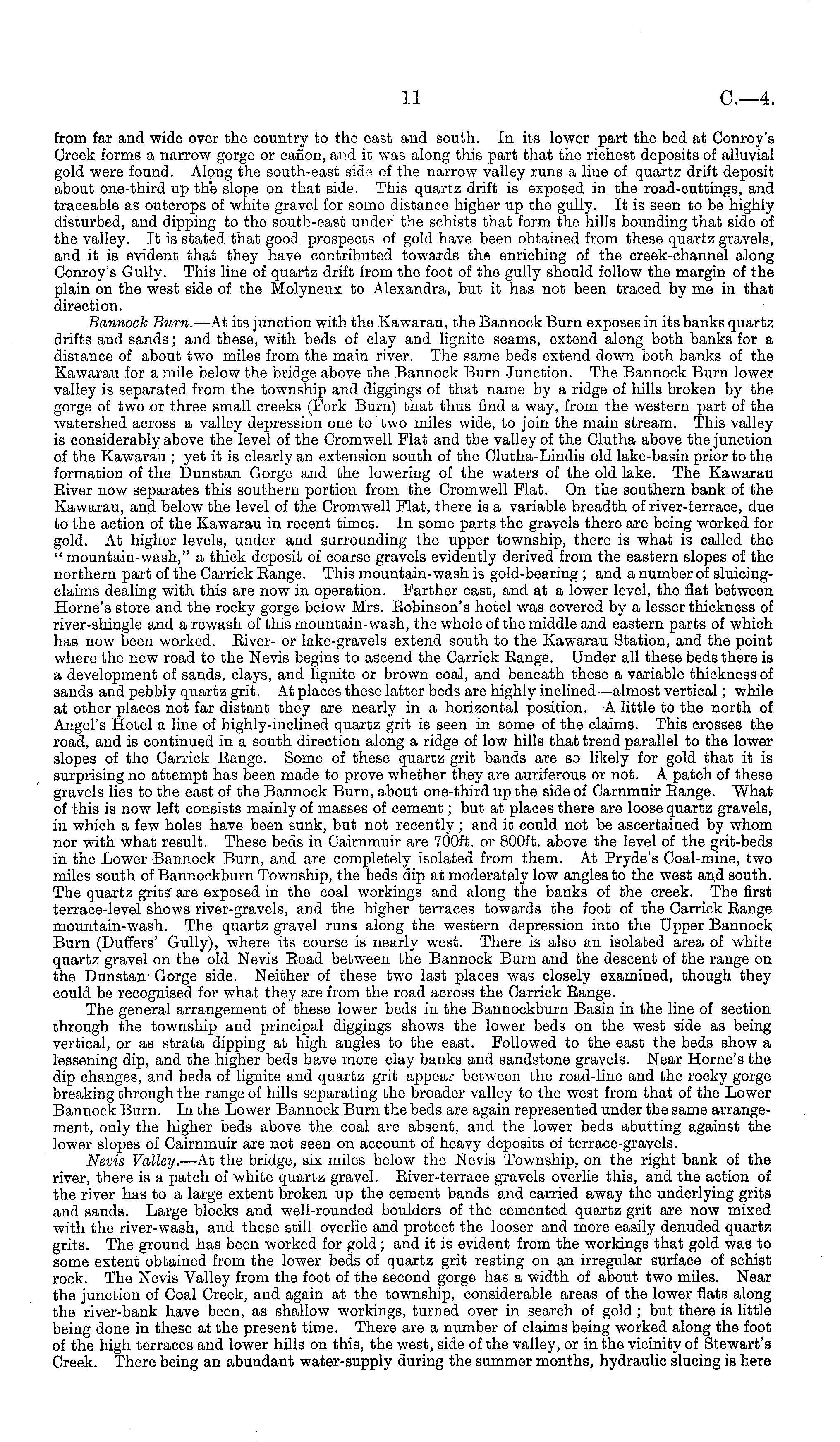 from far and wide over the country to the east and south. In its lower part the bed at Conroy's Creek forms a narrow gorge or canon, and it was along this part that the richest deposits of alluvial gold were found. Along the south-east side of the narrow valley runs a line of quartz drift deposit about one-third up the slope on that side. This quartz drift is exposed in the road-cuttings, and traceable as outcrops of white gravel for some distance higher up the gully. It is seen to be highly disturbed, and dipping to the south-east under' the schists that form the hills bounding that side of the valley. It is stated that good prospects of gold have been obtained from these quartz gravels, and it is evident that they have contributed towards the enriching of the creek-channel along Conroy's Gully. This line of quartz drift from the foot of the gully should follow the margin of the plain on the west side of the Molyneux to Alexandra, but it has not been traced by me in that direction. Bannock Burn. —At its junction with the Kawarau, the Bannock Burn exposes in its banks quartz drifts and sands; and these, with beds of clay and lignite seams, extend along both banks for a distance of about two miles from the main river. The same beds extend down both banks of the Kawarau for a mile below the bridge above the Bannock Burn Junction. The Bannock Burn lower valley is separated from the township and diggings of that name by a ridge of hills broken by the gorge of two or three small creeks (Fork Burn) that thus find a way, from the western part of the watershed across a valley depression one to two miles wide, to join the main stream. This valley is considerably above the level of the Cromwell Flat and the valley of the Clutha above the junction of the Kawarau ; yet it is clearly an extension south of the Clutha-Lindis old lake-basin prior to the formation of the Dunstan Gorge and the lowering of the waters of the old lake. The Kawarau Biver now separates this southern portion from the Cromwell Flat. On the southern bank of the Kawarau, and below the level of the Cromwell Flat, there is a variable breadth of river-terrace, due to the action of the Kawarau in recent times. In some parts the gravels there are being worked for gold. At higher levels, under and surrounding the upper township, there is what is called the " mountain-wash," a thick deposit of coarse gravels evidently derived from the eastern slopes of the northern part of the Carrick Bange. This mountain-wash is gold-bearing ; and a number of sluicingclaims dealing with this are now in operation. Farther east, and at a lower level, the flat between Home's store and the rocky gorge below Mrs. Bobinson's hotel was covered by a lesser thickness of river-shingle and a rewash of this mountain-wash, the whole of the middle and eastern parts of which has now been worked. Biver- or lake-gravels extend south to the Kawarau Station, and the point where the new road to the Nevis begins to ascend the Carrick Bange. Under all these beds there is a development of sands, clays, and lignite or brown coal, and beneath these a variable thickness of sands and pebbly quartz grit. At places these latter beds are highly inclined—almost vertical; while at other places not far distant they are nearly in a horizontal position. A little to the north of Angel's Hotel a line of highly-inclined quartz grit is seen in some of the claims. This crosses the road, and is continued in a south direction along a ridge of low hills that trend parallel to the lower slopes of the Carrick Bange. Some of these quartz grit bands are so likely for gold that it is surprising no attempt has been made to prove whether they are auriferous or not. A patch of these gravels lies to the east of the Bannock Burn, about one-third up the side of Carnmuir Bange. What of this is now left consists mainly of masses of cement; but at places there are loose quartz gravels, in which a few holes have been sunk, but not recently ; and it could not be ascertained by whom nor with what result. These beds in Cairnmuir are 700 ft. or 800 ft. above the level of the grit-beds in the Lower Bannock Burn, and are completely isolated from them. At Pryde's Coal-mine, two miles south of Bannockburn Township, the beds dip at moderately low angles to the west and south. The quartz grits' are exposed in the coal workings and along the banks of the creek. The first terrace-level shows river-gravels, and the higher terraces towards the foot of the Carrick Bange mountain-wash. The quartz gravel runs along the western depression into the Upper Bannock Burn (Duffers' Gully), where its course is nearly west. There is also an isolated area of white quartz gravel on the old Nevis Boad between the Bannock Burn and the descent of the range on the Dunstan- Gorge side. Neither of these two last places was closely examined, though they could be recognised for what they are from the road across the Carrick Bange. The general arrangement of these lower beds in the Bannockburn Basin in the line of section through the township and principal diggings shows the lower beds on the west side as being vertical, or as strata dipping at high angles to the east. Followed to the east the beds show a lessening dip, and the higher beds have more clay banks and sandstone gravels. Near Home's the dip changes, and beds of lignite and quartz grit appear between the road-line and the rocky gorge breaking through the range of hills separating the broader valley to the west from that of the Lower Bannock Burn. In the Lower Bannock Burn the beds are again represented under the same arrangement, only the higher beds above the coal are absent, and the lower beds abutting against the lower slopes of Cairnmuir are not seen on account of heavy deposits of terrace-gravels. Nevis Valley. —At the bridge, six miles below the Nevis Township, on the right bank of the river, there is a patch of white quartz gravel. Biver-terrace gravels overlie this, and t