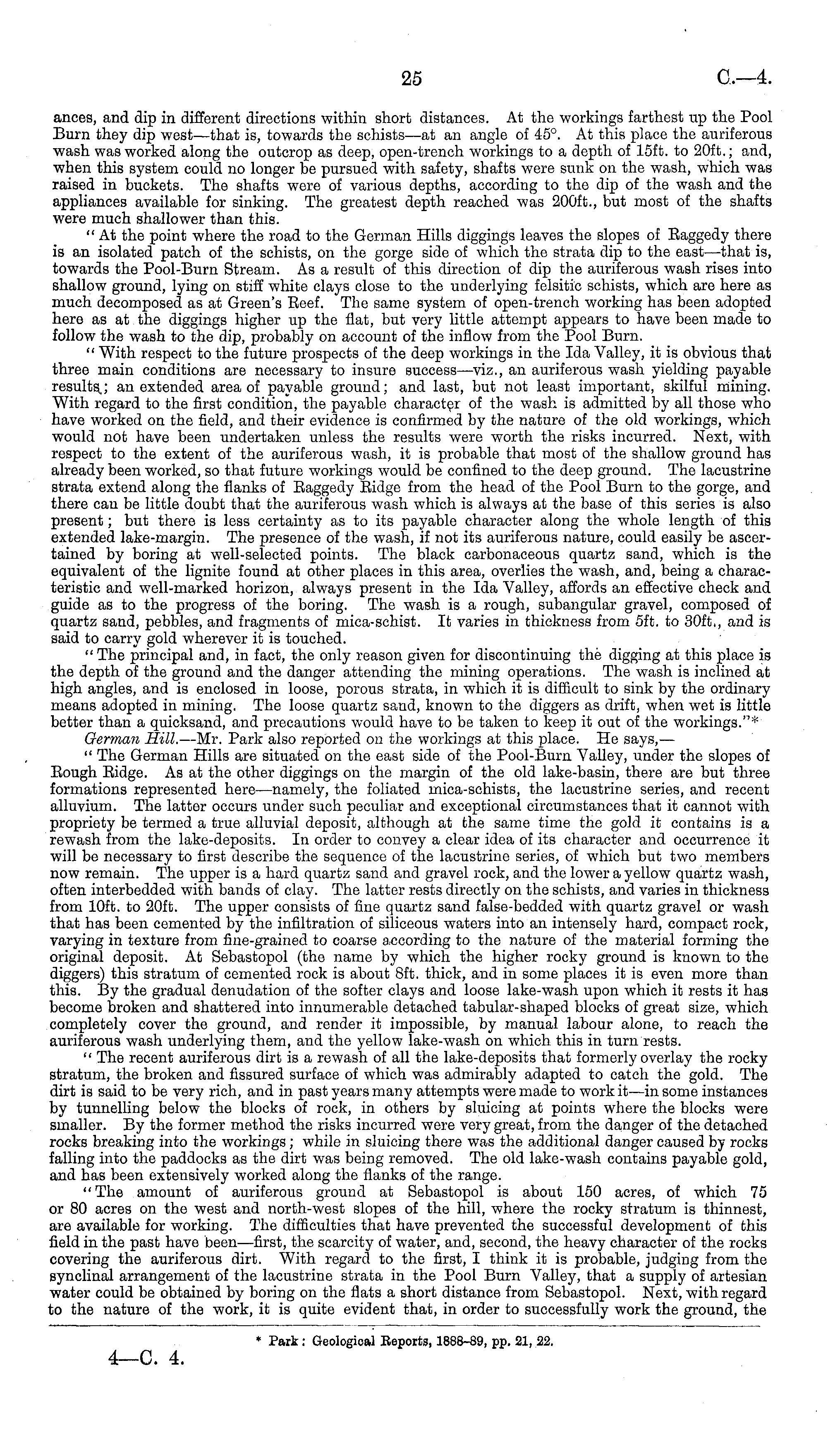 ances, and dip in different directions within short distances. At the workings farthest up the Pool Burn they dip west—that is, towards the schists—at an angle of 45°. At this place the auriferous wash was worked along the outcrop as deep, open-trench workings to a depth of 15ft. to 20ft.; and, when this system could no longer be pursued with safety, shafts were sunk on the wash, which was raised in buckets. The shafts were of various depths, according to the dip of the wash and the appliances available for sinking. The greatest depth reached was 200 ft., but most of the shafts were much shallower than this. " At the point where the road to the German Hills diggings leaves the slopes of Baggedy there is an isolated patch of the schists, on the gorge side of which the strata dip to the east—that is, towards the Pool-Burn Stream. As a result of this direction of dip the auriferous wash rises into shallow ground, lying on stiff white clays close to the underlying felsitic schists, which are here as much decomposed as at Green's Beef. The same system of open-trench working has been adopted hero as at the diggings higher up the flat, but very little attempt appears to have been made to follow the wash to the dip, probably on account of the inflow from the Pool Burn. " With respect to the future prospects of the deep workings in the Ida Valley, it is obvious that three main conditions are necessary to insure success—viz., an auriferous wash yielding payable results; an extended area of payable ground; and last, but not least important, skilful mining. With regard to the first condition, the payable character of the wash is admitted by all those who have worked on the field, and their evidence is confirmed by the nature of the old workings, which would not have been undertaken unless the results were worth the risks incurred. Next, with respect to the extent of the auriferous wash, it is probable that most of the shallow ground has already been worked, so that future workings would be confined to the deep ground. The lacustrine strata extend along the flanks of Baggedy Bidge from the head of the Pool Burn to the gorge, and there can be little doubt that the auriferous wash which is always at the base of this series is also present; but there is less certainty as to its payable character along the whole length of this extended lake-margin. The presence of the wash, if not its auriferous nature, could easily be ascertained by boring at well-selected points. The black carbonaceous quartz sand, which is the equivalent of the lignite found at other places in this area, overlies the wash, and, being a characteristic and well-marked horizon, always present in the Ida Valley, affords an effective check and guide as to the progress of the boring. The wash is a rough, subangular gravel, composed of quartz sand, pebbles, and fragments of mica-schist. It varies in thickness from sft. to 30ft., and is said to carry gold wherever it is touched. " The principal and, in fact, the only reason given for discontinuing the digging at this place is the depth of the ground and the danger attending the mining operations. The wash is inclined at high angles, and is enclosed in loose, porous strata, in which it is difficult to sink by the ordinary means adopted in mining. The loose quartz sand, known to the diggers as drift, when wet is little better than a quicksand, and precautions would have to be taken to keep it out of the workings."* German Hill. —Mr. Park also reported on the workings at this place. He says,— " The German Hills are situated on the east side of the Pool-Burn A 7 alley, under the slopes of Bough Bidge. As at the other diggings on the margin of the old lake-basin, there are but three formations represented here —namely, the foliated mica-schists, the lacustrine series, and recent alluvium. The latter occurs under such peculiar and exceptional circumstances that it cannot with propriety be termed a true alluvial deposit, although at the same time the gold it contains is a rewash from the lake-deposits. In order to convey a clear idea of its character and occurrence it will be necessary to first describe the sequence of the lacustrine series, of which but two members now remain. The upper is a hard quartz sand and gravel rock, and the lower a yellow quartz wash, often interbedded with bands of clay. The latter rests directly on the schists, and varies in thickness from 10ft. to 20ft. The upper consists of fine quartz sand false-bedded with quartz gravel or wash that has been cemented by the infiltration of siliceous waters into an intensely hard, compact rock, varying in texture from fine-grained to coarse according to the nature of the material forming the original deposit. At Sebastopol (the name by which the higher rocky ground is known to the diggers) this stratum of cemented rock is about Bft. thick, and in some places it is even more than this. By the gradual denudation of the softer clays and loose lake-wash upon which it rests it has become broken and shattered into innumerable detached tabular-shaped blocks of great size, which completely cover the ground, and render it impossible, by manual labour alone, to reach the auriferous wash underlying them, and the yellow lake-wash on which this in turn rests. " The recent auriferous dirt is a rewash of all the lake-deposits that formerly overlay the rocky stratum, the broken and fissured surface of which was admirably adapted to catch the gold. The dirt is said to be very rich, and in past years many attempts were made to work it—in some instances by tunnelling below the blocks of rock, in others by sluicing at points where the blocks were smaller. By the former method the risks incurred were very great, from the danger of the detached rocks breaking into the workings ; while in sluicing there was the additional danger caused by rocks falling into the paddocks as the dirt was being removed. The old lake-wash contains payable gold,