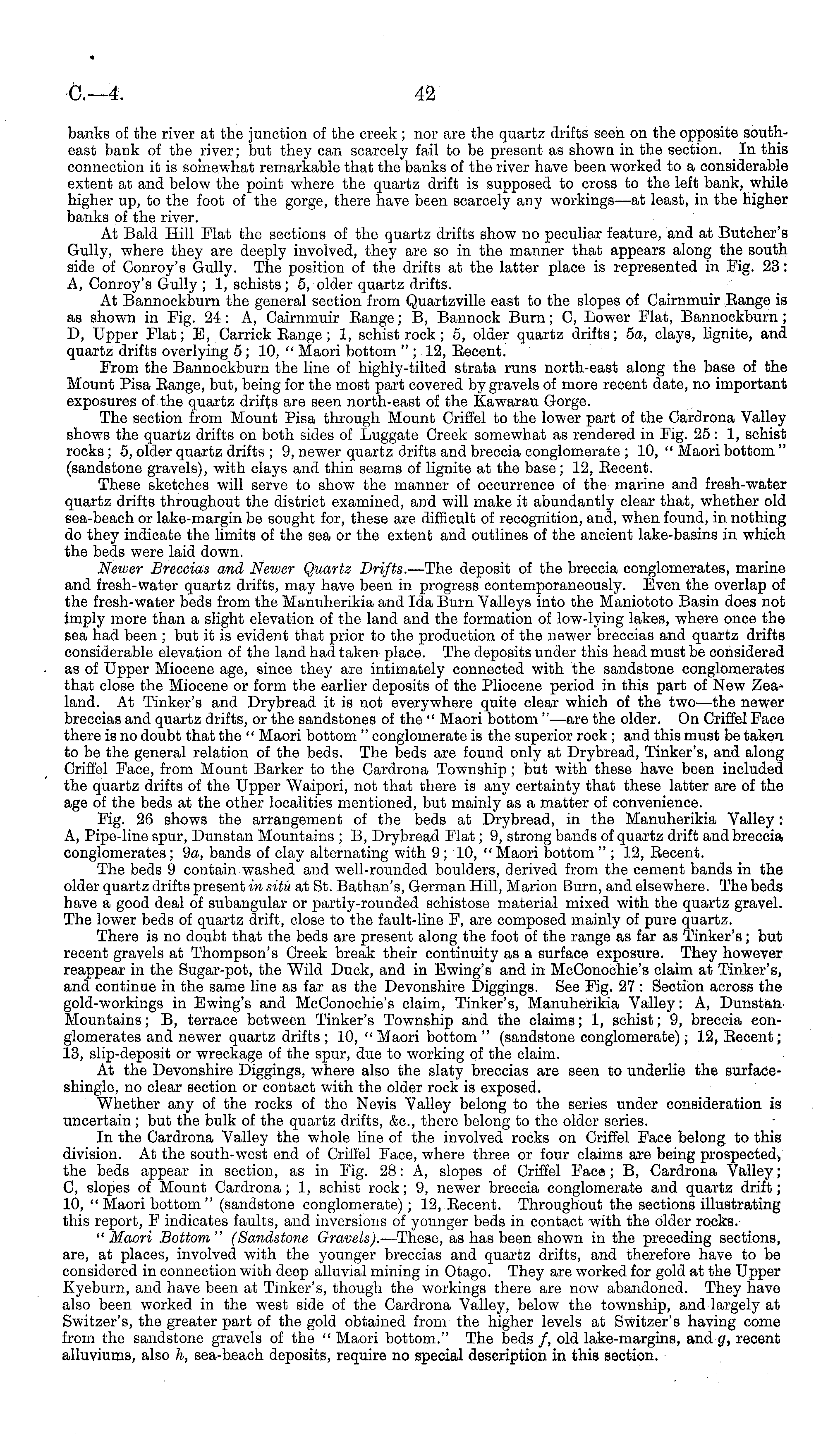 banks of the river at the junction of the creek ; nor are the quartz drifts seen on the opposite southeast bank of the river; but they can scarcely fail to be present as shown in the section. In this connection it is somewhat remarkable that the banks of the river have been worked to a considerable extent at and below the point where the quartz drift is supposed to cross to the left bank, while higher up, to the foot of the gorge, there have been scarcely any workings—at least, in the higher banks of the river. At Bald Hill Flat the sections of the quartz drifts show no peculiar feature, and at Butcher's Gully, where they are deeply involved, they are so in the manner that appears along the south side of Conroy's Gully. The position of the drifts at the latter place is represented in Fig. 23: A, Conroy's Gully ; 1, schists; 5, older quartz drifts. At Bannockburn the general section from Quartzville east to the slopes of Cairnmuir Bange is as shown in Fig. 24: A, Cairnmuir Bange; B, Bannock Burn; C, Lower Flat, Bannockburn; D, Upper Flat; E, Carrick Bange; 1, schist rock ; 5, older quartz drifts; sa, clays, lignite, and quartz drifts overlying 5 ; 10, " Maori bottom " ; 12, Becent. From the Bannockburn the line of highly-tilted strata runs north-east along the base of the Mount Pisa Bange, but, being for the most part covered by gravels of more recent date, no important exposures of the quartz drifts are seen north-east of the Kawarau Gorge. The section from Mount Pisa through Mount Criffel to the lower part of the Cardrona Valley shows the quartz drifts on both sides of Luggate Creek somewhat as rendered in Fig. 25: 1, schist rocks; 5, older quartz drifts ; 9, newer quartz drifts and breccia conglomerate ; 10, " Maori bottom " (sandstone gravels), with clays and thin seams of lignite at the base; 12, Becent. These sketches will serve to show the manner of occurrence of the marine and fresh-water quartz drifts throughout the district examined, and will make it abundantly clear that, whether old sea-beach or lake-margin be sought for, these are difficult of recognition, and, when found, in nothing do they indicate the limits of the sea or the extent and outlines of the ancient lake-basins in which the beds were laid down. Newer Breccias and Newer Quartz Drifts.- —The deposit of the breccia conglomerates, marine and fresh-water quartz drifts, may have been in progress contemporaneously. Even the overlap of the fresh-water beds from the Manuherikia and Ida Burn Valleys into the Maniototo Basin does not imply more than a slight elevation of the land and the formation of low-lying lakes, where once the sea had been ; but it is evident that prior to the production of the newer breccias and quartz drifts considerable elevation of the land had taken place. The deposits under this head must be considered as of Upper Miocene age, since they are intimately connected with the sandstone conglomerates that close the Miocene or form the earlier deposits of the Pliocene period in this part of New Zealand. At Tinker's and Drybread it is not everywhere quite clear which of the two —the newer breccias and quartz drifts, or the sandstones of the " Maori bottom " —are the older. On Criffel Face there is no doubt that the " Maori bottom " conglomerate is the superior rock ; and this must be taken to be the general relation of the beds. The beds are found only at Drybread, Tinker's, and along Criffel Face, from Mount Barker to the Cardrona Township; but with these have been included the quartz drifts of the Upper Waipori, not that there is any certainty that these latter are of the age of the beds at the other localities mentioned, but mainly as a matter of convenience. Fig. 26 shows the arrangement of the beds at Drybread, in the Manuherikia Valley: A, Pipe-line spur, Dunstan Mountains ;B, Drybread Flat; 9, strong bands of quartz drift and breccia conglomerates; 9a, bands of clay alternating with 9 ; 10, " Maori bottom " ; 12, Becent. The beds 9 contain washed and well-rounded boulders, derived from the cement bands in the older quartz drifts present in situ at St. Bathan's, German Hill, Marion Burn, and elsewhere. The beds have a good deal of subangular or partly-rounded schistose material mixed with the quartz gravel. The lower beds of quartz drift, close to the fault-line F, are composed mainly of pure quartz. There is no doubt that the beds are present along the foot of the range as far as Tinker's; but recent gravels at Thompson's Creek break their continuity as a surface exposure. They however reappear in the Sugar-pot, the Wild Duck, and in Ewing's and in McConochie's claim at Tinker's, and continue in the same line as far as the Devonshire Diggings. See Fig. 27 : Section across the gold-workings in Ewing's and McConochie's claim, Tinker's, Manuherikia Valley: A, Dunstan Mountains; B, terrace between Tinker's Township and the claims; 1, schist; 9, breccia conglomerates and newer quartz drifts; 10, "Maori bottom" (sandstone conglomerate); 12, Becent; 13, slip-deposit or wreckage of the spur, due to working of the claim. At the Devonshire Diggings, where also the slaty breccias are seen to underlie the surfaceshingle, no clear section or contact with the older rock is exposed. Whether any of the rocks of the Nevis Valley belong to the series under consideration is uncertain ; but the bulk of the quartz drifts, &c, there belong to the older series. In the Cardrona Valley the whole line of the involved rocks on Criffel Face belong to this division. At the south-west end of Criffel Face, where three or four claims are being prospected, the beds appear in section, as in Fig. 28: A, slopes of Criffel Face; B, Cardrona Valley; C, slopes of Mount Cardrona ; 1, schist rock; 9, newer breccia conglomerate and quartz drift; 10, "Maori bottom" (sandstone conglomerate); 12, Becent. Throughout the sections illustrating this report, F indicates faults, and inversions of younger beds in contact with the older roc