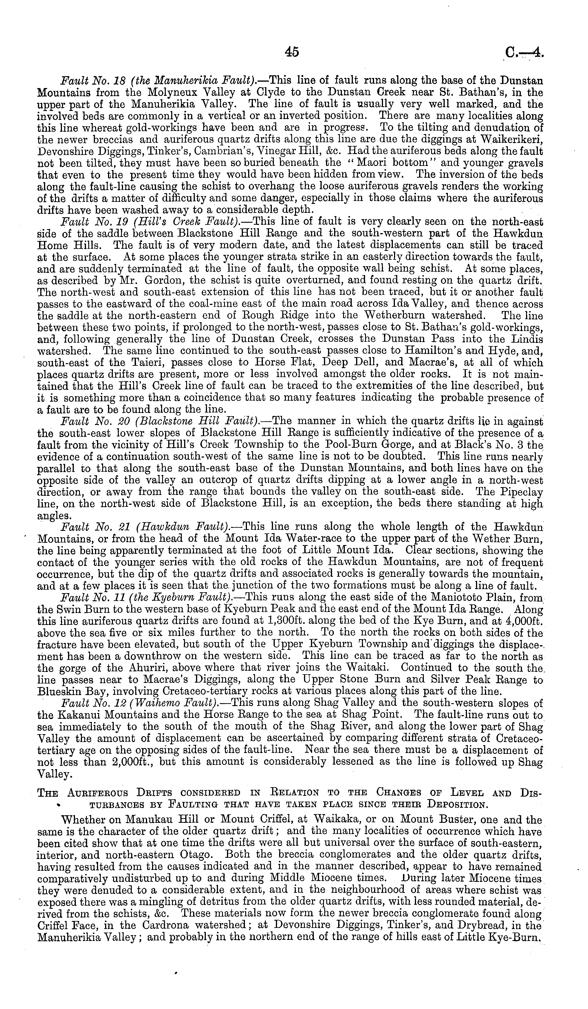 Fault No. 18 (the Manuherikia Fault). —This line of fault runs along the base of the Dunstan Mountains from the Molyneux Valley at Clyde to the Dunstan Greek near St. Bathan's, in the upper part of the Manuherikia Valley. The line of fault is usually very well marked, and the involved beds are commonly in a vertical or an inverted position. There are many localities along this line whereat gold-workings have been and are in progress. To the tilting and denudation of the newer breccias and auriferous quartz drifts along this line are due the diggings at Waikerikeri, Devonshire Diggings, Tinker's, Cambrian's, Vinegar Hill, &c. Had the auriferous beds along the fault not been tilted, they must have been so buried beneath the " Maori bottom" and younger gravels that even to the present time they would have been hidden from view. The inversion of the beds along the fault-line causing the schist to overhang the loose auriferous gravels renders the working of the drifts a matter of difficulty and some danger, especially in those claims where the auriferous drifts have been washed away to a considerable depth. Fault No. 19 (Hill's Greek Fault). —This line of fault is very clearly seen on the north-east side of the saddle between Blackstone Hill Bange and the south-western part of the Hawkdun Home Hills. The fault is of very modern date, and the latest displacements can still be traced at the surface. At some places the younger strata strike in an easterly direction towards the fault, and are suddenly terminated at the line of fault, the opposite wall being schist. At some places, as described by Mr. Gordon, the schist is quite overturned, and found resting on the quartz drift. The north-west and south-east extension of this line has not been traced, but it or another fault passes to the eastward of the coal-mine east of the main road across Ida Valley, and thence across the saddle at the north-eastern end of Bough Bidge into the Wetherburn watershed. The line between these two points, if prolonged to the north-west, passes close to St. Bathan's gold-workings, and, following generally the line of Dunstan Creek, crosses the Dunstan Pass into the Lindis watershed. The same line continued to the south-east passes close to Hamilton's and Hyde, and, south-east of the Taieri, passes close to Horse Flat, Deep Dell, and Macrae's, at all of which places quartz drifts are present, more or less involved amongst the older rocks. It is not maintained that the Hill's Creek line of fault can be traced to the extremities of the line described, but it is something more than a coincidence that so many features indicating the probable presence of a fault are to be found along the line. Fault No. 20 (Blackstone Hill Fault). —The manner in which the quartz drifts lie in against the south-east lower slopes of Blackstone Hill Bange is sufficiently indicative of the presence of a fault from the vicinity of Hill's Creek Township to the Pool-Burn Gorge, and at Black's No. 3 the evidence of a continuation south-west of the same line is not to be doubted. This line runs nearly parallel to that along the south-east base of the Dunstan Mountains, and both lines have on the opposite side of the valley an outcrop of quartz drifts dipping at a lower angle in a north-west direction, or away from the range that bounds the valley on the south-east side. The Pipeclay line, on the north-west side of Blackstone Hill, is an exception, the beds there standing at high angles. Fault No. 21 (Hawkdun Fault). —This line runs along the whole length of the Hawkdun Mountains, or from the head of the Mount Ida Water-race to the upper part of the Wether Burn, the line being apparently terminated at the foot of Little Mount Ida. Clear sections, showing the contact of the younger series with the old rocks of the Hawkdun Mountains, are not of frequent occurrence, but the dip of the quartz drifts and associated rocks is generally towards the mountain, and at a few places it is seen that the. junction of the two formations must be along a line of fault. Fault No. 11 (the Kyeburn Fault). —This runs along the east side of the Maniototo Plain, from the Swin Burn to the western base of Kyeburn Peak and the east end of the Mount Ida Bange. Along this line auriferous quartz drifts are found at 1,300 ft. along the bed of the Kye Burn, and at 4,000 ft. above the sea five or six miles further to the north. To the north the rocks on both sides of the fracture have been elevated, but south of the Upper Kyeburn Township and diggings the displace-, ment has been a downthrow on the western side. This line can be traced as far to the north as the gorge of the Ahuriri, above where that river joins the Waitaki. Continued to the south the, line passes near to Macrae's Diggings, along the Upper Stone Burn and Silver Peak Bange to Blueskin Bay, involving Cretaceo-tertiary rocks at various places along this part of the line. Fault No. 12 (Waihemo Fault). —This runs along Shag Valley and the south-western slopes of the Kakanui Mountains and the Horse Bange to the sea at Shag Point. The fault-line runs out to sea immediately to the south of the mouth of the Shag Biver, and along the lower part of Shag Valley the amount of displacement can be ascertained by comparing different strata of Cretaceotertiary age on the opposing sides of the fault-line. Near the sea there must be a displacement of not less than 2,000 ft., but this amount is considerably lessened as the line is followed up Shag Valley. The Auriferous Drifts considered in Belation to the Changes of Level and Disturbances by Faulting that have taken place since their Deposition. Whether on Manukau Hill or Mount Criffel, at Waikaka, or on Mount Buster, one and the same is the character of the older quartz drift; and the many localities of occurrence which have been cited show that at one time the drifts were all but universal over the surface of south-eastern, interior, and north-eastern Otago. Both the br