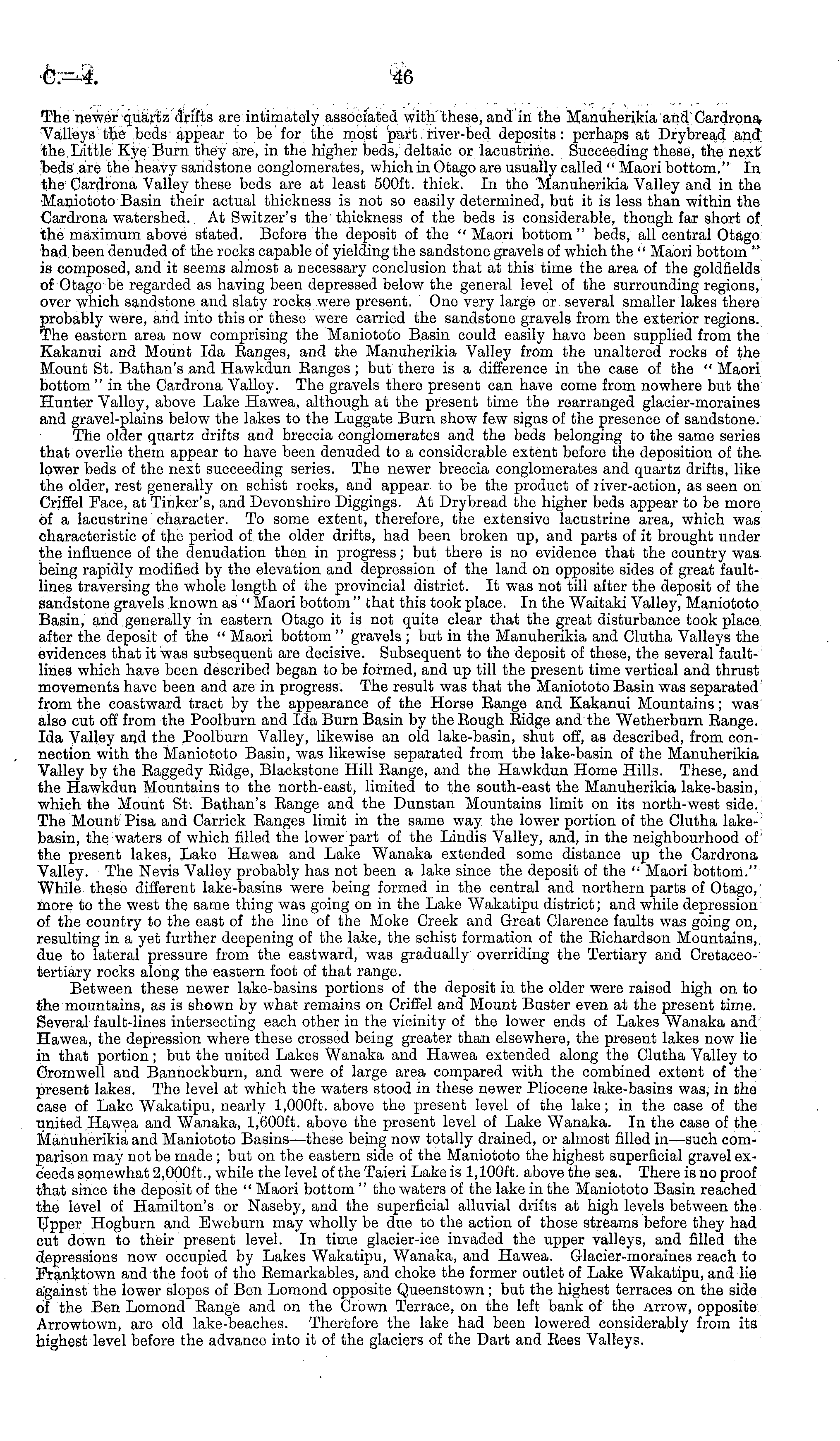 The newer quartz drifts are intimately associated with these, and in the Manuherikia and Cardrona, Valleys the beds appear to be for the most part river-bed deposits: perhaps at Drybread and the Little Kye Burn they are, in the higher beds, deltaic or lacustrine. Succeeding these, the next beds are the heavy sandstone conglomerates, which in Otago are usually called " Maori bottom." In the Cardrona Valley these beds are at least 500 ft. thick. In the Manuherikia Valley and in the Maniototo Basin their actual thickness is not so easily determined, but it is less than within the Cardrona watershed. At Switzer's the thickness of the beds is considerable, though far short of the maximum above stated. Before the deposit of the " Maori bottom " beds, all central Otago had been denuded of the rocks capable of yielding the sandstone gravels of which the " Maori bottom " is composed, and it seems almost a necessary conclusion that at this time the area of the goldfields of Otago be regarded as having been depressed below the general level of the surrounding regions, over which sandstone and slaty rocks were present. One vsry large or several smaller lakes there probably were, and into this or these were carried the sandstone gravels from the exterior regions. The eastern area now comprising the Maniototo Basin could easily have been supplied from the Kakanui and Mount Ida Banges, and the Manuherikia Valley from the unaltered rocks of the Mount St. Bathan's and Hawkdun Eanges; but there is a difference in the case of the " Maori bottom "in the Cardrona Valley. The gravels there present can have come from nowhere but the Hunter Valley, above Lake Hawea, although at the present time the rearranged glacier-moraines and gravel-plains below the lakes to the Luggate Burn show few signs of the presence of sandstone. The older quartz drifts and breccia conglomerates and the beds belonging to the same series that overlie them appear to have been denuded to a considerable extent before the deposition of the lower beds of the next succeeding series. The newer breccia conglomerates and quartz drifts, like the older, rest generally on schist rocks, and appear to be the product of liver-action, as seen on Criffel Face, at Tinker's, and Devonshire Diggings. At Drybread the higher beds appear to be more of a lacustrine character. To some extent, therefore, the extensive lacustrine area, which was characteristic of the period of the older drifts, had been broken up, and parts of it brought under the influence of the denudation then in progress; but there is no evidence that the country was being rapidly modified by the elevation and depression of the land on opposite sides of great faultlines traversing the whole length of the provincial district. It was not till after the deposit of the sandstone gravels known as " Maori bottom" that this took place. In the Waitaki Valley, Maniototo Basin, and generally in eastern Otago it is not quite clear that the great disturbance took place after the deposit of the " Maori bottom" gravels ; but in the Manuherikia and Clutha Valleys the evidences that it was subsequent are decisive. Subsequent to the deposit of these, the several faultlines which have been described began to be formed, and up till the present time vertical and thrust movements have been and are in progress. The result was that the Maniototo Basin was separated from the coastward tract by the appearance of the Horse Eange and Kakanui Mountains; was also cut off from the Poolburn and Ida Burn Basin by the Bough Eidge and the Wetherburn Eange. Ida Valley and the Poolburn Valley, likewise an old lake-basin, shut off, as described, from connection with the Maniototo Basin, was likewise separated from the lake-basin of the Manuherikia Valley by the Eaggedy Eidge, Blackstone Hill Eange, and the Hawkdun Home Hills. These, and the Hawkdun Mountains to the north-east, limited to the south-east the Manuherikia lake-basin, which the Mount St. Bathan's Eange and the Dunstan Mountains limit on its north-west side. The Mount Pisa and Carrick Eanges limit in the same way the lower portion of the Clutha lakebasin, the waters of which filled the lower part of the Lindis Valley, and, in the neighbourhood of the present lakes, Lake Hawea and Lake Wanaka extended some distance up the Cardrona Valley. The Nevis Valley probably has not been a lake since the deposit of the " Maori bottom." While these different lake-basins were being formed in the central and northern parts of Otago, more to the west the same thing was going on in the Lake Wakatipu district; and while depression of the country to the east of the line of the Moke Creek and Great Clarence faults was going on, resulting in a yet further deepening of the lake, the schist formation of the Eichardson Mountains, due to lateral pressure from the eastward, was gradually overriding the Tertiary and Cretaceotertiary rocks along the eastern foot of that range. Between these newer lake-basins portions of the deposit in the older were raised high on to the mountains, as is shown by what remains on Criffel and Mount Buster even at the present time. Several fault-lines intersecting each other in the vicinity of the lower ends of Lakes Wanaka and Hawea, the depression where these crossed being greater than elsewhere, the present lakes now lie in that portion; but the united Lakes Wanaka and Hawea extended along the Clutha Valley to Cromwell and Bannockburn, and were of large area compared with the combined extent of the present lakes. The level at which the waters stood in these newer Pliocene lake-basins was, in the case of Lake Wakatipu, nearly I,oooft. above the present level of the lake; in the case of the united Hawea and Wanaka, 1,600 ft. above the present level of Lake Wanaka. In the case of the Manuherikia and Maniototo Basins—these being now totally drained, or almost filled in—such comparison may not be made; but on the eastern side of the Maniototo the highest superfi