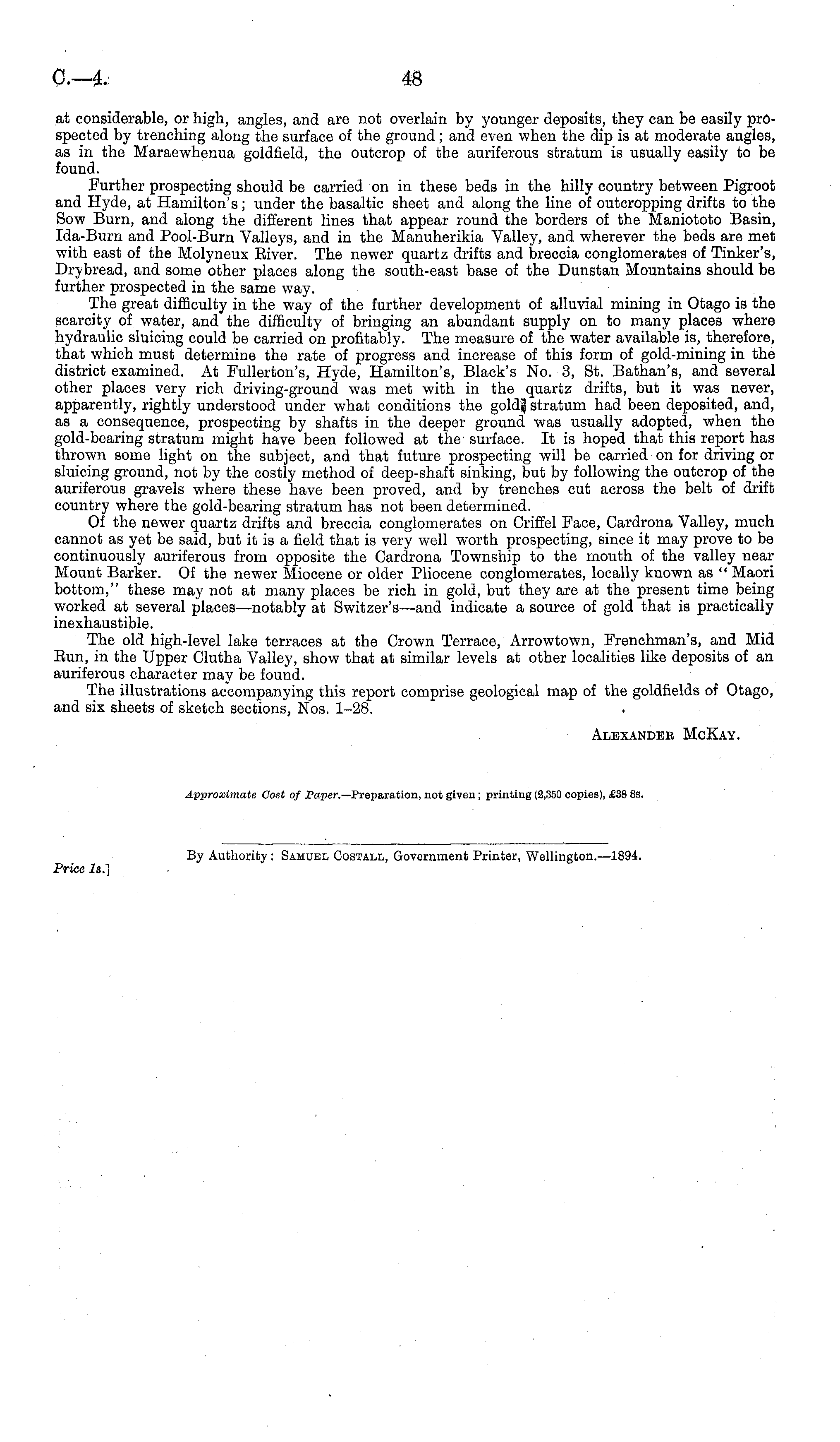 at considerable, or high, angles, and are not overlain by younger deposits, they can be easily prospected by trenching along the surface of the ground; and even when the dip is at moderate angles, as in the Maraewhenua goldfield, the outcrop of the auriferous stratum is usually easily to be found. Further prospecting should be carried on in these beds in the hilly country between Pigroot and Hyde, at Hamilton's; under the basaltic sheet and along the line of outcropping drifts to the Sow Burn, and along the different lines that appear round the borders of the Maniototo Basin, Ida-Burn and Pool-Burn Valleys, and in the Manuherikia Valley, and wherever the beds are met with east of the Molyneux Biver. The newer quartz drifts and breccia conglomerates of Tinker's, Drybread, and some other places along the south-east base of the Dunstan Mountains should be further prospected in the same way. The great difficulty in the way of the further development of alluvial mining in Otago is the scarcity of water, and the difficulty of bringing an abundant supply on to many places where hydraulic sluicing could be carried on profitably. The measure of the water available is, therefore, that which must determine the rate of progress and increase of this form of gold-mining in the district examined. At Fullerton's, Hyde, Hamilton's, Black's No. 3, St. Bathan's, and several other places very rich driving-ground, was met with in the quartz drifts, but it was never, apparently, rightly understood under what conditions the goldj stratum had been deposited, and, as a consequence, prospecting by shafts in the deeper ground was usually adopted, when the gold-bearing stratum might have been followed at the- surface. It is hoped that this report has thrown some light on the subject, and that future prospecting will be carried on for driving or sluicing ground, not by the costly method of deep-shaft sinking, but by following the outcrop of the auriferous gravels where these have been proved, and by trenches cut across the belt of drift country where the gold-bearing stratum has not been determined. Of the newer quartz drifts and breccia conglomerates on Criffel Face, Cardrona Valley, much cannot as yet be said, but it is a field that is very well worth prospecting, since it may prove to be continuously auriferous from opposite the Cardrona Township to the mouth of the valley near Mount Barker. Of the newer Miocene or older Pliocene conglomerates, locally known as " Maori bottom," these may not at many places be rich in gold, but they are at the present time being worked at several places—notably at Switzer's—and indicate a source of gold that is practically inexhaustible. The old high-level lake terraces at the Crown Terrace, Arrowtown, Frenchman's, and Mid Bun, in the Upper Clutha Valley, show that at similar levels at other localities like deposits of an auriferous character may be found. The illustrations accompanying this report comprise geological map of the goldfields of Otago, and six sheets of sketch sections, Nos. 1-28. Alexander McKay. Approximate Goat of Paper.— Preparation, not given; printing (2,350 copies), £38 Bs.