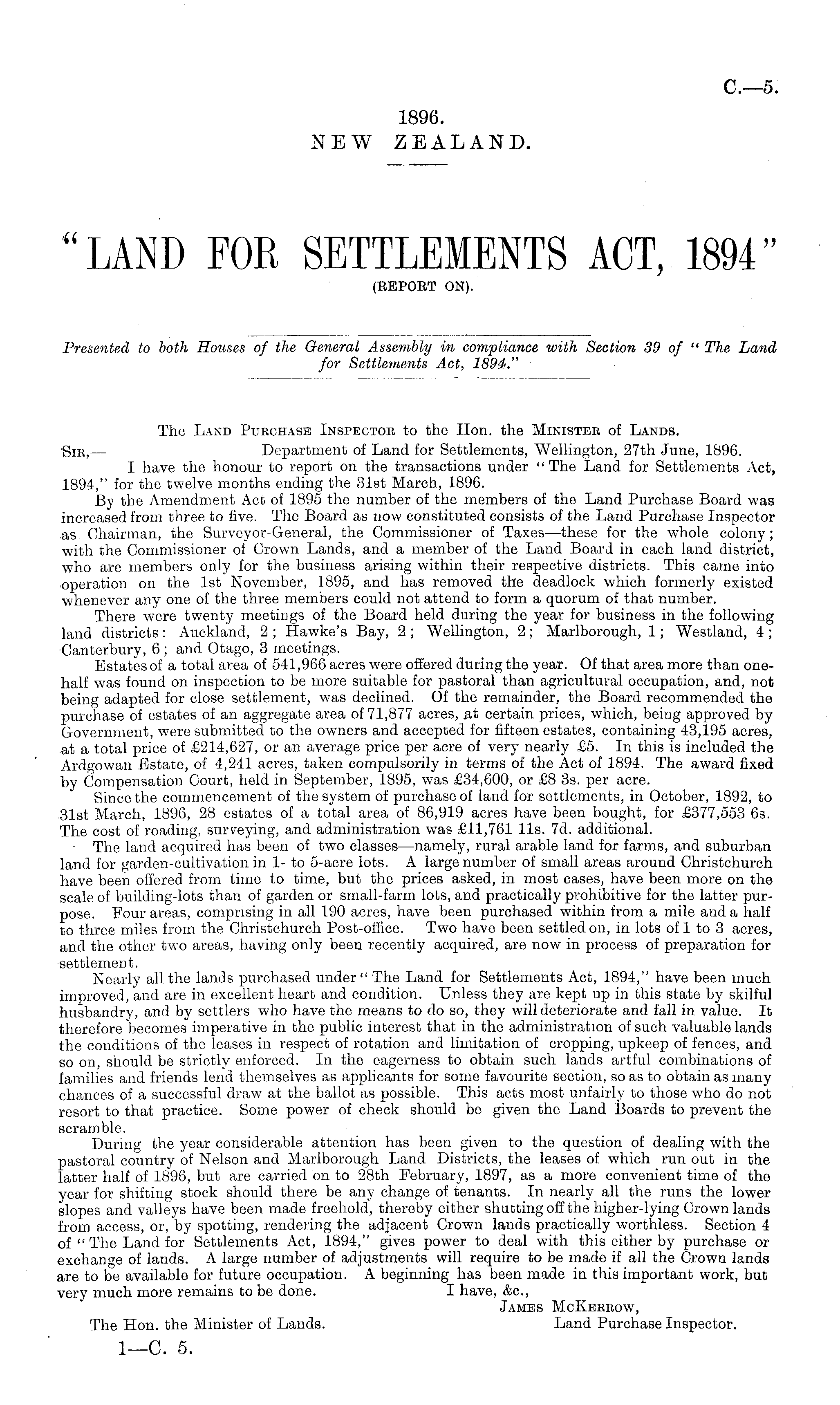 "LAND FOR SETTLEMENTS ACT, 1894" (REPORT ON).