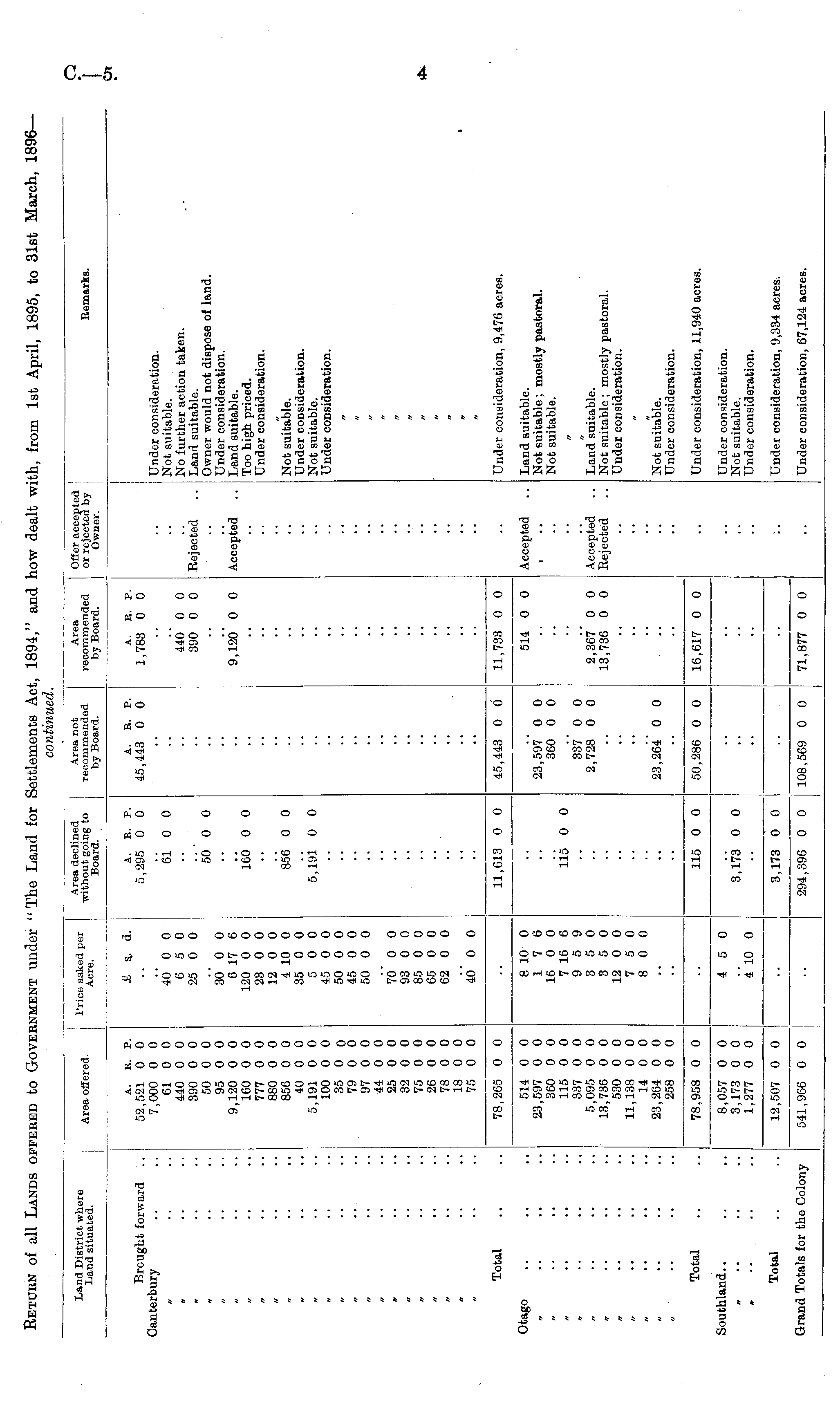 Land District where Land situated. Area offered. Trice asked per Acre. Area declined without going to Board. Area not recommended by Board. Area recommended by Board, Offer accepted or rejected by Owner. Remarks. a. R. p. 52,521 0 0 7,000 0 0 61 0 0 440 0 0 390 0 0 50 0 0 95 0 0 9,120 0 0 160 0 0 777 0 0 880 0 0 856 0 0 40 0 0 5,191 0 0 100 0 0 35 0 0 79 0 0 97 0 0 44 0 0 25 0 0 32 0 0 75 0 0 26 0 0 78 0 0 18 0 0 75 0 0 £ a. d. A. R. P. 5,295 0 0 A. R. P. 45,443 0 0 A. R. P. 1,783 0 0 Brought forward .. Canterbury Under consideration. Not suitable. No further action taken. Land suitable. Owner would not dispose of land. Under consideration. Land suitable. Too high priced. Under consideration. 40 0 0 6 5 0 25 0 0 61 0 0 440 0 0 390 0 0 50 0 0 Rejected 30 0 0 6 17 6 120 0 0 23 0 0 12 0 0 4 10 0 35 0 0 5 0 0 45 0 0 50 0 0 45 0 0 50 0 0 160 0 0 856 0 0 9,126' 0 0 Accepted Not suitable. Under consideration. Not suitable. Under consideration. 5,191 0 0 70 0 0 93 0 0 85 0 0 65 0 0 62 0 0 40 0 0 t Total 78,265 0 0 11,613 0 0 45,443 0 0 11,733 0 0 Under consideration, 9,476 acres. •• Otago 514 0 0 23,597 0 0 360 0 0 115 0 0 337 0 0 5,095 0 0 13,736 0 0 530 0 0 11,138 0 0 14 0 0 23,264 0 0 258 0 0 8 10 0 17 6 16 0 0 7 16 6 9 5 9 3 5 0 3 5 0 12 0 0 7 5 0 8 0 0 115 0 0 23,597° 0 0 360 0 0 337' 0 0 2,728 0 0 514 0 0 •• 2,367' 0 0 13,736 0 0 Accepted 1 Accepted Rejected Land suitable. Not suitable ; mostly pastoral. Not suitable. Land suitable. Not suitable ; mostly pastoral. Under consideration. 23,264' 0 0 Not suitable. Under consideration. I •• Total 78,958 0 0 115 0 0 50,286 0 0 16,617 0 0 Under consideration, 11,940 acres. Southland.. « .. .. 8,057 0 0 3,173 0 0 1,277 0 0 4 5 0 4 10 0 3,173 0 0 Under consideration. Not suitable. Under consideration. Total 12,507 0 0 | 3,173 0 0 i Under consideration, 9,334 acres. Grand Totals for the Colony 541,966 0 0 294,396 0 0 Under consideration, 67,124 acres. 108,569 0 0 71,877 0 0