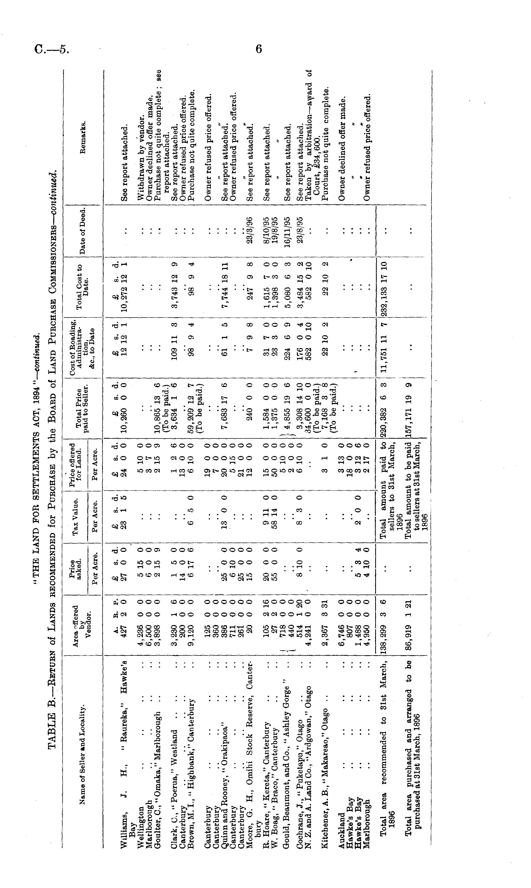 Area offered by Price asked. Tax Value. Price offered for Land. Cost of Roading, Administration, &c, to Date Name of Seller and Locality. Total Price caid to Seller. Total Cost to Date. Date of Deed. Remarks. Per Acre. Per Acre. Per Acre. Williams, J. H., " Raureka," Hawke's Bay Wellington Marlborough Goulter, C, "Omaka," Marlborough A. R. P. 427 2 0 £ s. d. 27 0 0 £ s. d. 23 1 5 £ s. d. 24 0 0 £ s. d. 10,260 0 0 £ s. d. 12 12 1 £ s. d. 10,272 12 1 See report attached. 4,236 0 0 6,500 0 0 3,898 0 0 5 15 0 6 0 0 2 15 9 5 10 0 3 7 0 2 15 9 10,865 13 6 (To be paid.) 3,634 1 6 •• Withdrawn by vendor. Owner declined offer made. Purchase not quite complete ; sec report attached. See report attached. Owner refused price offered. Purchase not quite complete. Clark, C, " Poerua," Westland Canterbury .. .. .... Brown, M. L, " Highbank," Canterbury 3,230 1 6 200 0 0 9,120 0 0 15 0 14 0 0 6 17 6 6 5 0 12 6 13 0 0 6 10 0 59,209 12 7 (To be paid.) 109 11 3 98 9 4 3,743 12 9 98' 9 4 Canterbury Canterbury Quinn and Rooney, " Orakipaoa" Canterbury Canterbury Moore, G. H., Omihi Stock Reserve, Canterbury R. Hoare, " Kereta," Canterbury W. Boag, *' Braco," Canterbury Gould, Beaumont, and Co., " Ashley Gorge " 125 0 0 | 360 0 0 j 386 0 0 711 0 0 261 0 0 20 0 0 •• 25 0 0 6 10 0 25 0 0 15 0 0 13 0 0 19 0 0 7 0 0 20 0 0 5 15 0 21 0 0 12 0 0 7,683* 17 6 61 1 5 7,74418 11 Owner refused price offered. See report attached. Owner refused price offered. 240 0 0 7 9 8 247 9 8 23/3/96 See report attached. 105 2 16 27 2 0 I 718 0 0 \ 440 0 0 514 1 20 4,241 0 0 20 0 0 55 0 0 9 11 0 58 14 0 15 0 0 50 0 0 5 10 0 2 0 0 6 10 0 1,584 0 0 1,375 0 0 j 4,855 19 6 31 7 0 23 3 0 224 6 9 1,615 7 0 1,398 3 0 5,080 6 3 8/10/95 19/8/95 16/11/95 See report attached. See report attached. Cochrane, J., " Puketapu," Otago N. Z. and A. Land Co., "Ardgowan," Otago 8 10 0 8 3 0 3,308 14 10 34,600 0 0 (To be paid.) 7,168 3 8 (To be paid.) 176 0 4 582 0 10 3,484 15 2 582 0 10 23/8/95 See report attached. Taken by arbitration —award oi Court, £34,600. Purchase not quite complete. Kitchener, A. B., "Makareao," Otago .. 2,367 3 31 3 10 22 10 2 22 10 2 Auckland Hawke's Bay Hawke's Bay Marlborough 6,746 0 0 807 0 0 1,488 0 0 4,950 0 0 138,299 3 6 53 4 4 10 0 20 0 3 13 0 18 0 0 3 12 6 2 17 0 a ■ * Owner declined offer made. I I Owner refused price offered. Total area recommended to 31st March, 1896 Total amou sellers to 1896 Total amour: to sellers al int paid to 31st March, 220,382 6 3 11,751 11 7 232,133 17 10 Total area purchased and arranged to be purchased at 31st March, 1896 86,919 1 21 it to be paid ,t 31st March, 157,171 19 9