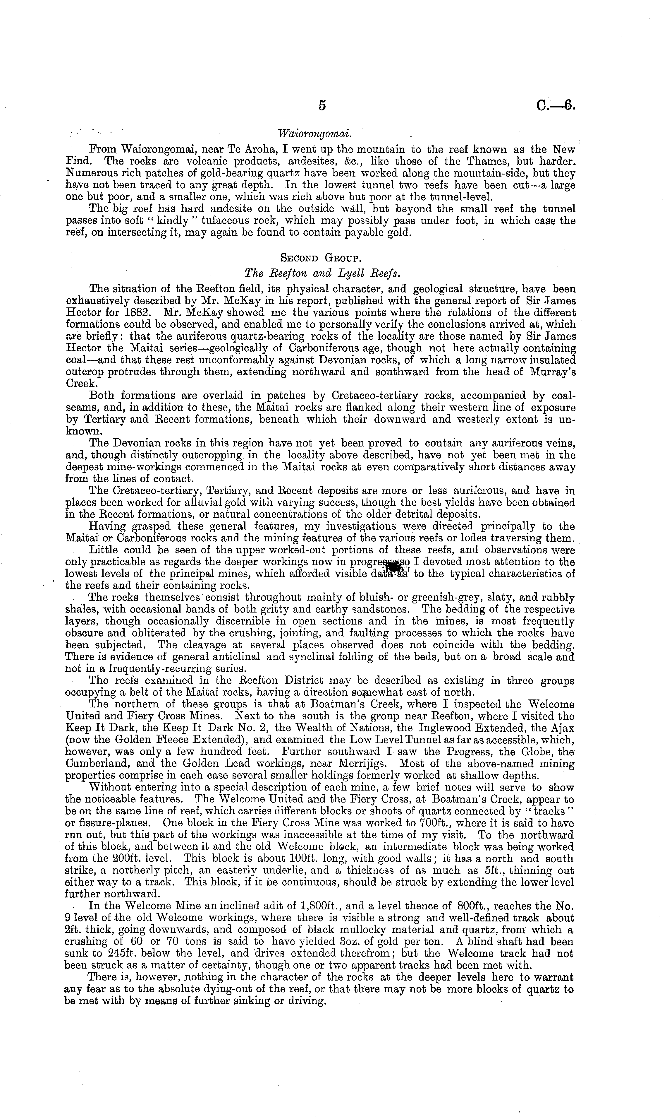 Waiorongomai. From Waiorongomai, near Te Aroha, I went up the mountain to the reef known as the New Find. The rocks are volcanic products, andesites, &c, like those of the Thames, but harder. Numerous rich patches of gold-bearing quartz have been worked along the mountain-side, but they have not been traced to any great depth. In the lowest tunnel two reefs have been cut—a large one but poor, and a smaller one, which was rich above but poor at the tunnel-level. The big reef has hard andesite on the outside wall, but beyond the small reef the tunnel passes into soft " kindly " tufaceous rock, which may possibly pass under foot, in which case the reef, on intersecting it, may again be found to contain payable gold. Second Group. The Beefton and Lyell Beefs. The situation of the Eeefton field, its physical character, and geological structure, have been exhaustively described by Mr. McKay in his report, published with the general report of Sir James Hector for 1882. Mr. McKay showed me the various points where the relations of the different formations could be observed, and enabled me to personally verify the conclusions arrived at, which are briefly: that the auriferous quartz-bearing rocks of the locality are those named by Sir James Hector the Maitai series—geologically of Carboniferous age, though not here actually containing coal—and that these rest unconformably against Devonian rocks, of which a long narrow insulated outcrop protrudes through them, extending northward and southward from the head of Murray's Creek. Both formations are overlaid in patches by Cretaceo-tertiary rocks, accompanied by coalseams, and, in addition to these, the Maitai rocks are flanked along their western line of exposure by Tertiary and Eecent formations, beneath which their downward and westerly extent is unknown. The Devonian rocks in this region have not yet been proved to contain any auriferous veins, and, though distinctly outcropping in the locality above described, have not yet been met in the deepest mine-workings commenced in the Maitai rocks at even comparatively short distances away from the lines of contact. The Cretaceo-tertiary, Tertiary, and Eecent deposits are more or less auriferous, and have in places been worked for alluvial gold with varying success, though the best yields have been obtained in the Eecent formations, or natural concentrations of the older detrital deposits. Having grasped these general features, my investigations were directed principally to the Maitai or Carboniferous rocks and the mining features of the various reefs or lodes traversing them. Little could be seen of the upper worked-out portions of these reefs, and observations were only practicable as regards the deeper workings now in I devoted most attention to the lowest levels of the principal mines, which afforded visible dat era's to the typical characteristics of the reefs and their containing rocks. The rocks themselves consist throughout mainly of bluish- or greenish-grey, slaty, and rubbly shales, with occasional bands of both gritty and earthy sandstones. The bedding of the respective layers, though occasionally discernible in open sections and in the mines, is most frequently obscure and obliterated by the crushing, jointing, and faulting processes to which the rocks have been subjected, The cleavage at several places observed does not coincide with the bedding. There is evidence of general anticlinal and synclinal folding of the beds, but on a broad scale and not in a frequently-recurring series. The reefs examined in the Eeefton District may be described as existing in three groups occupying a belt of the Maitai rocks, having a direction somewhat east of north. The northern of these groups is that at Boatman's Creek, where I inspected the Welcome United and Fiery Cross Mines. Next to the south is the group near Eeefton, where I visited the Keep It Dark, the Keep It Dark No. 2, the Wealth of Nations, the Inglewood Extended, the Ajax (now the Golden Fleece Extended), and examined the Low Level Tunnel as far as accessible, which, however, was only a few hundred feet. Further southward I saw the Progress, the Globe, the Cumberland, and the Golden Lead workings, near Merrijigs. Most of the above-named mining properties comprise in each case several smaller holdings formerly worked at shallow depths. Without entering into a special description of each mine, a few brief notes will serve to show the noticeable features. The Welcome United and the Fiery Cross, at Boatman's Creek, appear to be on the same line of reef, which carries different blocks or shoots of quartz connected by " tracks " or fissure-planes. One block in the Fiery Cross Mine was worked to 700 ft., where it is said to have run out, but this part of the workings was inaccessible at the time of my visit. To the northward of this block, and between it and the old Welcome black, an intermediate block was being worked from the 200 ft. level. This block is about 100 ft. long, with good walls; it has a north and south strike, a northerly pitch, an easterly underlie, and a thickness of as much as sft., thinning out either way to a track. This block, if it be continuous, should be struck by extending the lower level further northward. In the Welcome Mine an inclined adit of 1,800 ft., and a level thence of 800 ft., reaches the No. 9 level of the old Welcome workings, where there is visible a strong and well-defined track about 2ft. thick, going downwards, and composed of black mullocky material and quartz, from which a crushing of 60 or 70 tons is said to have yielded 3oz. of gold per ton. A blind shaft had been sunk to 245 ft. below the level, and drives extended therefrom; but the Welcome track had not been struck as a matter of certainty, though one or two apparent tracks had been met with. There is, however, nothing in the character of the rocks at the deeper levels here to warrant any fear as to the absolute dying-out of the reef, or that there
