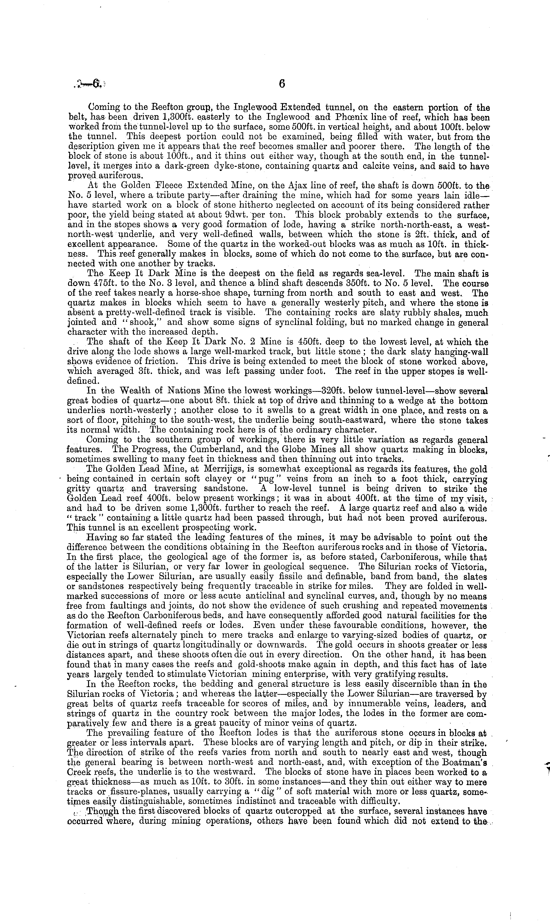 Coming to the Eeefton group, the Inglewood Extended tunnel, on the eastern portion of the belt, has been driven 1,300 ft. easterly to the Inglewood and Phoenix line of reef, which has been worked from the tunnel-level up to the surface, some 500 ft. in vertical height, and about 100 ft. below the tunnel. This deepest portion could not be examined, being filled with water, but from the description given me it appears that the reef becomes smaller and poorer there. The length of the block of stone is about 100 ft., and it thins out either way, though at the south end, in the tunnellevel, it merges into a dark-green dyke-stone, containing quartz and calcite veins, and said to have proved auriferous. At the Golden Fleece Extended Mine, on the Ajax line of reef, the shaft is down 500 ft. to the No. 5 level, where a tribute party—after draining the mine, which had for some years lain idle— have started work on a block of stone hitherto neglected on account of its being considered rather poor, the yield being stated at about 9dwt. per ton. This block probably extends to the surface, and in the stopes shows a very good formation of lode, having a strike north-north-east, a west-north-west underlie, and very well-defined walls, between which the stone is 2ft. thick, and of excellent appearance. Some of the quartz in the worked-out blocks was as much as 10ft. in thickness. This reef generally makes in blocks, some of which do not come to the surface, but are connected with one another by tracks. The Keep It Dark Mine is the deepest on the field as regards sea-level. The main shaft is down 475 ft. to the No. 3 level, and thence a blind shaft descends 350 ft. to No. 5 level. The course of the reef takes nearly a horse-shoe shape, turning from north and south to east and west. The quartz makes in blocks which seem to have a generally westerly pitch, and where the stone is absent a pretty-well-defined track is visible. The containing rocks are slaty rubbly shales, much jointed and " shook," and show some signs of synclinal folding, but no marked change in general character with the increased depth. The shaft of the Keep It Dark No. 2 Mine is 450 ft. deep to the lowest level, at which the drive along the lode shows a large well-marked track, but little stone ; the dark slaty hanging-wall shows evidence of friction. This drive is being extended to meet the block of stone worked above, which averaged 3ft. thick, and was left passing under foot. The reef in the upper stopes is welldefined. In the Wealth of Nations Mine the lowest workings—32oft. below tunnel-level—show several great bodies of quartz —one about Bft. thick at top of drive and thinning to a wedge at the bottom underlies north-westerly; another close to it swells to a great width in one place, and rests on a sort of floor, pitching to the south-west, the underlie being south-eastward, where the stone takes its normal width. The containing rock here is of the ordinary character. Coming to the southern group of workings, there is very little variation as regards general features. The Progress, the Cumberland, and the Globe Mines all show quartz making in blocks, sometimes swelling to many feet in thickness and then thinning out into tracks. The Golden Lead Mine, at Merrijigs, is somewhat exceptional as regards its features, the gold being contained in certain soft clayey or "pug" veins from an inch to a foot thick, carrying gritty quartz and traversing sandstone. A low-level tunnel is being driven to strike the Golden Lead reef 400 ft. below present workings; it was in about 400 ft. at the time of my visit, and had to be driven some 1,300 ft. further to reach the reef. A large quartz reef and also a wide " track " containing a little quartz had been passed through, but had not been proved auriferous. This tunnel is an excellent prospecting work. Having so far stated the leading features of the mines, it may be advisable to point out the difference between the conditions obtaining in the Eeefton auriferous rocks and in those of Victoria. In the first place, the geological age of the former is, as before stated, Carboniferous, while that of the latter is Silurian, or very far lower in geological sequence. The Silurian rocks of Victoria, especially the Lower Silurian, are usually easily fissile and definable, band from band, the slates or sandstones respectively being frequently traceable in strike for miles. They are folded in wellmarked successions of more or less acute anticlinal and synclinal curves, and, though by no means free from faultings and joints, do not show the evidence of such crushing and repeated movements as do the Eeefton Carboniferous beds, and have consequently afforded good natural facilities for the formation of well-defined reefs or lodes. Even under these favourable conditions, however, the Victorian reefs alternately pinch to mere tracks and enlarge to varymg-sized bodies of quartz, or die out in strings of quartz longitudinally or downwards. The gold occurs in shoots greater or less distances apart, and these shoots often die out in every direction. On the other hand, it has been found that in many cases the reefs and gold-shoots make again in depth, and this fact has of late years largely tended to stimulate Victorian mining enterprise, with very gratifying results. In the Eeefton rocks, the bedding and general structure is less easily discernible than in the Silurian rocks of Victoria ; and whereas the latter—especially the Lower Silurian—are traversed by great belts of quartz reefs traceable for scores of miles, and by innumerable veins, leaders, and strings of quartz in the country rock between the major lodes, the lodes in the former are comparatively few and there is a great paucity of minor veins of quartz. The prevailing feature of the Eeefton lodes is that the auriferous stone occurs in blocks at greater or less intervals apart. These blocks are of varying length and pitch, or dip in their strike. 