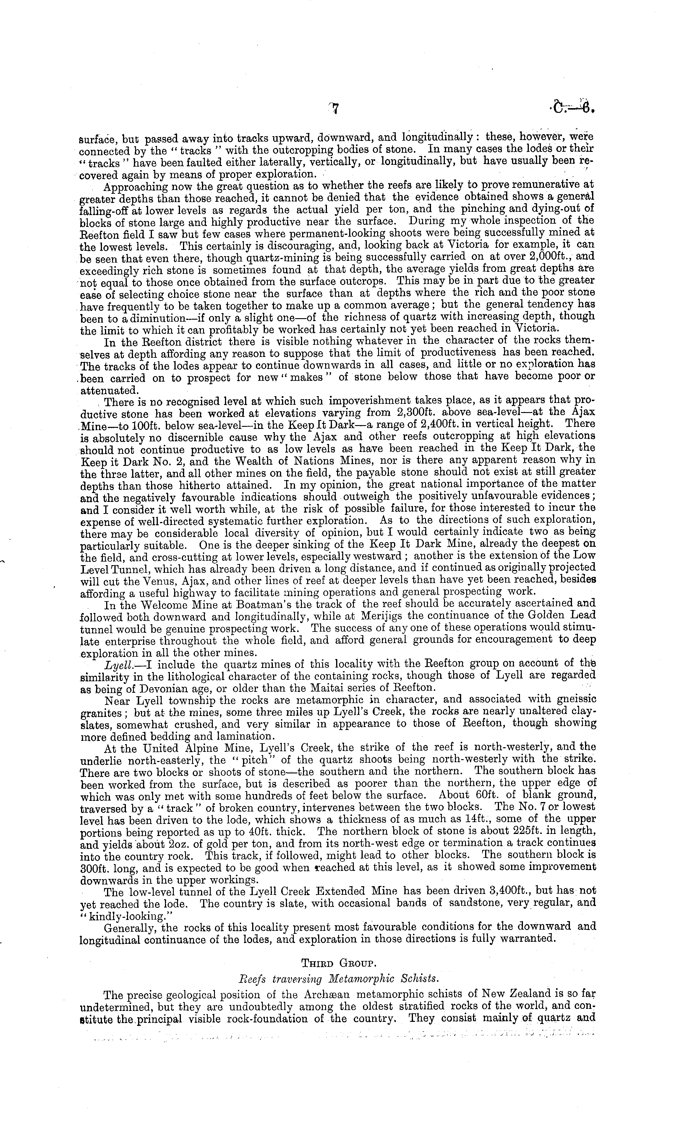 surface, but passed away into tracks upward, downward, and longitudinally : these, however, were connected by the " tracks " with the outcropping bodies of stone. In many cases the lodes or their " tracks " have been faulted either laterally, vertically, or longitudinally, but have usually been recovered again by means of proper exploration. Approaching now the great question as to whether the reefs are likely to prove remunerative at greater depths than those reached, it cannot be denied that the evidence obtained shows a general falling-off at lower levels as regards the actual yield per ton, and the pinching and dying-out of blocks of stone large and highly productive near the surface. During my whole inspection of the Eeefton field I saw but few cases where permanent-looking shoots were being successfully mined at the lowest levels. This certainly is discouraging, and, looking back at Victoria for example, it can be seen that even there, though quartz-mining is being successfully carried on at over 2,000 ft., and exceedingly rich stone is sometimes found at that depth, the average yields from great depths are not equal to those once obtained from the surface outcrops. This may be in part due to the greater ease of selecting choice stone near the surface than at depths where the rich and the poor stone have frequently to be taken together to make up a common average ; but the general tendency has been to a diminution—if only a slight one—of the richness of quartz with increasing depth, though the limit to which it can profitably be worked has certainly not yet been reached in Victoria. In the Eeefton district there is visible nothing whatever in the character of the rocks themselves at depth affording any reason to suppose that the limit of productiveness has been reached. The tracks of the lodes appear to continue downwards in all cases, and little or no exploration has been carried on to prospect for new " makes " of stone below those that have become poor or attenuated. There is no recognised level at which such impoverishment takes place, as it appears that productive stone has been worked at elevations varying from 2,300 ft. above sea-level—at the Ajax Mine—to 100 ft. below sea-level—in the Keep It Dark—a range of 2,400 ft. in vertical height. There is absolutely no discernible cause why the Ajax and other reefs outcropping at high elevations should not continue productive to as low levels as have been reached in the Keep It Dark, the Keep it Dark No. 2, and the Wealth of Nations Mines, nor is there any apparent reason why in the three latter, and all other mines on the field, the payable stone should not exist at still greater depths than those hitherto attained. In my opinion, the great national importance of the matter and the negatively favourable indications should outweigh the positively unfavourable evidences; and I consider it well worth while, at the risk of possible failure, for those interested to incur the expense of well-directed systematic further exploration. As to the directions of such exploration, there may be considerable local diversity of opinion, but I would certainly indicate two as being particularly suitable. One is the deeper sinking of the Keep It Dark Mine, already the deepest on the field, and cross-cutting at lower levels, especially westward ; another is the extension of the Low Level Tunnel, which has already been driven a long distance, and if continued as originally projected will cut the Venus, Ajax, and other lines of reef at deeper levels than have yet been reached, besides affording a useful highway to facilitate mining operations and general prospecting work. In the Welcome Mine at Boatman's the track of the reef should be accurately ascertained and followed both downward and longitudinally, while at Merijigs the continuance of the Golden Lead tunnel would be genuine prospecting work. The success of any one of these operations would stimulate enterprise throughout the whole field, and afford general grounds for encouragement to deep exploration in all the other mines. Lyell. —l include the quartz mines of this locality with the Eeefton group on account of the similarity in the lithological character of the containing rocks, though those of Lyell are regarded as being of Devonian age, or older than the Maitai series of Eeefton. Near Lyell township the rocks are metamorphic in character, and associated with gneissic granites ; but at the mines, some three miles up Lyell's Creek, the rocks are nearly unaltered clayslates, somewhat crushed, and very similar in appearance to those of Eeefton, though showing more defined bedding and lamination. At the United Alpine Mine, Lyell's Greek, the strike of the reef is north-westerly, and the underlie north-easterly, the " pitch" of the quartz shoots being north-westerly with the strike. There are two blocks or shoots of stone—the southern and the northern. The southern block has been worked from the surface, but is described as poorer than the northern, the upper edge of which was only met with some hundreds of feet below the surface. About 60ft. of blank ground, traversed by a " track "of broken country, intervenes between the two blocks. The No. 7or lowest level has been driven to the lode, which shows a thickness of as much as 14ft., some of the upper portions being reported as up to 40ft. thick. The northern block of stone is about 225 ft. in length, and yields about 2oz. of gold per ton, and from its north-west edge or termination a track continues into the country rock. This track, if followed, might lead to other blocks. The southern block is 300 ft. long, and is expected to be good when reached at this level, as it showed some improvement downwards in the upper workings. The low-level tunnel of the Lyell Creek Extended Mine has been driven 3,400 ft., but has not yet reached the lode. The country is slate, with occasional bands of sandstone, very regular, and "kindly-looking." Gene
