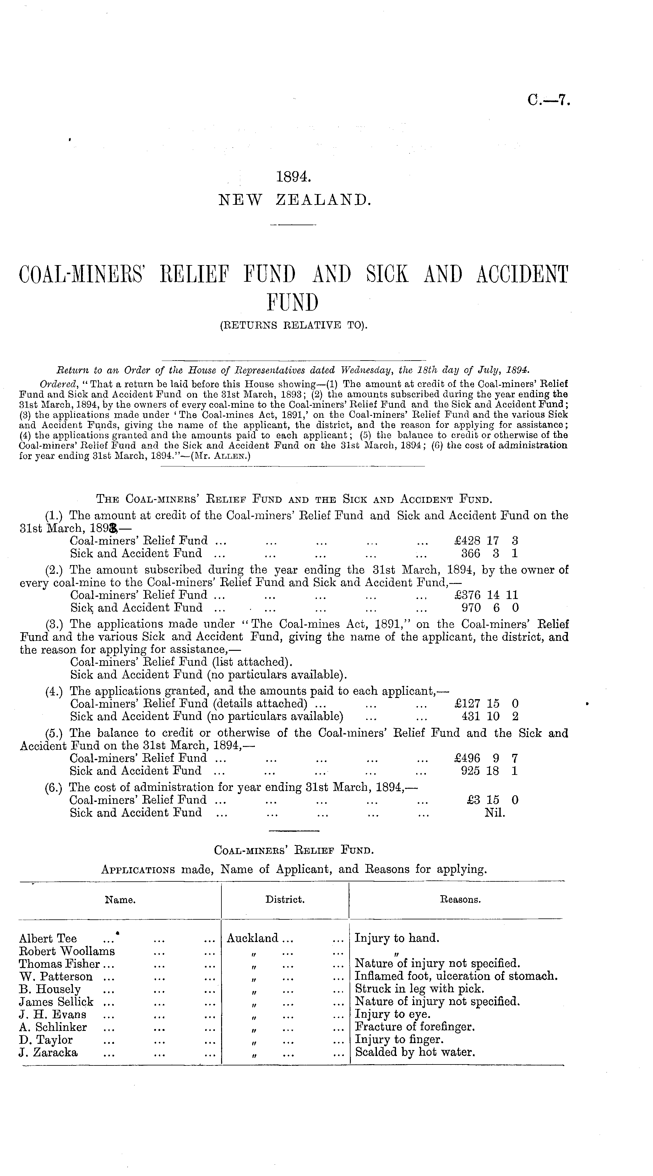 Return to an Order of the House of Bepresentatives dated Wednesday, the 18th day of July, 1894. Ordered, " That a return be laid before this House showing—(l) The amount at credit of the Coal-miners' Relief Fund and Sick and Accident Fund on the 31st March, 1893; (2) the amounts subscribed during the year ending the 31st March, 1894, by the owners of every coal-mine to the Coal-miners' Relief Fund and the Sick and Accident Fund; (3) the applications made under ' The Coal-mines Act, 1891,' on the Coal-miners' Relief Fund and the various Sick and Accident Funds, giving the name of the applicant, the district, and the reason for applying for assistance; (4) the applications granted and the amounts paid to each applicant; (5) the balance to credit or otherwise of the Coal-miners' Relief Fund and the Sick and Accident Fund on the 31st March, 1894; (0) the cost of administration for year ending 31st March, 1894."—(Mr. Allen.)
