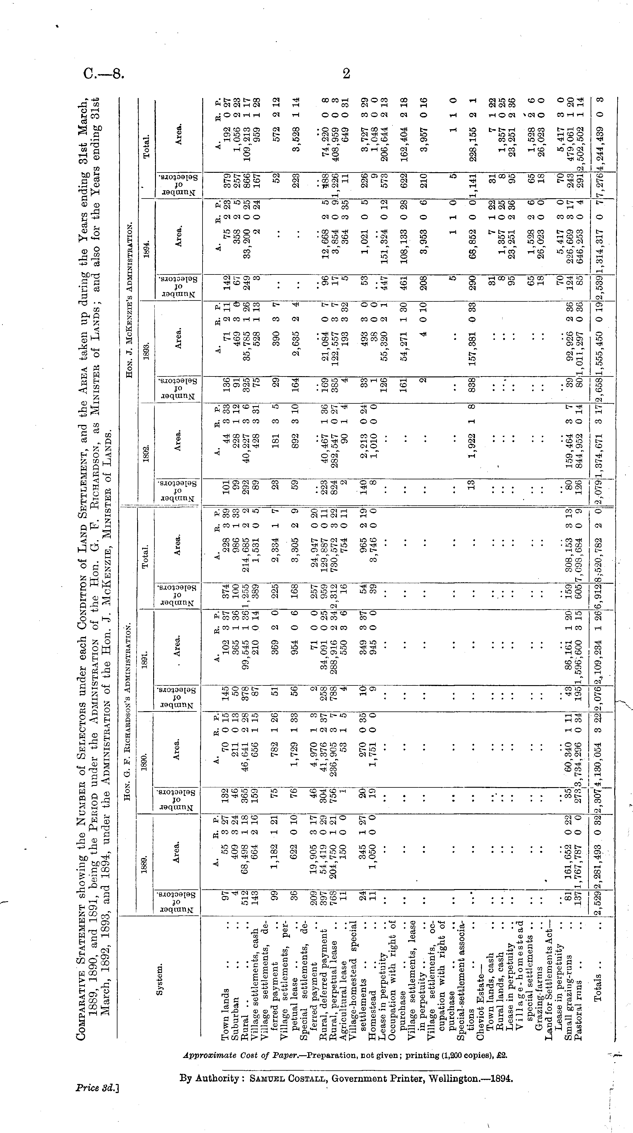Comparative Statement showing the Number of Selectors under each Condition of Land Settlement, and the Area taken up during the Years ending 31st March, 1889, 1890, and 1891, being the Period under the Administration of the Hon. G. F. Richardson, as Minister of Lands; and also for the Years ending 31st March, 1892, 1893, and 1894, under the Administration of the Hon. J. McKenzie, Minister of Lands.
