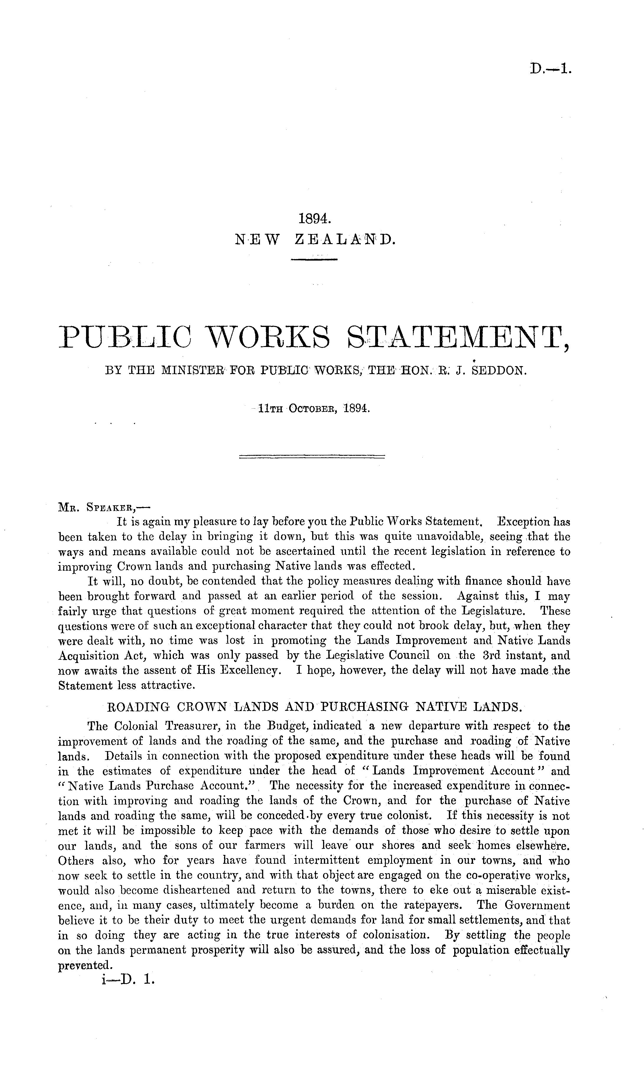 PUBLIC WORKS STATEMENT, BY THE MINISTER FOR PUBLIC WORKS, THE HON. R. J. SEDDON. 11th October, 1894.