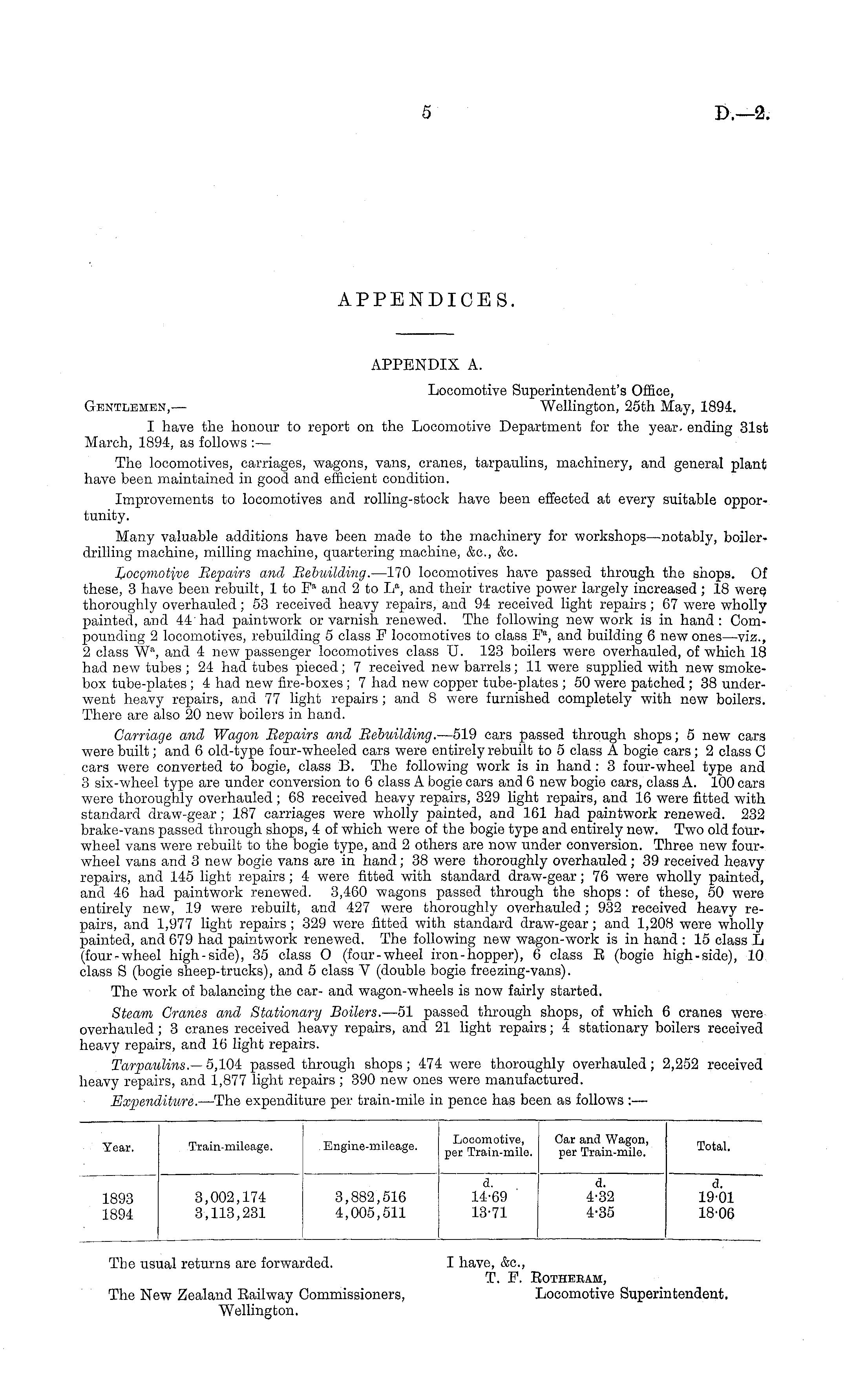 APPENDIX A. Locomotive Superintendent's Office, Gentlemen, — Wellington, 25th May, 1894. I have the honour to report on the Locomotive Department for the year- ending 31st March, 1894, as follows :— The locomotives, carriages, wagons, vans, cranes, tarpaulins, machinery, and general plant have been maintained in good and efficient condition. Improvements to locomotives and rolling-stock have been effected at every suitable opportunity. Many valuable additions have been made to the machinery for workshops—notably, boilerdrilling machine, milling machine, quartering machine, &c, &c. Xiocomotive Bepairs and Bebuilding. —l7o locomotives have passed through the shops. Of these, 3 have been rebuilt, Ito F" and 2to L a , and their tractive power largely increased ; 18 were thoroughly overhauled; 53 received heavy repairs, and 94 received light repairs ; 67 were wholly painted, and 44 had paintwork or varnish renewed. The following new work is in hand: Compounding 2 locomotives, rebuilding 5 class F locomotives to class P a , and building 6 new ones—viz., 2 class W a , and 4 new passenger locomotives class U. 123 boilers were overhauled, of which 18 had new tubes ; 24 had tubes pieced; 7 received new barrels; 11 were supplied with new smokebox tube-plates; 4 had new fire-boxes; 7 had new copper tube-plates ; 50 were patched ; 38 underwent heavy repairs, and 77 light repairs; and 8 were furnished completely with new boilers. There are also 20 new boilers in hand. Carriage and Wagon Bepairs and Bebuilding. —sl9 cars passed through shops; 5 new cars were built; and 6 old-type four-wheeled cars were entirely rebuilt to 5 class A bogie cars; 2 class C cars were converted to bogie, class B. The following work is in hand : 3 four-wheel type and 3 six-wheel type are under conversion to 6 class A bogie cars and 6 new bogie cars, class A. 100 cars were thoroughly overhauled; 68 received heavy repairs, 329 light repairs, and 16 were fitted with standard draw-gear; 187 carriages were wholly painted, and 161 had paintwork renewed. 232 brake-vans passed through shops, 4of which were of the bogie type and entirely new. Two old four-* wheel vans were rebuilt to the bogie type, and 2 others are now under conversion. Three new fourwheel vans and 3 new bogie vans are in hand; 38 were thoroughly overhauled ; 39 received heavy repairs, and 145 light repairs; 4 were fitted with standard draw-gear; 76 were wholly painted, and 46 had paintwork renewed. 3,460 wagons passed through the shops :of these, 50 were entirely new, 19 were rebuilt, and 427 were thoroughly overhauled; 932 received heavy repairs, and 1,977 light repairs ; 329 were fitted with standard draw-gear ; and 1,208 were wholly painted, and 679 had paintwork renewed. The following new wagon-work is in hand :15 class L (four-wheel high-side), 35 class O (four-wheel iron-hopper), 6 class E (bogie high-side), 10 class S (bogie sheep-trucks), and 5 class V (double bogie freezing-vans). The work of balancing the car- and wagon-wheels is now fairly started. Steam Cranes and Stationary Boilers. —sl passed through shops, of which 6 cranes were overhauled; 3 cranes received heavy repairs, and 21 light repairs; 4 stationary boilers received heavy repairs, and 16 light repairs. Tarpaulins.— 5,104 passed through shops; 474 were thoroughly overhauled; 2,252 received heavy repairs, and 1,877 light repairs ; 390 new ones were manufactured. Expenditure. —The expenditure per train-mile in pence has been as follows : —■
