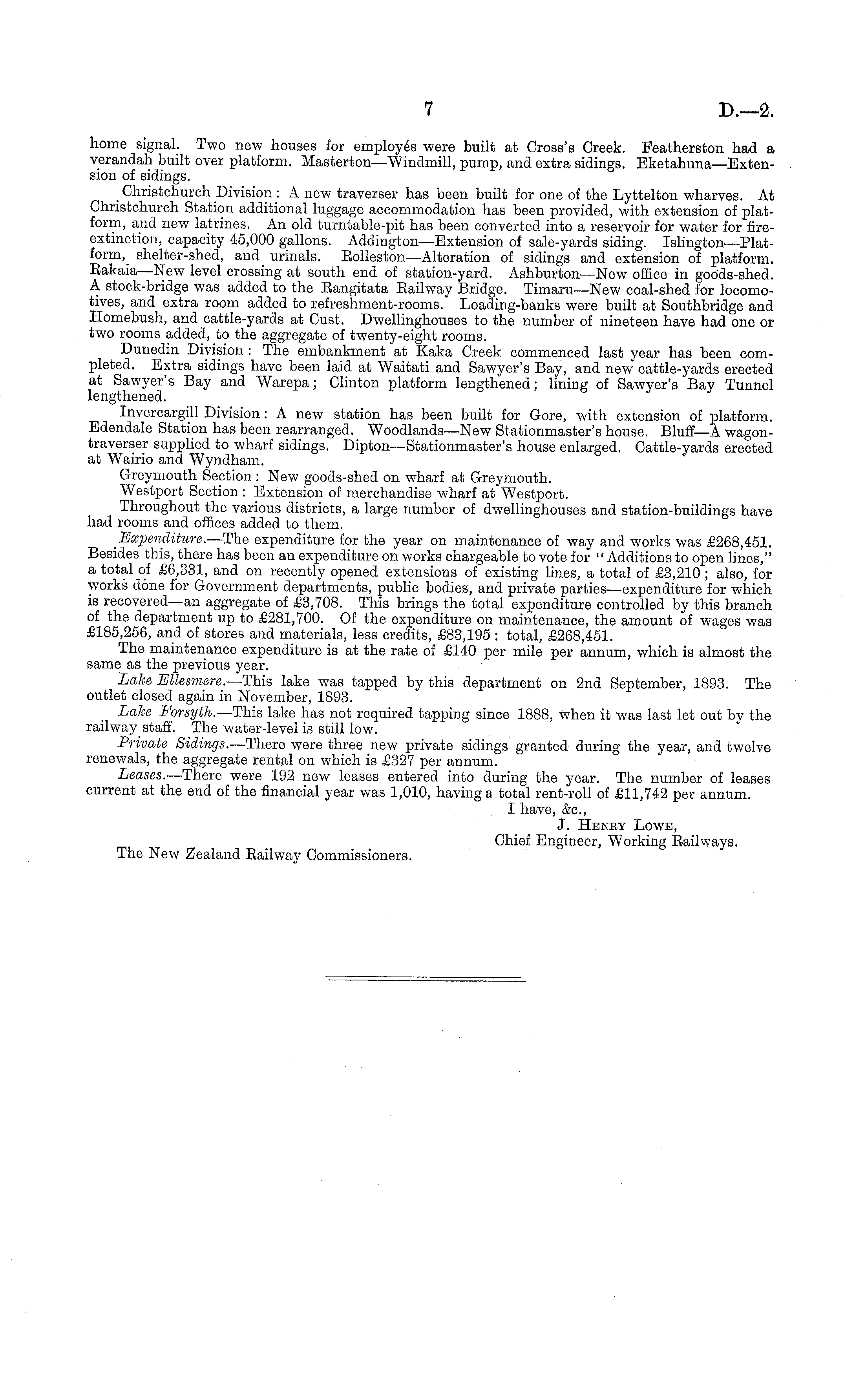 home signal. Two new houses for employes were built at Cross's Creek. Featherston had a verandah built over platform. Masterton—Windmill, pump, and extra sidings. Eketahuna—Extension of sidings. _ Christchurch Division : A new traverser has been built for one of the Lyttelton wharves. At Christchurch Station additional luggage accommodation has been provided, with extension of platform, and new latrines. An old turntable-pit has been converted into a reservoir for water for fireextinction, capacity 45,000 gallons. Addington—Extension of sale-yards siding. Islington—Plat-shelter-shed, and urinals. Eolleston—Alteration of sidings and extension of platform. Eakaia—New level crossing at south end of station-yard. Ashburton—New office in goods-shed. A stock-bridge was added to the Eangitata Eailway Bridge. Timaru—New coal-shed for locomotives, and extra room added to refreshment-rooms. Loading-banks were built at Southbridge and Homebush, and cattle-yards at Cust. Dwellinghouses to the number of nineteen have had one or two rooms added, to the aggregate of twenty-eight rooms. Dunedin Division : The embankment at Kaka Creek commenced last year has been completed. Extra sidings have been laid at Waitati and Sawyer's Bay, and new cattle-yards erected at Sawyer's Bay and Warepa; Clinton platform lengthened; lining of Sawyer's Bay Tunnel lengthened. Invercargill Division: A new station has been built for Gore, with extension of platform. Edendale Station has been rearranged. Woodlands—New Stationmaster's house. Bluff—A wagontraverser supplied to wharf sidings. Dipton—Stationmaster's house enlarged. Cattle-yards erected at Wairio and Wyndham. Greymouth Section : New goods-shed on wharf at Greymouth. Westport Section : Extension of merchandise wharf at Westport. Throughout the various districts, a large number of dwellinghouses and station-buildings have had rooms and offices added to them. Expenditure. —The expenditure for the year on maintenance of way and works was £268,451. Besides this, there has been an expenditure on works chargeable to vote for "Additions to open lines," a total of £6,331, and on recently opened extensions of existing lines, a total of £3,210; also, for works done for Government departments, public bodies, and private parties—expenditure for which is recovered—an aggregate of £3,708. This brings the total expenditure controlled by this branch of the department up to £281,700. Of the expenditure on maintenance, the amount of wages was £185,256, and of stores and materials, less credits, £83,195 : total, £268,451. The maintenance expenditure is at the rate of £140 per mile per annum, which is almost the same as the previous year. Lake Ellesmere.— This lake was tapped by this department on 2nd September, 1893. The outlet closed again in November, 1893. Lake Forsyth.— This lake has not required tapping since 1888, when it was last let out by the railway staff. The water-level is still low. Private Sidings. —There were three new private sidings granted during the year, and twelve renewals, the aggregate rental on which is £327 per annum. Leases.— There were 192 new leases entered into during the year. The number of leases current at the end of the financial year was 1,010, having a total rent-roll of £11,742 per annum. I have, &c, J. Henby Lowe, Chief Engineer, Working Eailways. The New Zealand Eailway Commissioners.
