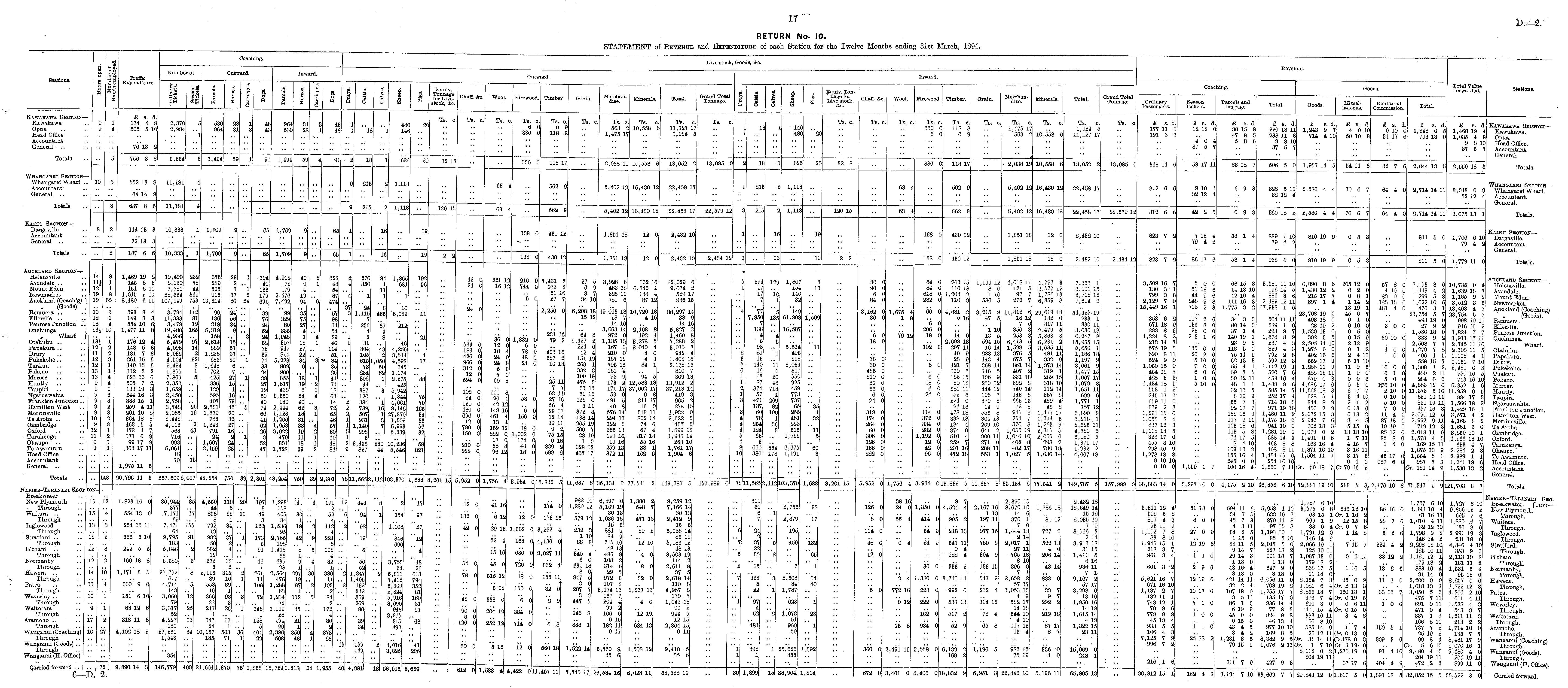 Coaching. Stations. a a o o tu of (3 *& a ® a to *■$ u Traffic Expenditure. Number of Outward. Inwt A Outward. Live-stock, Goods, &c. Inward. Revenue. ■O-H 8* go cog Pk o H 3 o R iii <a Pk o in S O o a 6 O ft 8 3 m Equiv. gj. Tonnage 2 for Livestock, &c. I Chaff, &e. j "Wool. I Firewood. Timber Grain. Merchandise. Total. Grand Total Tonnage. I l i p 8 6 ft © So DQ M Equiv. Tonnage for Live-stock, &c. Firewood. Timber. Grain. ***£*£*' Minerals. Total. Grand Total Tonnage. Ordinary Passengers. Season Tickets. Coaching. Parcels and Luggage. Goods. Total Value forwarded. Stations. Minerals. Chaff, &o. Wool. Total. Goods Miscellaneous. Rents and Commission. Total. W~ w Kawakawa Section — Kawakawa Opua Head Office Accountant General 9 9 1 4 £ s. a. 174 4 8 505 6 10 2,370 2,984 1 530 964 28 81 1 8 48 43 96? 53( 81 28 3 1 43 48 1 1 "l8 "l 480 146 20 Ts. 0. Ts. c. Ts. 0. Ts. c. 6 0 3S0 0 Ts. 0. 0 9 118 8 Ts. c. Ts. c. 563 2 1,475 17 Ts. c. 10,558 6 Ts. c. 11,127 17 1,924 5 Ts. 0. 1 1 1! 1461 480 ( "20 Ts. c. Ts. 0. Ts. 0. Ts. 0. SS0 0 6 0 Ts. c. 118 8 0 9 Ts. c. Ts. c. 1,475 17 503 2 Ts. 0. 10,558 6 Ts. c. 1,924 5 11,127 17 Ts. c. £ s. d. 177 11 3 191 3 3 £ s. d. 12 12 0 £ s. d. 30 15 8 47 8 5 5 8 6 £ s. d. 220 18 11 238 11 8 9 8 10 87 5 7 £ s. d. 1,243 9 7 714 4 10 £ s. a. 4 0 10 50 10 8 £ s. a. 0 10 0 31 17 6 £ s. a. 1,248 0 5 795 13 0 £ s. d. 1,468 19 4 1,035 4 8 9 8 10 37 5 7j Kawakawa Section— Kawakawa. Opua. Head Office. Accountant. General. 76 13 2 4 0 4 37 6 7 •■ •• ■• Totals 756 3 8 5,35. 1,494 69 91 1,494 59 91, 18 626 32 18 •■ •• 336 118 17 2,038 19 10,558 6 13,052 2 13,085 0 18 626 20 32 18 336 118 17 ■ 2,038 19 10,558 6 13,052 2 13,085 0 368 14 6 53 17 11 88 12 7 506 5 1,957 14 5 54 11 32 7 6 2,044 13 5 2,550 18 5 Totals. Whangabei Section— Whangarei Wharf .. Accountant General 10 8 652 13 8 11,181 215 2 1,113 5,402 12 Whangabei Section— Whangarei Wharf. Accountant. 84 14 9 637 8 5 63 4 562 9 16,430 1! 22,458 1' 9 215 2 1,113 63 4 562 9 5,402 12 16,430 ll 22,458 I 1 312 6 6 9 10 1 32 12 4 6 9 3 328 5 10 32 12 4 2,580 4 4 70 6 7 64 4 0 2,714 14 11 3,043 0 9 32 12 4 Totals 11,181 4 215 1,113; 120 15 63 4 562 9 5,402 12 16,430 12 22,458 171 22,579 12 21; 1,11; 120 15 63 562 9 5,402 12 16,430 1! 22,458 17 22,579 12 312 6 6 42 2 5 6 9 3 360 18 2 2,580 4 4 70 6 7 64 4 0 2,714 14 11 3,075 13 lj Totals. Kaihu Section— Dargaville Accountant General 8 2 114 13 3 10,333 1 1,709 65 1,709 9 65 1 II 1! Kaihu Section— Dargaville. Accountant. General, 72*13 3 138 430 l: 1,851 11 12 0 2,432 10 1 11 19 138 0 430 12 1,851 18 12 0 2,432 10 823 7 2 7 13 4 79 4 2 58 1 4 889 1 10 79 4 2 810 19 9 0 5 3 811 5 1,700 6 10 79 4 2 Totals 187 6 6 10,333 1 1,709 60 1,70! 65 16 19 2 2 138 0 430 12 1,851 18 12 2,432 11 2,434 12 16 19 2 2 138 0 430 12 1,851 18 12 0 2,432 10 2,434 12 823 7 2 86 17 6 58 1 4 968 6 0 810 19 9 0 5 3 811 5 0 1,779 11 0 1 Totals. Auckland Section— Helensville Avondale Mount Eden Newmarket Auckland (Coach'g) ) (Goods) J Remuera Ellerslie .. .. Penrose Junction .. Onehunga I Wharf j OtaTiuhu Papakura Drury Pukekohe Tuakau Pokeno .. - .. Mercer Huntly Taupiri Ngaruawahia Frankton Junction .. Hamilton West Morrinsville Te Aroha Cambridge Oxford Tarukenga Ohaupo Te Awamutu Head Office Accountant G eneral 14 Hi 12 19 19 19 12 18 16j 13§ 12 11 12 12 13 13 9 9 9 9 9 9 10 9 12 11 9 9 8 1 1 8 66 3 1 4 10 1 2 2 3 1 1 4 4 1 8 8 2 3 2 3 1 S 1 3 1,469 19 2 145 8 3 161 6 10 1,015 9 10 8,480 6 11 393 8 4 149 8 3 654 10 6 1,477 11 8 176 12 4 148 5 8 131 7 8 261 15 6 149 15 6 112 3 2 623 16 6 505 7 2 133 19 3 244 16 3 383 15 1 259 4 11 201 10 2 364 18 8 463 15 5 172 4 7 171 6 9 99 17 9 868 17 11 19,490 2,130 7,781 28,634 107,449 3,794 11,333 8,479 19,480 4,936 5,479 4,096 3,032 4,504 2,424 1,855 7,869 2,352 1,658 2,450 2,758 3,748 2,905 2,442 4,113 563 716 993 6,061 15 10 232 72 44 369 763 112 81 19 165 97 14 2 22 376 289 595 915 19,314 96 136 218 5,319 158 2,614 889 1,236 685 1,648 702 425 336 129 695 407 2,781 1,779 788 1,243 791 24 1,607 2,159 29 2 3 37 80 24 66 34 9 16 61 37 29 1 1 2 24 "3 "l 194 40 133 179 691 39 76 24 52 24 52 73 39 74 33 24 38 27 19 59 40 74 66 41 62 26 4,912 72 179 2,476 7,492 "99 329 80 385 1,946 307 947 814 6,228 809 900 855 1,617 430 5,550 180 2,444 1,123 1,200 1,953 3,022 470 801 1,728 1 18l 271 22 34 6 40 9 4 19 94 85 76 27 "6 1 "3 328 48 64 87 474 67 98 14 641 89 40 114 61 84 35 25 41 71 18 63 14 72 65 46 57 60 10 48 84 '37 3 "l 1 3 4 31 304 106 615 73 234 302 44 387 120 384 789 507 931 1,140 298 3 2,466 827 276 350 1 24 1,115 7 236 i 34 ) 1 11 1 ■ **8 • 465 1 67 4 8 *43 9 2 1,050 50 62 1 1,865 681 1 "lO 6,089 *212 46 4,256 3,514 4,598 345 1,174 2,275 425 5,942 1,844 4,661 8,146 27,370 1,302 6,993 5,839 192 56 "ll "21 4 17 42 0 24 0 24 0 564 0 186 0 426 0 966 0 312 0 12 0 594 0 221 12 16 12 36 0 12 0 18 4 24 0 24 8 5 0 7 0 60 8 216 0 744 0 *6 0 1,332 0 6 0 78 0 48 0 24 0 7,431 7 973 2 61 16 27 7 2,250 0 231 16 79 2 403 16 587 2 10 13 27 5 6 9 3 7 34 10 6,208 18 15 12 64 8 1,427 2 ' 224 0 42 4 151 19 268 1 332 3 100 19 475 3 31 13 79 16 132 0 3 11 872 8 138 14 205 19 500 7 23 10 1 0 328 13 437 17 3,928 6 463 18 326 10 781 6 19,093 18 18 7 14 16 3,663 14 972 0 1,135 13 167 3 210 0 167 12 795 12 161 4 95 9 173 2 171 17 63 0 491 5 40 8 576 14 294 17 122 6 365 13 197 16 19 16 259 13 372 11 162 16 6,846 1 138 4 87 12 10,720 18 4 10 2,163 8 192 4 3,278 5 2,040 4 4 0 4 3 84 1 I I I 1 12,029 6 9,074 2 529 17 936 15 38,297 14 38 9 14 16 5,827 2 1,460 8 7,288 2 3,013 7 942 4 1,408 16 2,172 15 810 7 309 13 13,912 2 37,218 14 419 3 965 2 278 15 1,932 0 2,622 3 467 6 1,899 18 1,988 14 268 10 1,761 17 1,904 8 5 1 4 2 3 7 6 1 1 2 1 3 394 17 17 7 1 "77 7,850 7 138 4 5 98 21 13 140 16 IS 87 374 57 471 187 60: 78 254 124 63 3 660 380 129 'io 1 5 135 4 5 "l 11 1 20 48 718 1 269 82 100 1 36 3 1,807 154 140 32 'i49 61,308 16,' 587 5,514 495 292 2,034 307 550 925 459 773 737 05 255 461 223 515 1,722 3 13 1*509 "ll 30 0 00 0 6 0 84 0 3,162 0 3