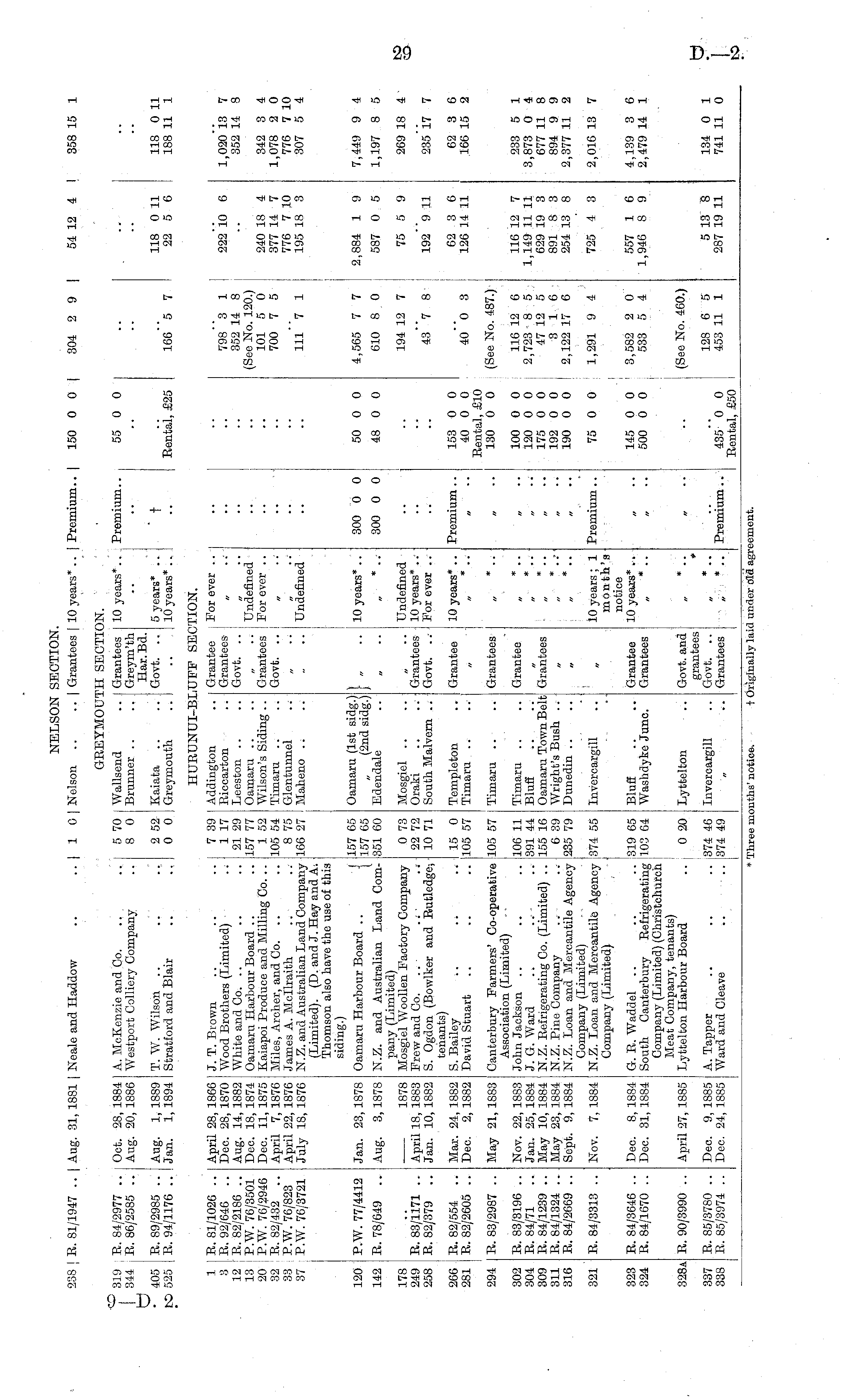 DJ1JU11U11. ;38 I R. 81/1947 .. | Aug. 31, 1881 | Neale and Haddow .. . .| 1 0 | Nelson .. .. | Grantees | 10 years* .. | Premium.. | 150 0 0 | 304 2 9 | 54 12 4 | 358 15 : H9 ; R. 84/2977 .. 144 E. 86/2585 .. .05 E. 89/2985 .. .25 E. 94/1176 .. GEEYMOUTH SECTION. Oct. 28,1884 A. McKenzie and Co. ... .. | 5 70 Wallsend .. Grantees 10 years*.. Premium.. 55 0 0 Aug. 20, 1886 Westport Colliery Company .. 8 0 Brunner .. .. Greym'th Har. Bd. Aug. 1, 1889 T. W. Wilson .. .. " .. 2 52 Kaiata .. .. Govt. .. 5 years* t Jan. 1,1894 Stratford and Blair .. .. 0 0 Greymouth .. .. 10 years*.. .. Rental, £25 166 5 7 118 0 11 22 5 6 118 0 l: 188 11 : 1 | E. 81/1026 .. 3 I E. 92/646 .. 12 ]' E. 82/2186 .. 13 ! P.W. 76/3501 20 ; P.W. 76/2946 32 E. 82/432 .. 33 P.W. 76/823 37 P.W. 76/3721 HUBUNUI-BLUFF SECTION. 120 | 142 178 249 258 266 j 281 .20 P.W. 77/4412 .42 E. 78/649 .. j .78 !49 E. 83/1171 .. !58 E. 82/379 .. !66 j E. 82/554 .. | !81 R. 82/2605 .. April 28, 1866 J. T. Brown .. .. .. 7 39 Addington .. Grantee For ever .. .. .. .. j Dec. 28, 1870 Wood Brothers (Limited) . .■ ■ 117 Eiccarton .. Grantees , .. .. .. 798 3 1 Aug. 14, 1882 White and Co. .. .. .. 21 29 Leeston .. .. Govt. .. „ .. .. .. 352 14 8 Dec. 18, 1874 Oamaru Harbour Board .. .. 157 77 Oamaru .. .. „ .. i Undefined .. .. (See No. 120.) Dec. 11, 1875 Kaiapoi Produce and Milling Co. .. 1 52 Wilson's Siding .. Grantees j For ever .. .. .. 101 5 0 April 7, 1876 Miles, Archer, and Co. .. .. 105 54 Timaru .. .. Govt. .. „ .. .. .. 700 7 5 April 22, 1876 James A. Mcllraith .. .. 8 75 Glentunnel ..„..!„ July 18,1876 N.Z. and Australian Land Company 166 27 Maheno \ Undefined .. .. Ill 7 1 | (Limited). (D. and J. Hay and A. Thomson also have the use of this siding.) Jan. 23,1878 Oamaru Harbour Board .. {157 65 ° BX^" X } " " 10 y ears * •• 300 0 0 50 0 0 4,565 7 7 Aug. 3, 1878 N.Z. and Australian Land Com- 351 60 Edendale „ * .. 300 0 0 48 0 0 610 8 0 pany (Limited) 1878 Mosgiel Woollen Factory Company 0 73 Mosgiel .. .. „ .. Undefined .. .. 194 12 7 i April 18, 1883 Frew and Co. .. . , • .i 22 72 Oraki .. .. Grantees 10 years* Jan. 10, 1882 S. Ogdon (Bowlker and Rutledge, 10 71 South Malvern .. ■ Govt. . .■ For ever .. .. .. 43 7 8 tenants) Mar. 24, 1882 S. Bailev .. .. .. 15 0 Templeton .. Grantee j 10 years* .. Premium .. 153 0 0 Dec. 2,1882 David Stuart .. .. ..105 57 Timaru .. ... „ „ *.. „ 40 0 0 40 0 3 Eental, £10 May 21, 1883 Canterbury Farmers' Co-operative 105 57 Timaru .. .. Grantees „ „ .. 130 0 0 (See No. 487.) Association (Limited) Nov. 22, 1883 John Jackson .. .. .. 106 11 Timaru .. .. Grantee „ * .. „ .. 100 0 0 116 12 6 Jan. 25,1884 J.G.Ward .. ..- ..39144 Bluff .. .. „ „ *.. ,, .. 120 0 0 2,723 8 5 May 10,1884 N.Z. Refrigerating Co. (Limited) .. 155 16 Oamaru Town Belt Grantees *.. „ .. 175 0 0 47 12 5 May 23, 1884 N.Z. Pine Company .. .. 6 39 Wright's Bush .. „ „*..•■ „ .. 192 0 0 316 Sept. 9,1884 N.Z. Loan and Mercantile Agency 1235 79 Dunedin.. .. „ „ *.. „ .. 190 0 0 2,122 17 6 Company (Limited) > • - ; ... Nov. 7,1884 N.Z. Loan and Mercantile Agency 374 55 Invercargill .. „ 10 years; 1 Premium.. 75 0 0 1,291 9 4 Company (Limited) month's notice Dec. 8,1884 G. R. Waddel .. .. ..319 65 Bluff .. .. Grantee 10 years*.. „ .. 145 0 0 3,582 2 0 Dec. 31, 1884 South Canterbury Refrigerating 103 64 Washdyke June. Grantees „ * .. „ .. 500 0 0 533 5 4 Company (Limited) (Christchurch .;.'..] Meat Company, tenants) April 27, 1885 Lyttelton Harbour Board .. 0 20 Lyttelton .. Govt, and „ * .. „ .. ■■ (See No. 460.) grantees Dec. 9,1885 A. Tapper .. .. ..374 46 Invercargill .. Govt. .. *.. .. .. 128 6 5 Dec. 24,1885 Ward and Cleave .. ..374 49 „ .. Grantees „ *.. Premium.. 435 0 0 453 11 1 Rental, £50 Grantees Govt. .. Grantee 222*10 6 240 18 4 377 14 7 776 7 10 195 18 3 2,884 1 9 587 0 5 75 5 9 192 9 11 62 3 6 126 14 11 116 12 7 1,149 11 11 629 19 3 891 8 3 254 13 8 725 4 3 557 1 6 1,946 8 9 5 13 8 287 19 11 1,02013 ' 352 14 ! 342 3 < 1,078 2 ( 776 7 K 307 5 < 7,449 9 ■ 1,197 8 ! 269 18 j 235 17 ' 62 3 I 166 15 : 233 5 : 3,873 0 ( 677 11 i 894 9 ! 2,377 11 ; 2,016 13 ' 4,139 3 I 2,479 14 : 134 0 : 741 11 ( 294 !94 [ E. 83/2987 .. Grantees 302 304 309 311 316 S02 E. 83/3196 .. i04 E. 84/71 509 E. 84/1239 .. ill E. 84/1324 .. 516 E. 84/2669 .. Grantee Grantees 321 521 R. 84/3313 .. 323 324 )23 R. 84/3646 .. 124 R. 84/1670 .. Grantee Grantees 328a S28a E. 90/3990 .. Govt, and grantees Govt. .. Grantees 337 338 537 E. 85/3780 .. 138 E. 85/3974 .. * Three months' notice. t Originally laid under old agreement.