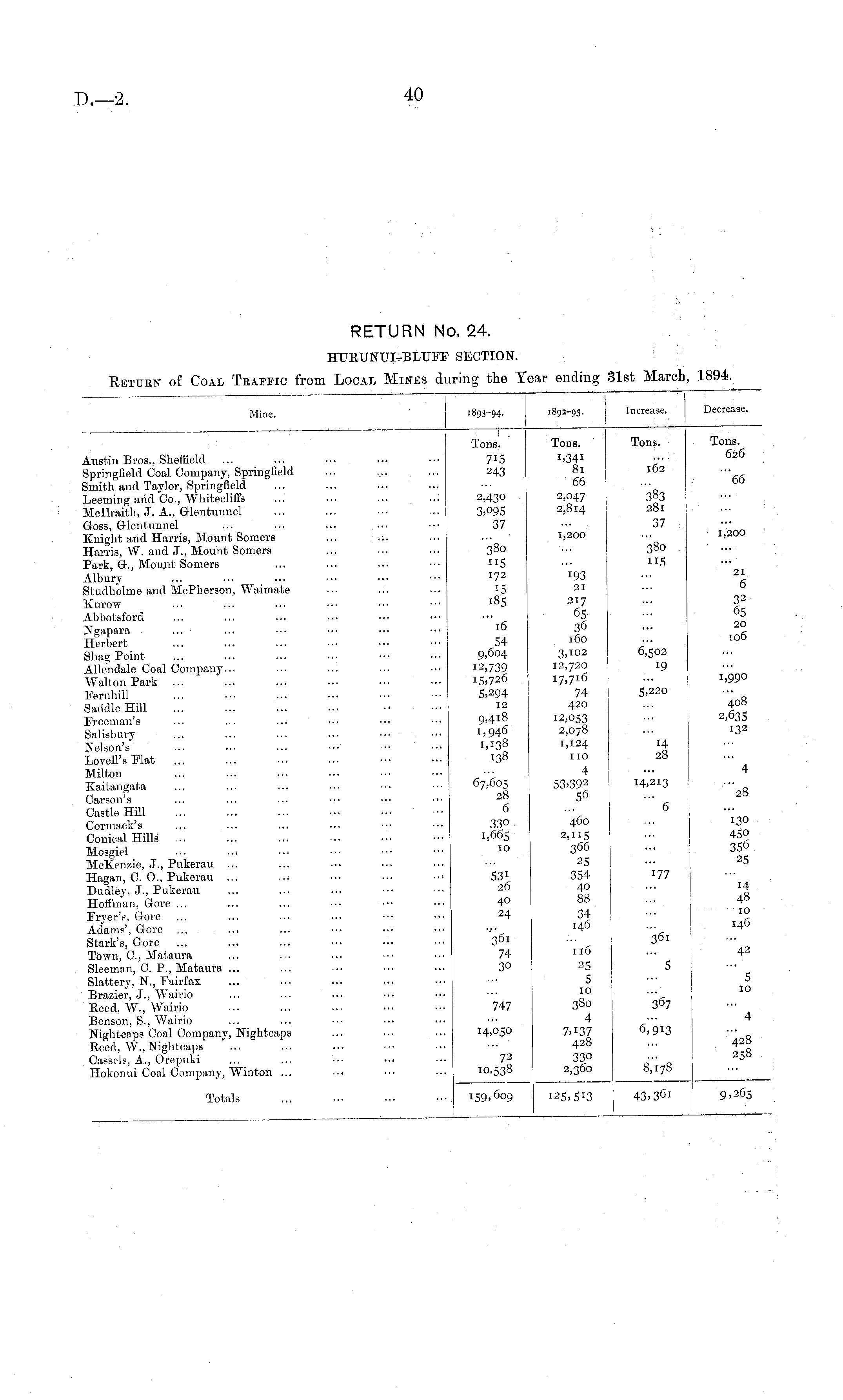 RETURN No. 24. HURUNUI-BLUFF SECTION. Return of Coal Traffic from Local Mines during the Year ending 31st March, 1894.