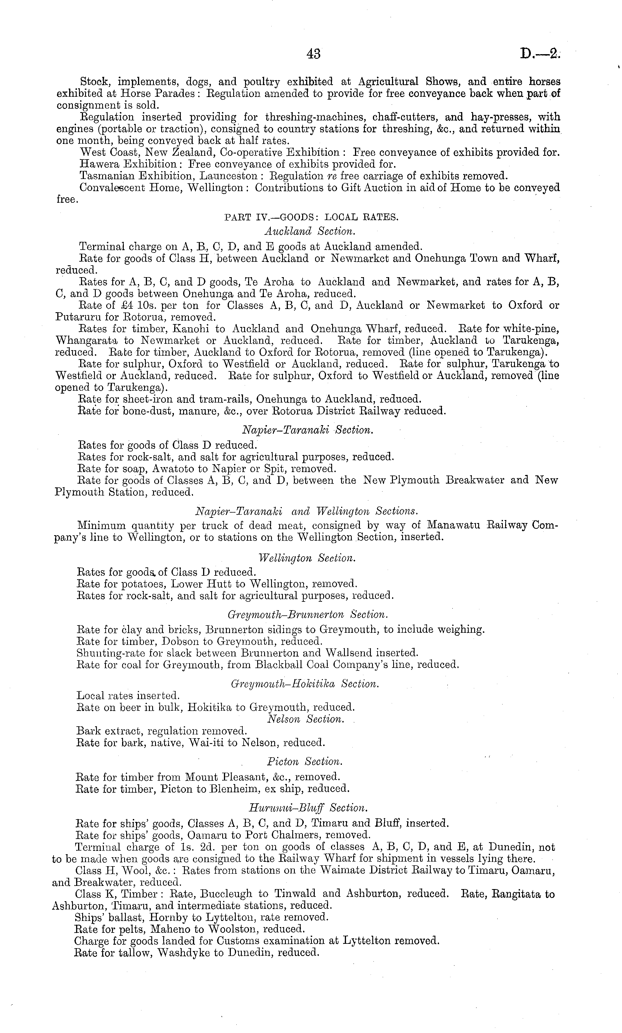 Stock, implements, clogs, and poultry exhibited at Agricultural Shows, and entire horses exhibited at Horse Parades : Regulation amended to provide for free conveyance back when part of consignment is sold. Regulation inserted providing for threshing-machines, chaff-cutters, and hay-presses, with engines (portable or traction), consigned to country stations for threshing, &c, and returned within one month, being conveyed back at half rates. West Coast, New Zealand, Co-operative Exhibition : Free conveyance of exhibits provided for. Hawera Exhibition: Free conveyance of exhibits provided for. Tasmanian Exhibition, Launceston : Regulation re free carriage of exhibits removed. Convalescent Home, Wellington : Contributions to Gift Auction in aid of Home to be conveyed free. PART IV.—GOODS: LOCAL RATES. Auckland Section. Terminal charge on A, 8,, C, D, and E goods at Auckland amended. Rate for goods of Class H, between Auckland or Newmarket and Onehunga Town and Wharf, reduced. Rates for A, B, C, and D goods, Te Aroha to Auckland and Newmarket, and rates for A, B, C, and D goods between Onehunga and Te Aroha, reduced. Rate of £4 10s. per ton for Classes A, B, C, and D, Auckland or Newmarket to Oxford or Putaruru for Rotorua, removed. Rates for timber, Kanohi to Auckland and Onehunga Wharf, reduced. Rate for white-pine, Whangarata to Newmarket or Auckland, reduced. Rate for timber, Auckland to Tarukenga, reduced. Rate for timber, Auckland to Oxford for Rotorua, removed (line opened to Tarukenga). Rate for sulphur, Oxford to Westfield or Auckland, reduced. Rate for sulphur, Tarukenga to Westfield or Auckland, reduced. Rate for sulphur, Oxford to Westfield or Auckland, removed (line opened to Tarukenga). Rate for sheet-iron and tram-rails, Onehunga to Auckland, reduced. Rate for bone-dust, manure, &c, over Rotorua District Railway reduced. Napier-Taranaki Section. Rates for goods of Class D reduced. Rates for rock-salt, and salt for agricultural purposes, reduced. Rate for soap, Awatoto to Napier or Spit, removed. Rate for goods of Classes A, B, C, and D, between the New Plymouth Breakwater and New Plymouth Station, reduced. Napier-Taranaki and Wellington Sections. Minimum quantity per truck of dead meat, consigned by way of Manawatu Railway Company's line to Wellington, or to stations on the Wellington Section, inserted. Wellington Section. Rates for goods, of Class D reduced. Rate for potatoes, Lower Hutt to Wellington, removed. Rates for rock-salt, and salt for agricultural purposes, reduced. Greymouth-Brunnerton Section. Rate for clay and bricks, Brunnerton sidings to Greymouth, to include weighing. Rate for timber, Dobson to Greymouth, reduced. Shuuting-rate for slack between Brunnerton and Wallsend inserted. Rate for coal for Greymouth, from Blackball Coal Company's line, reduced. Greymouth-Hokitika Section. Local rates inserted. Rate on beer in bulk, Hokitika to Greymouth, reduced. Nelson Section. Bark extract, regulation removed. Rate for bark, native, Wai-iti to Nelson, reduced. Picton Section. Rate for timber from Mount Pleasant, &c, removed. Rate for timber, Picton to Blenheim, ex ship, reduced. Hitrunuir-Bluff Section. Rate for ships' goods, Classes A, B, C, and D, Timaru and Bluff, inserted. Rate for ships' goods, Oamaru to Port Chalmers, removed. Terminal charge of Is. 2d. per ton on goods of classes A, B, C, D, and E, at Dunedin, not to be made when goods are consigned to the Railway Wharf for shipment in vessels lying there. Class H, Wool, &c.: Rates from stations on the Waimate District Railway to Timaru, Oamaru, and Breakwater, reduced. Class X, Timber : Rate, Buccleugh to Tinwald and Ashburton, reduced. Rate, Rangitata to Ashburton, Timaru, and intermediate stations, reduced. Ships' ballast, Hornby to Lyttelton, rate removed. Rate for pelts, Maheno to Woolston, reduced. Charge for goods landed for Customs examination at Lyttelton removed. Rate for tallow, Washdyke to Dunedin, reduced.