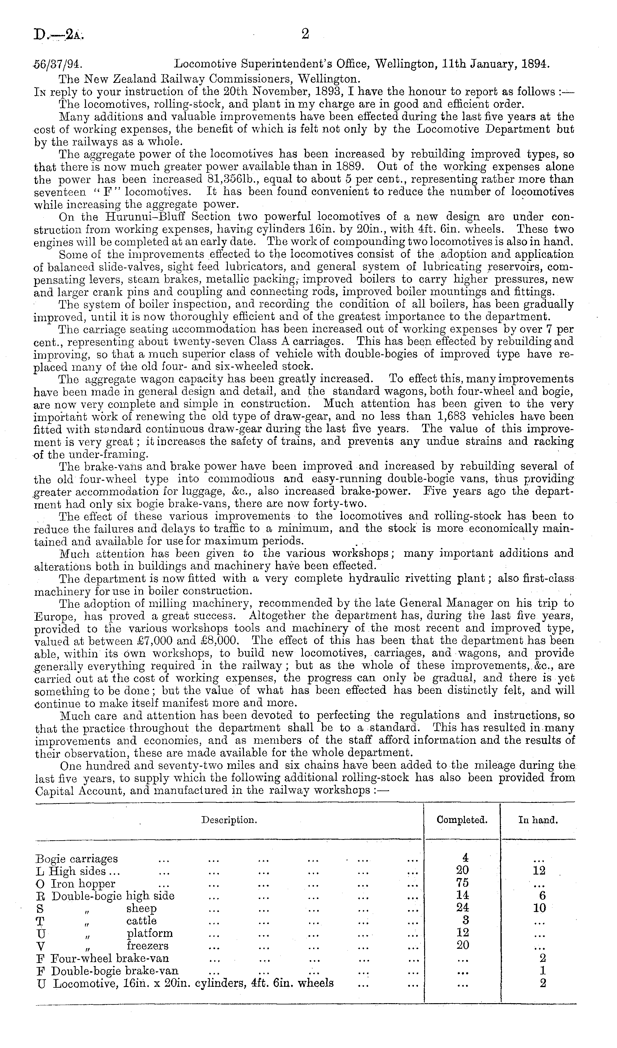 56/37/94. Locomotive Superintendent's Office, Wellington, 11th January, 1894. The New Zealand Bailway Commissioners, Wellington. In reply to your instruction of the 20th November, 1893, I have the honour to report as follows :— The locomotives, rolling-stock, and plant in my charge are in good and efficient order. Many additions and valuable improvements have been effected during the last five years at the cost of working expenses, the benefit of which is felt not only by the Locomotive Department but by the railways as a whole. The aggregate power of the locomotives has been increased by rebuilding improved types, so that there is now much greater power available than in 1889. Out of the working expenses alone the power has been increased 81,3561b., equal to about 5 per cent., representing rather more than seventeen "E " locomotives. It has been found convenient to reduce the number of locomotives while increasing the aggregate power. On the Hurunui-Bluff Section two powerful locomotives of a new design are under construction from working expenses, having cylinders 16in. by 20in., with 4ft. 6in. wheels. These two engines will be completed at an early date. The work of compounding two locomotives is also in hand. Some of the improvements effected to the locomotives consist of the adoption and application of balanced slide-valves, sight feed lubricators, and general system of lubricating reservoirs, compensating levers, steam brakes, metallic packing,- improved boilers to carry higher pressures, new and larger crank pins and coupling and connecting rods, improved boiler mountings and fittings. The system of boiler inspection, and recording the condition of all boilers, has been gradually improved, until it is now thoroughly efficient and of the greatest importance to the department. The carriage seating accommodation has been increased out of working expenses by over 7 percent., representing about twenty-seven Class A carriages. This has been effected by rebuilding and improving, so that a much superior class of vehicle with double-bogies of improved type have replaced many of the old four- and six-wheeled stock. The aggregate wagon capacity has been greatly increased. To effect this, many improvements have been made in general design and detail, and the standard wagons, both four-wheel and bogie, are now very complete and simple in construction. Much attention has been given to the very important work of renewing the old type of draw-gear, and no less than 1,683 vehicles have been fitted with standard continuous draw-gear during the last five years. The value of this improvement is very great; it increases the safety of trains, and prevents any undue strains and racking of the under-framing. The brake-vans and brake power have been improved and increased by rebuilding several of the old four-w T heel type into commodious and easy-running double-bogie vans, thus providing greater accommodation for luggage, &c, also increased brake-power. Eive years ago the department had only six bogie brake-vans, there are now forty-two. The effect Of these various improvements to the locomotives and rolling-stock has been to reduce the failures and delays to traffic to a minimum, and the stock is more economically maintained and available for use for maximum periods. Much attention has been given to the various workshops; many important additions and alterations both in buildings and machinery have been effected. The department is now fitted with a very complete hydraulic rivetting plant; also first-class machinery for use in boiler construction. The adoption of milling machinery, recommended by the late General Manager on his trip to Europe, has proved a great success. Altogether the department has, during the last five years, provided to the various workshops tools and machinery of the most recent and improved type, valued at between £7,000 and £8,000. The effect of this has been that the department has been able, within its Own workshops, to build new locomotives, carriages, and wagons, and provide generally everything required in the railway ; but as the whole of these improvements, &c, are carried out at the cost of working expenses, the progress can only be gradual, and there is yet something to be done; but the value of what has been effected has been distinctly felt, and will Continue to make itself manifest more and more. Much care and attention has been devoted to perfecting the regulations and instructions, so that the practice throughout the department shall be to a standard. This has resulted in many improvements and economies, and as members of the staff afford information and the results of their observation, these are made available for the whole department. One hundred and seventy-two miles and six chains have been added to the mileage during the last five years, to supply which the following additional rolling-stock has also been provided from Capital Account, and manufactured in the railway workshops : —