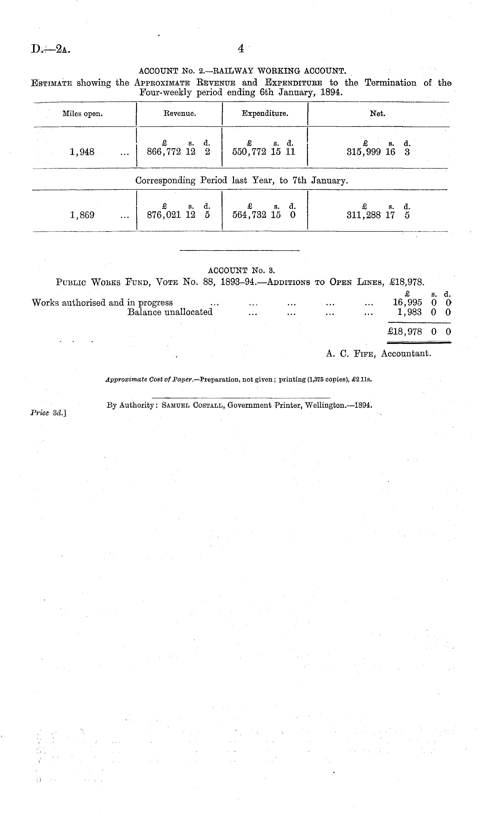 ACCOUNT No. 3. Public Works Fund, Vote No. 88, 1893-94.—Additions to Open Lines, £18,978. £ s. d. Works authorised and in progress ... ... ... ... ... 16,995 0 0 Balance unallocated ... ... ... ... 1,983 0 0 £18,978 0 0 A. C. Fife, Accountant.