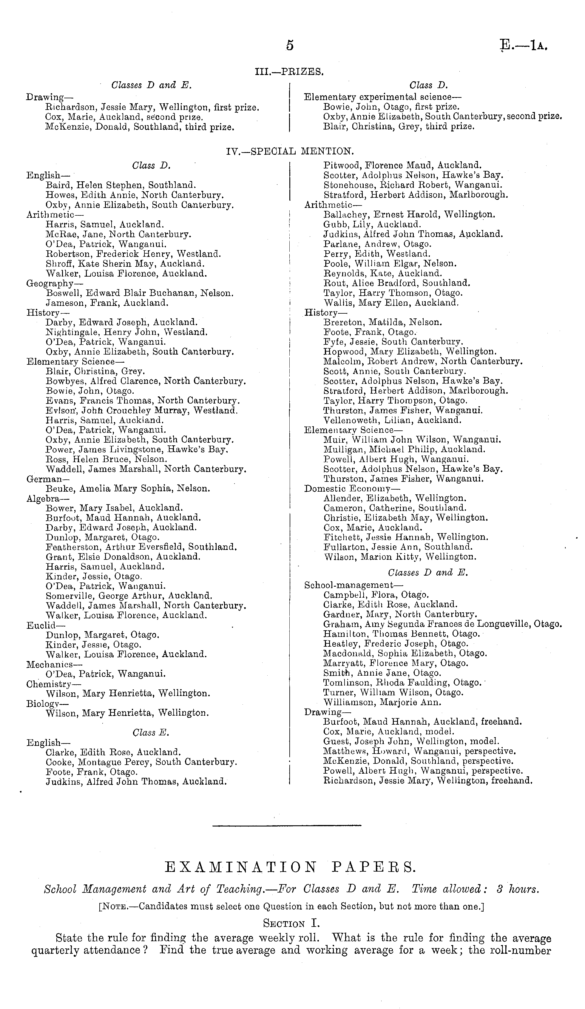 Pitwood, Florence Maud, Auckland. Scotter, Adolphus Nelson, Hawke's Bay. Stonehouse, Richard Robert, Wanganui. Stratford, Herbert Addison, Marlborough. Arithmetic— Ballachey, Ernest Harold, Wellington. Gubb, Lily, Auckland. Judkins, Alfred John Thomas, Auckland. Parlane, Andrew, Otago. Perry, Edith, Westland. Poole, William Elgar, Nelson. Reynolds, Kate, Auckland. Rout, Alice Bradford, Southland. Taylor, Harry Thomson, Otago. Wallis, Mary Ellen, Auckland. History— Brereton, Matilda, Nelson. Foote, Frank, Otago. Fyfe, Jessie, South Canterbury. Hopwood, Mary Elizabeth, Wellington. Malcolm, Robert Andrew, North Canterbury. Scott, Annie, South Canterbury. Scotter, Adolphus Nelson, Hawke's Bay. Stratford, Herbert Addison, Marlborough. Taylor, Harry Thompson, Otago. Thurston, James Fisher, Wanganui. Vellenoweth, Lilian, Auckland. Elementary Science — Muir, William John Wilson, Wanganui. Mulligan, Michael Philip, Auckland. Powell, Albert Hugh, Wanganui. Scotter, Adolphus Nelson, Hawke's Bay. Thurston, James Fisher, Wanganui. Domestic Economy— Allender, Elizabeth, Wellington. Cameron, Catherine, Southland. Christie, Elizabeth May, Wellington. Cox, Marie, Auckland. Fitchett, Jessie Hannah, Wellington. Fullarton, Jessie Ann, Southland. Wilson, Marion Kitty, Wellington. Classes D and E. School-man agemen t— Campbell, Flora, Otago. Clarke, Edith Rose, Auckland. Gardner, Mary, North Canterbury. Graham, Amy Segunda Frances de Longueville, Otago, Hamilton, Thomas Bennett, Otago. Heatley, Frederic Joseph, Otago. Macdouald, Sophia Elizabeth, Otago. Marryatt, Florence Mary, Otago. Smith, Annie Jane, Otago. Tomlinson, Rhoda Faulding, Otago. - Turner, William Wilson, Otago. Williamson, Marjorie Ann. Drawing— Burfoot, Maud Hannah, Auckland, freehand. Cox, Marie, Auckland, model. Guest, Joseph John, Wellington, model. Matthews, Howard, Wanganui, perspective. McKenzie, Donald, Southland, perspective. Powell, Albert Hugh, Wanganui, perspective. Richardson, Jessie Mary, Wellington, freehand.
